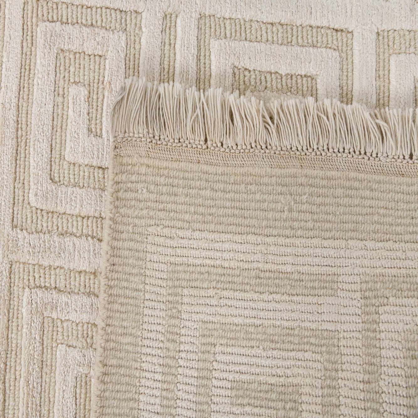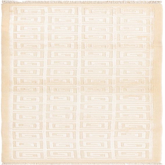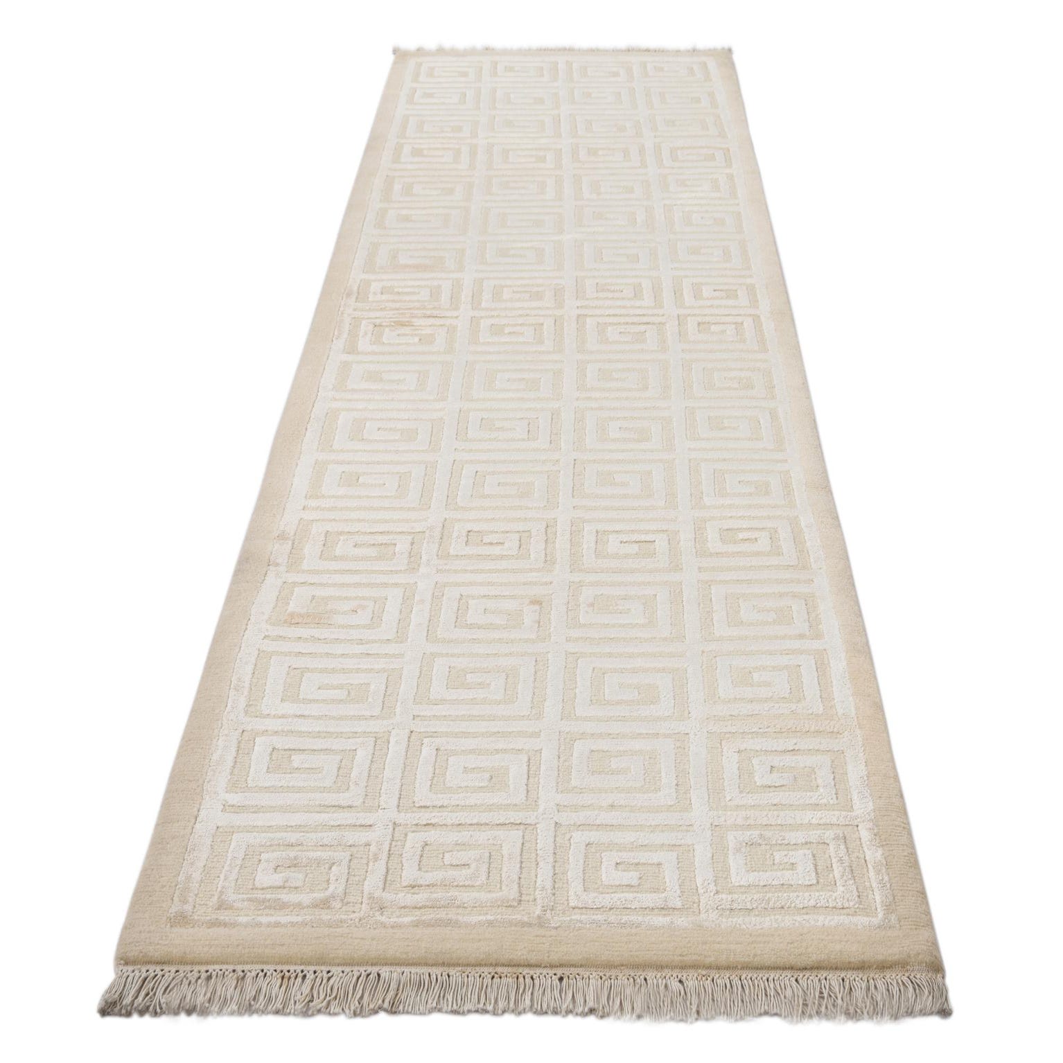 The Darya Collection offers a timeless 10 Ft Runner rug that is hand-knotted from 100% wool, ensuring durability and a tactile comfort underfoot. This piece showcases a well-defined geometric pattern of repeating squares and concentric Greek key motifs. A cohesive palette of light beige, beige, and ivory adds a subtle elegance, with the light beige background providing a serene foundation for the design.
