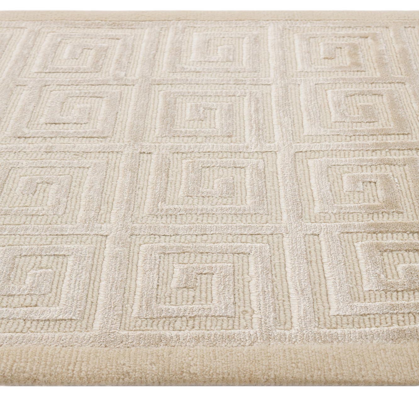 A 10 ft Darya runner rug in ivory and cream, featuring a repeating modern geometric spiral pattern, ideal for a hallway.