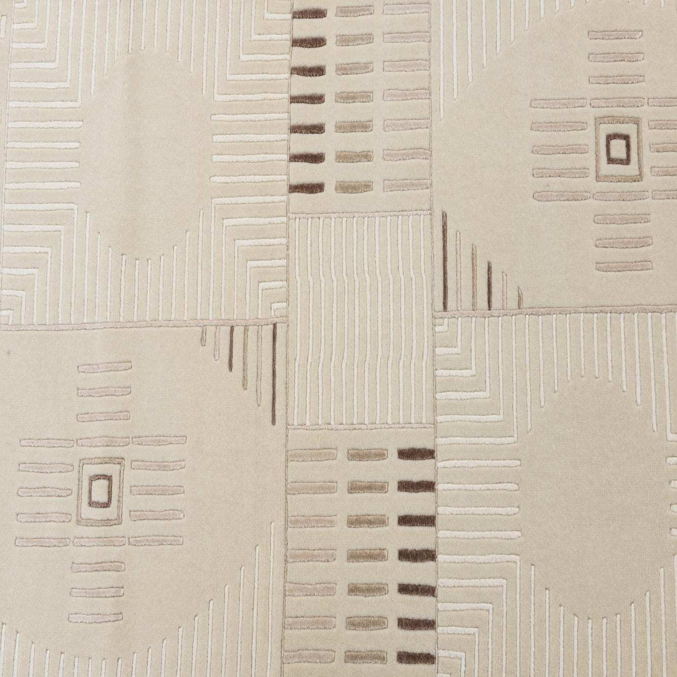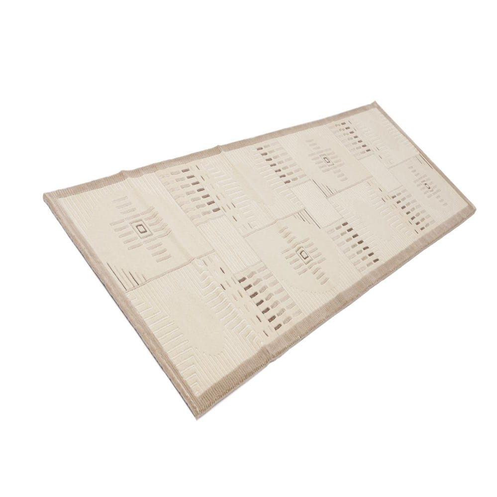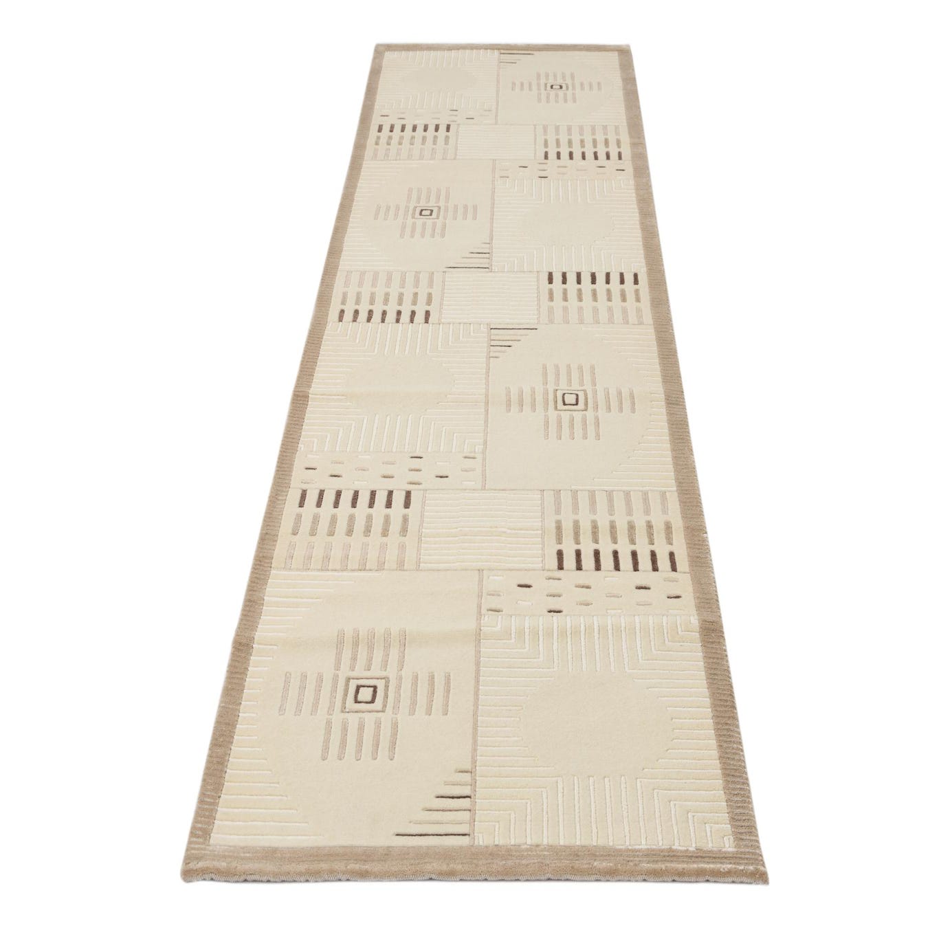 A 10 ft runner rug in ivory and cream with a modern geometric and oriental pattern, featuring raised lines and squares.