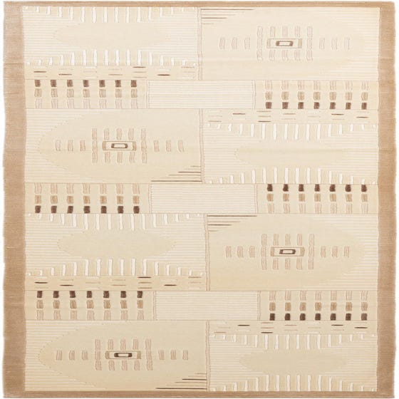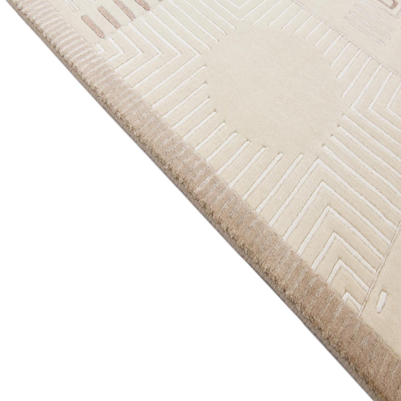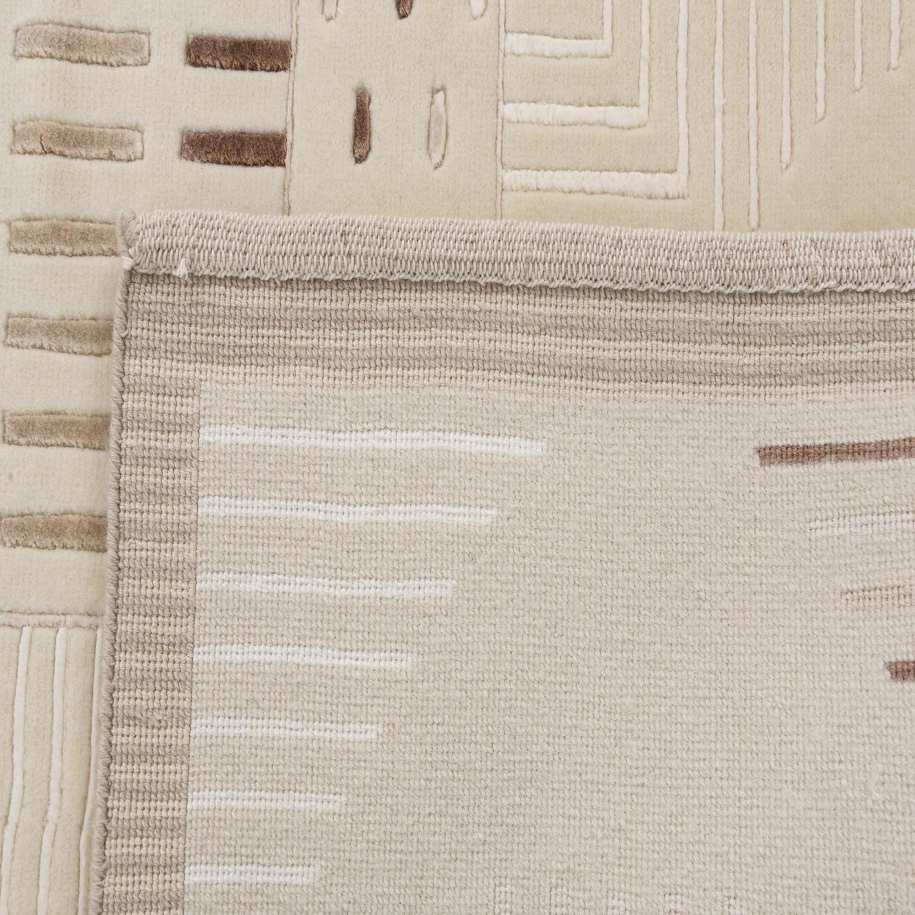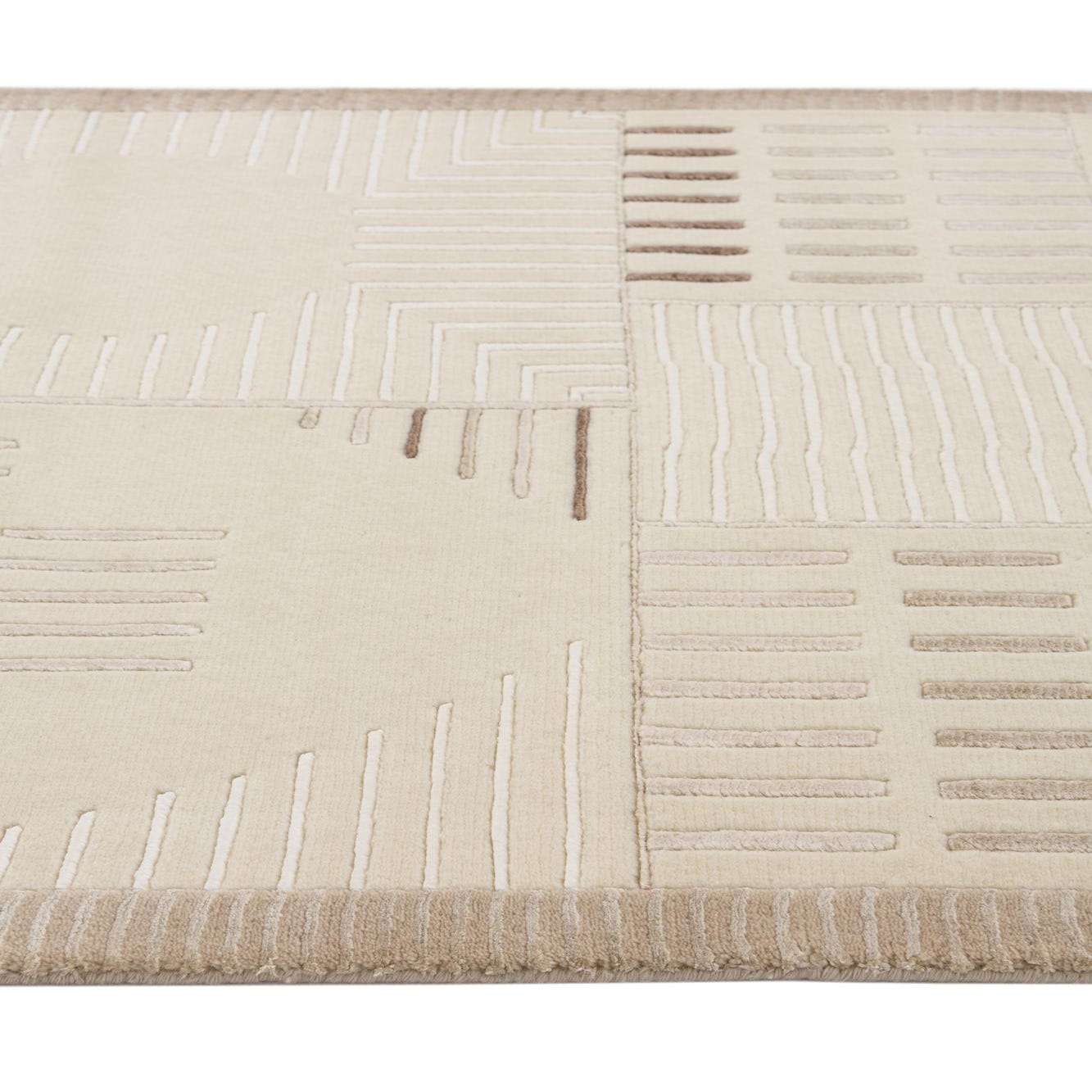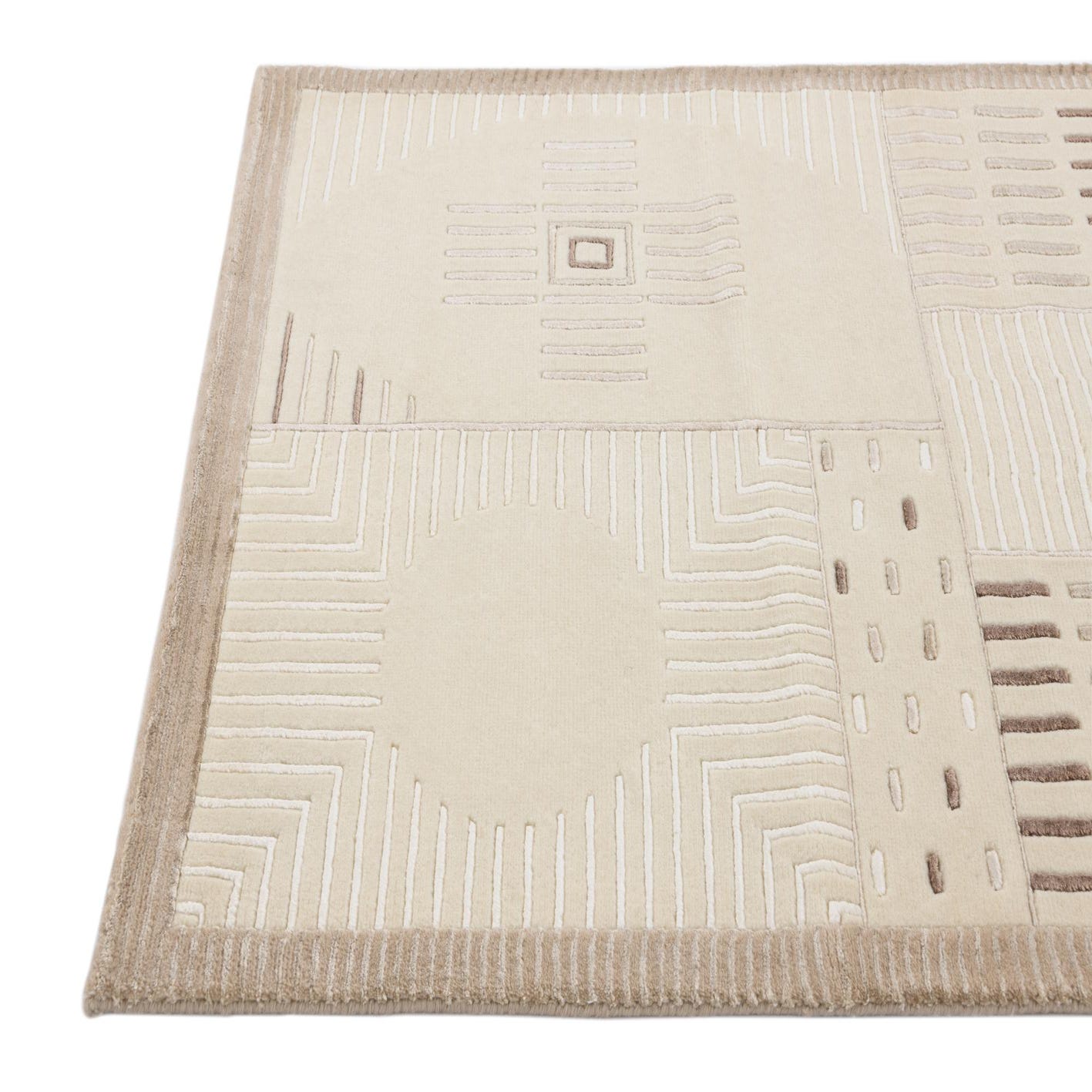 The Darya collection presents a refined 10 Ft runner hand knotted from 100% wool, featuring a sophisticated assortment of geometric patterns crafted with precision. The design showcases a harmonious blend of light beige as the dominant background color, complemented by accents in ivory and brown. Each linear element and modernistic square motif is thoughtfully spaced, offering visual balance and an aesthetic that commands attention whilst maintaining a sense of tranquility.