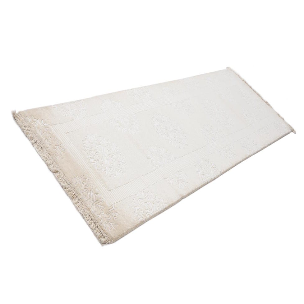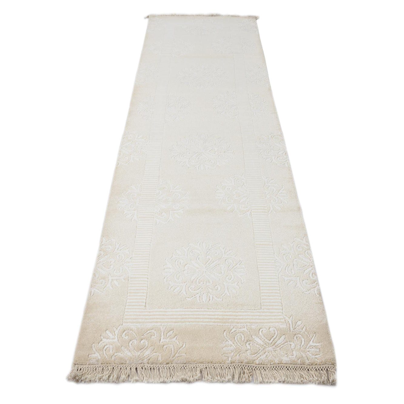The Darya Collection presents a refined 10 Ft runner hand-knotted from 100% wool, offering both durability and sophisticated charm. This runner features a light beige background harmoniously intertwined with a subtle damask-inspired pattern rendered in a soft cream and ivory palette. The intricate design is thoughtfully balanced with a distinct, yet gentle border detail, and enhanced by the natural texture of wool, providing a plush underfoot experience.