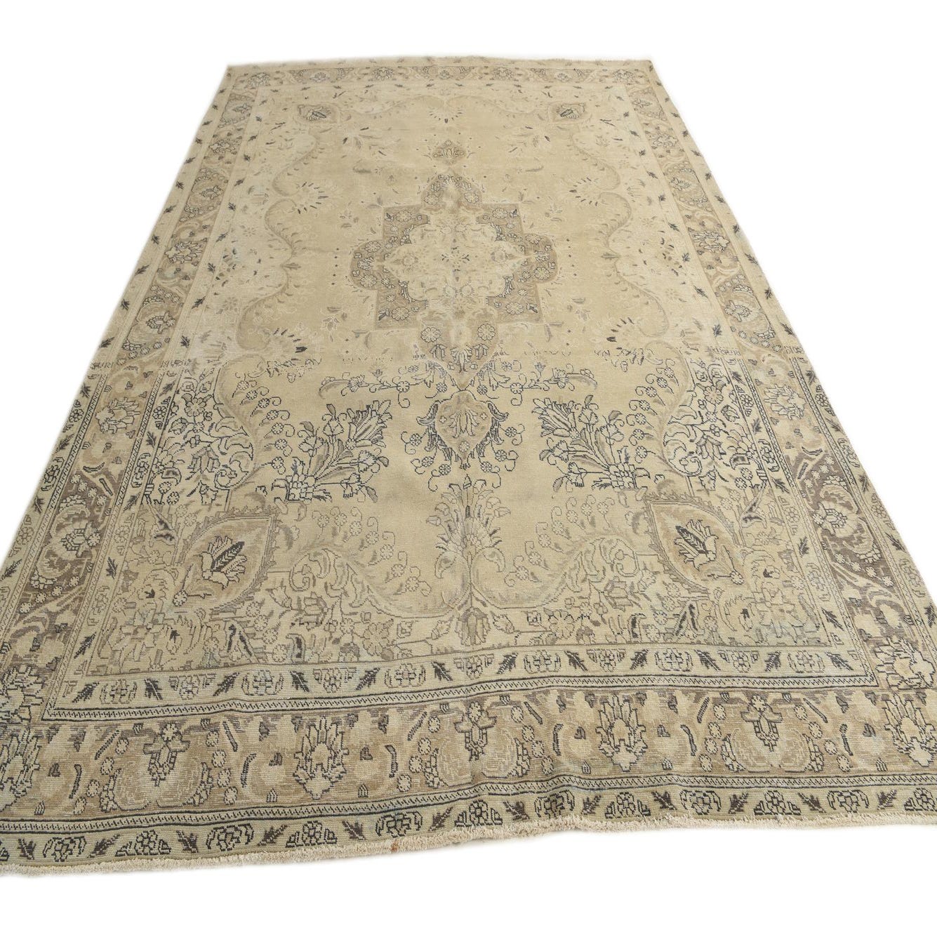A 10x13 rectangular ivory wool rug featuring a distressed Persian medallion and floral border design.