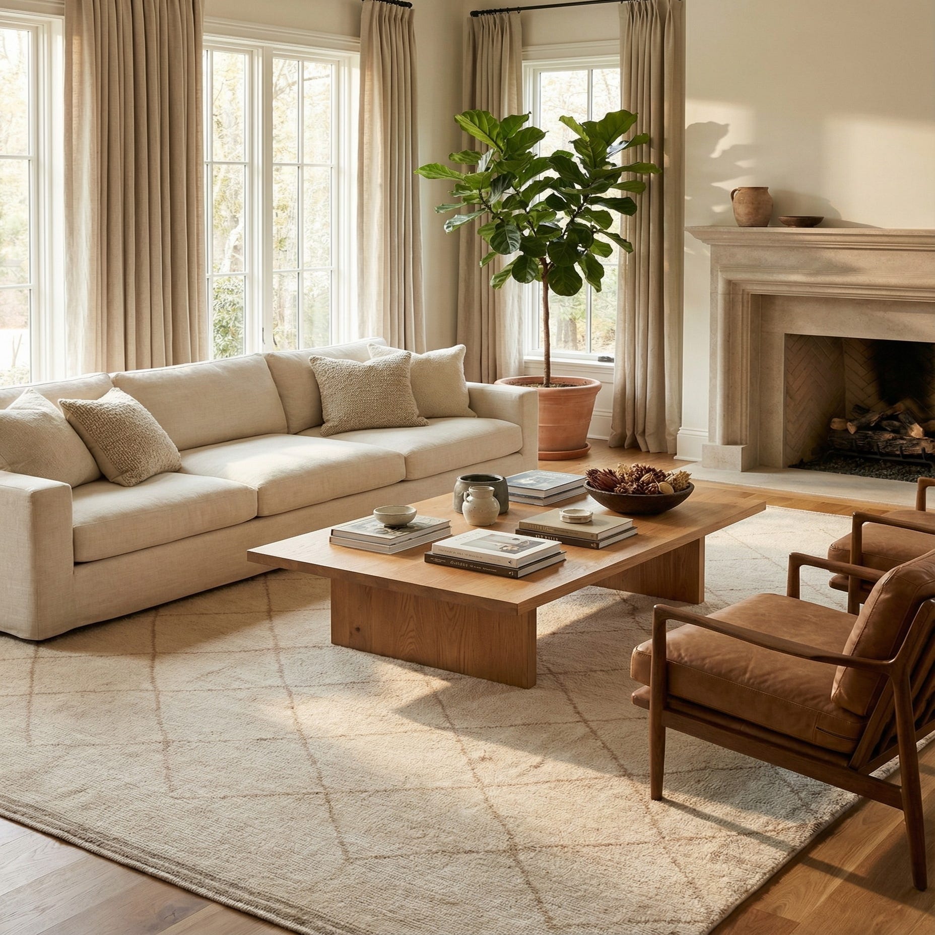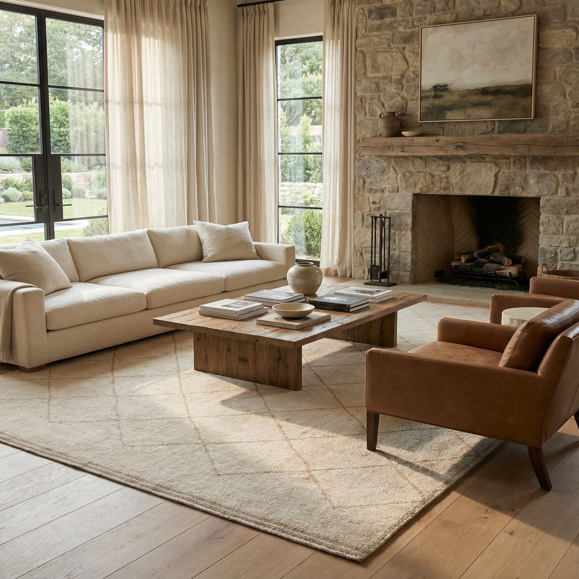 A 10x14 rectangular ivory wool shag rug featuring a subtle cream tribal diamond pattern, ideal for a living room.
