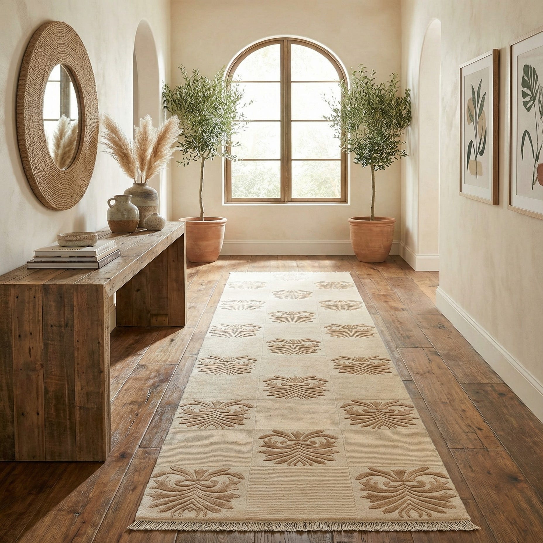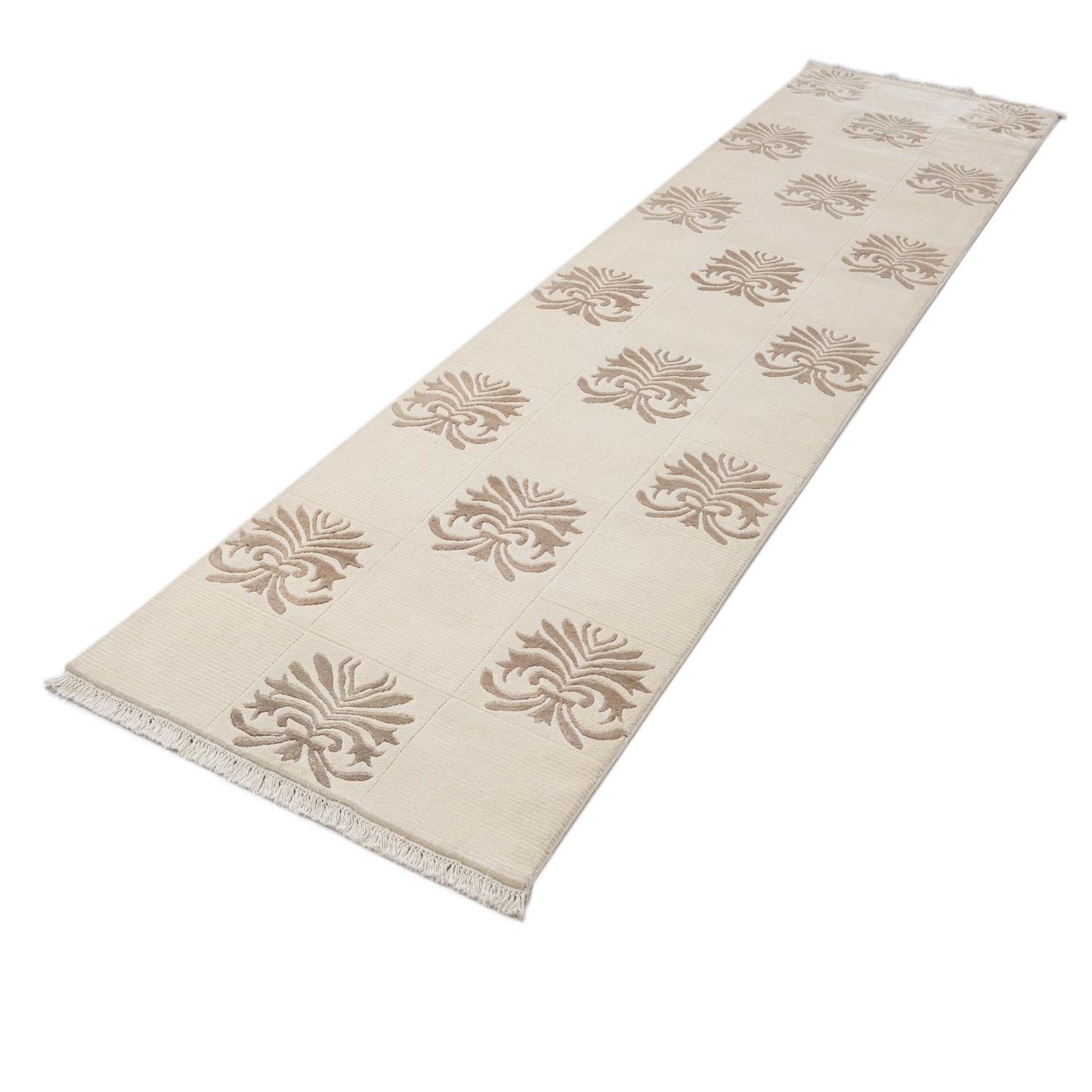 The Darya collection presents a sophisticated 13 Ft runner, hand-knotted of 100% wool for long-lasting quality and a soft, inviting texture. This runner showcases a harmonious pattern with stylized motifs in brown on a light beige background. The balanced repetition and classic design elements create an elegant aesthetic that complements a variety of interior spaces.