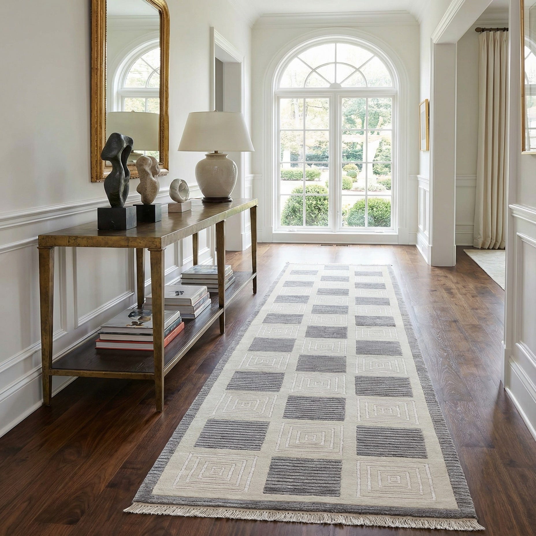 This runner's balanced combination of neutral colors and engaging patterns allows it to integrate seamlessly into various interior design styles. It would be a tasteful addition to a contemporary hallway, offering visual interest without overwhelming the space. Alternatively, its geometric precision and elegant simplicity make it suitable for a minimalist setting, where it could serve as a subtle focal point. The runner's substantial length also makes it ideal for long, narrow spaces such as corridors, entryways, or alongside a kitchen island, enhancing the flow and cohesion of the area.