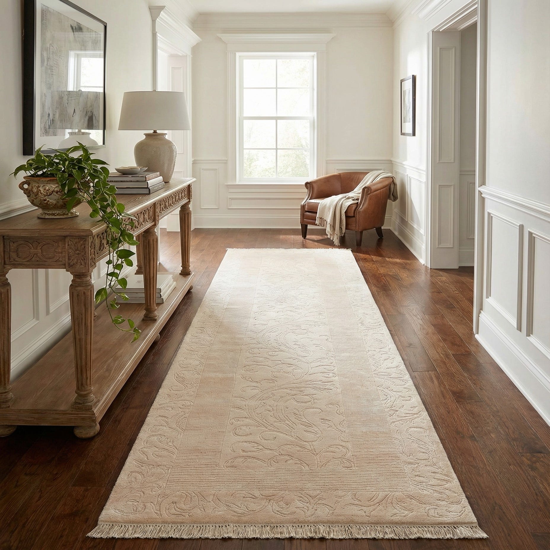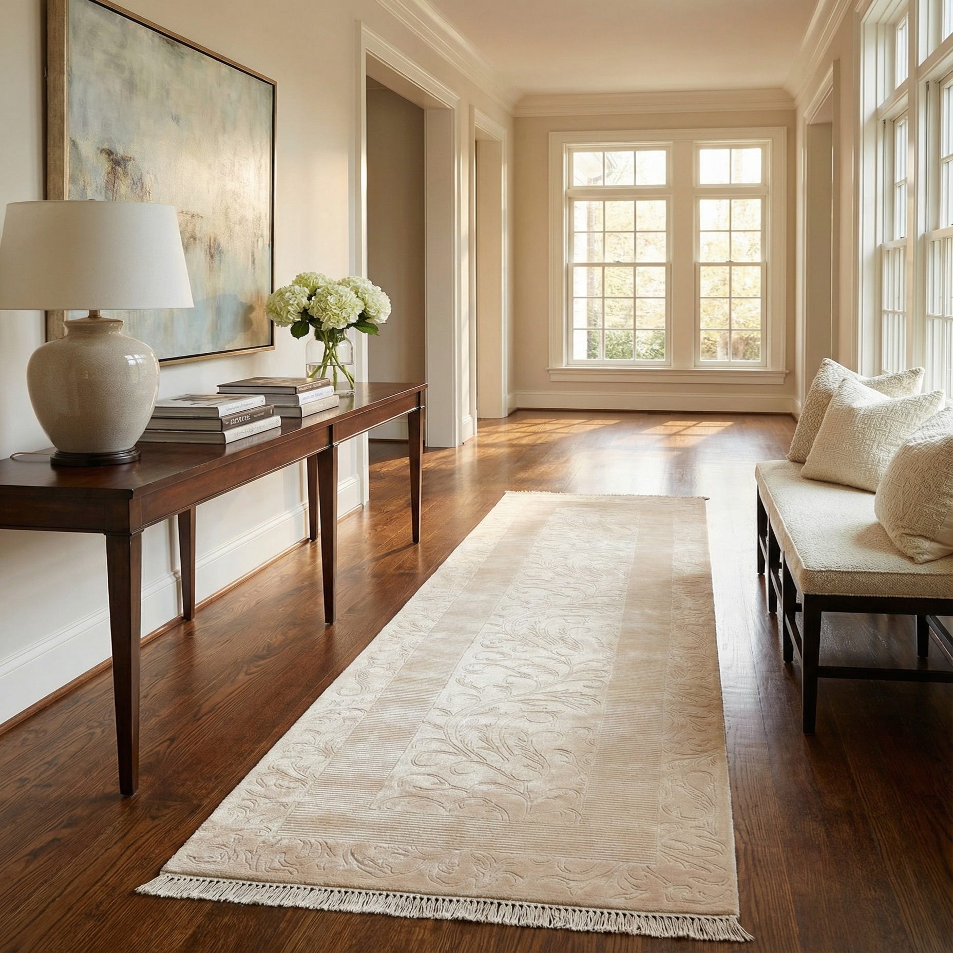 Ideal for elongated spaces such as hallways and grand entries, this runner would complement interiors that favor a neutral palette and seek to create an ambiance of subtle luxury without overwhelming the senses. Its light tones can help to visually expand a space, making it an integral piece for interiors that aim to maintain a serene and expansive aesthetic.