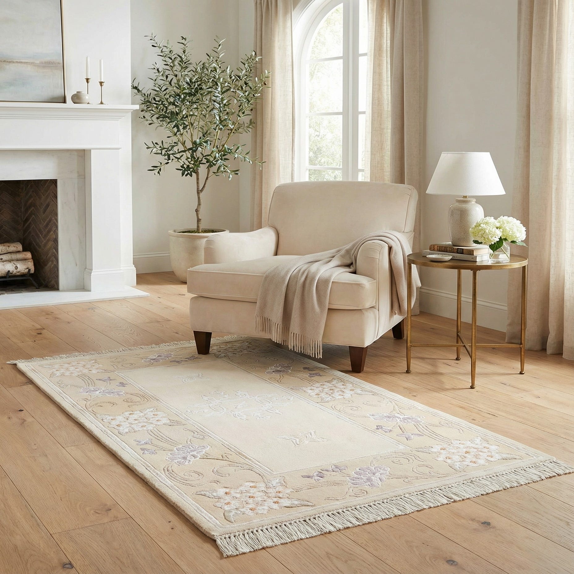 Hand-knotted from 100% wool, the surface has a plush, tactile quality—the pile yields pleasantly underfoot while the floral motifs are slightly raised, giving the rug a measured textural depth. It works especially well layered beneath a low-profile coffee table in a neutral living room, tucked at the foot of a bed or alongside bedside furniture to warm a bedroom, or placed in a quiet reading nook paired with linen upholstery and light wood tones. The palette and pattern pair nicely with both traditional furnishings and softer modern or transitional schemes, bringing warmth and a subtle decorative presence to the room.
