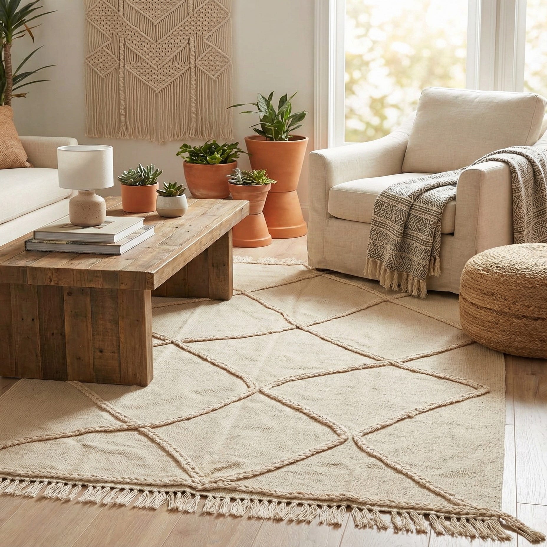 This rug works well in relaxed, modern interiors where understated pattern and natural materials are desired — think a cozy reading nook, layered at the foot of a bed, or anchoring a small seating area. Its neutral tone pairs easily with light woods, linen upholstery and woven accents, and it also complements more minimal schemes when you want a hint of organic texture without bold color.