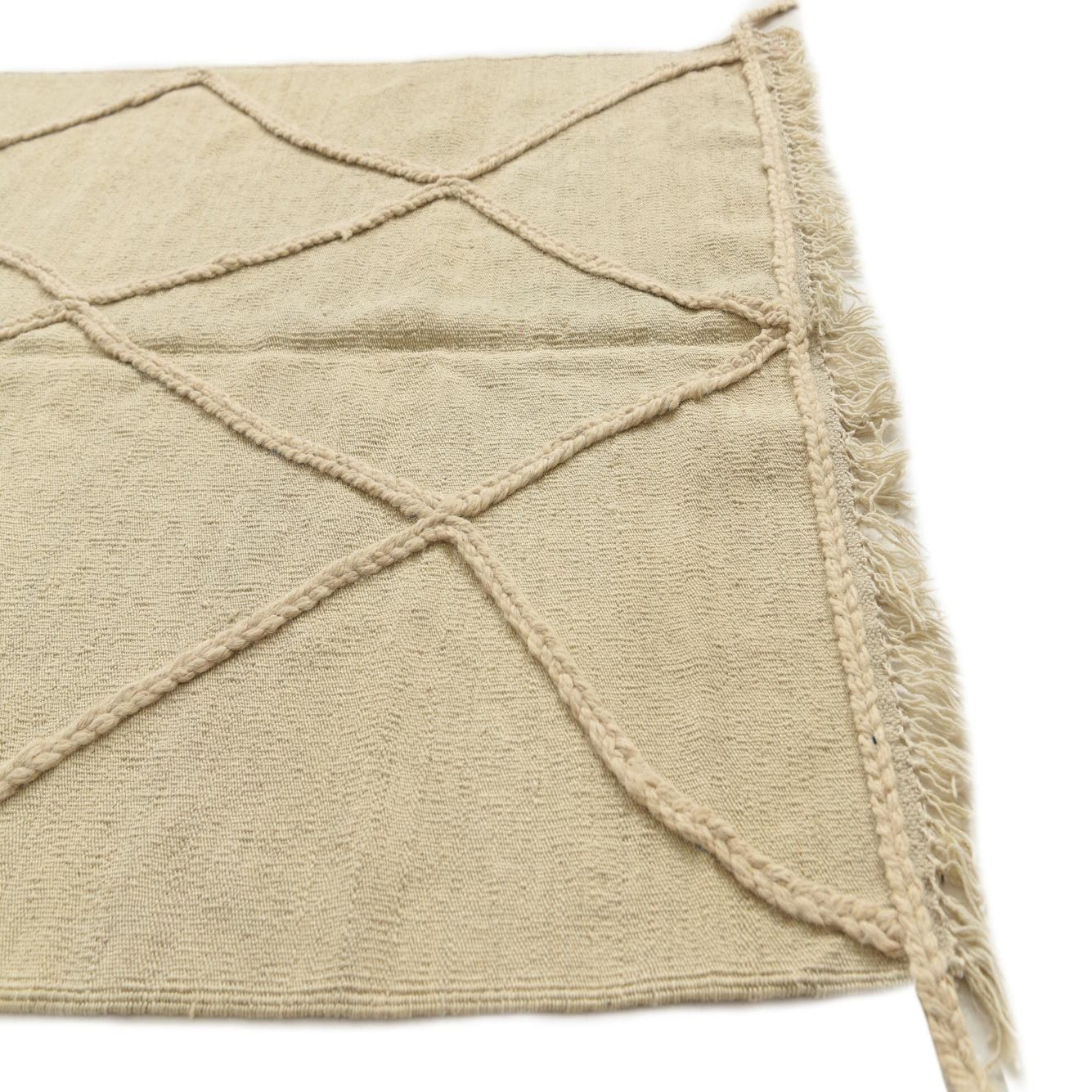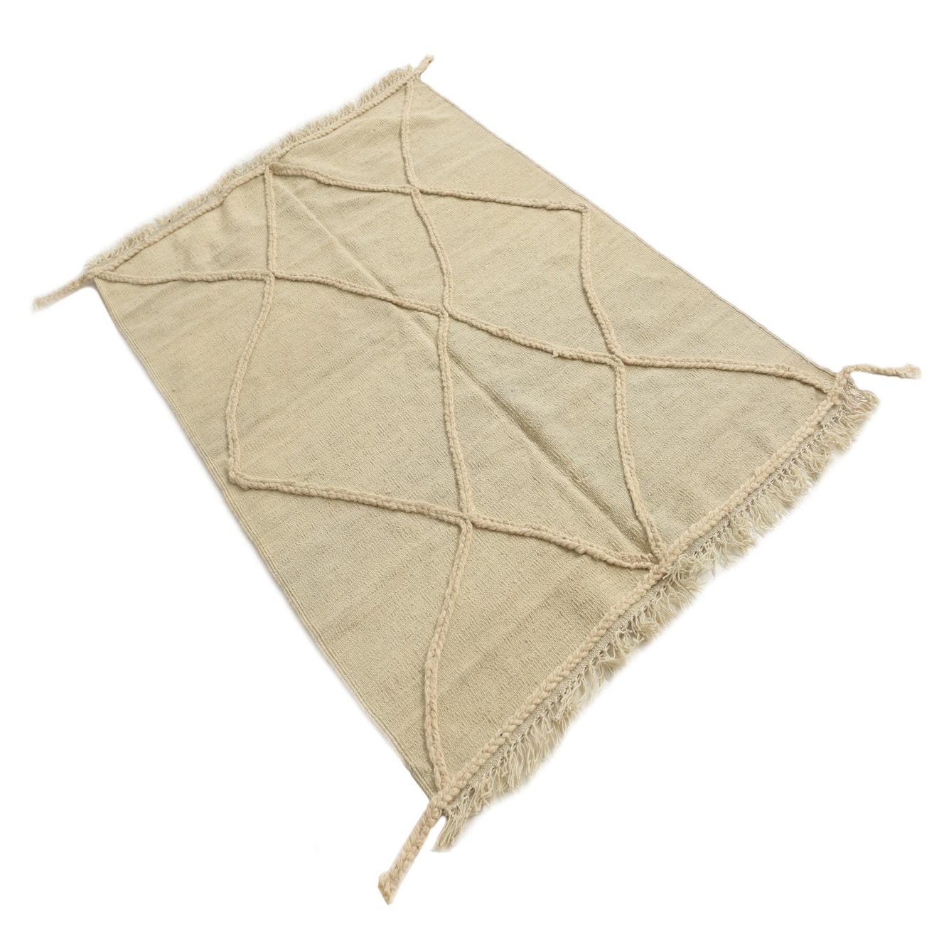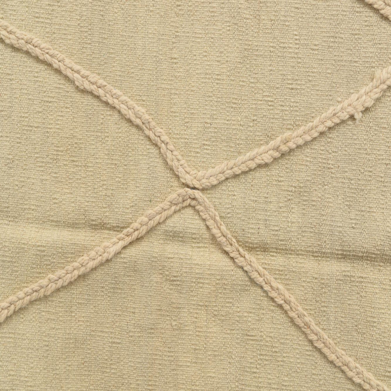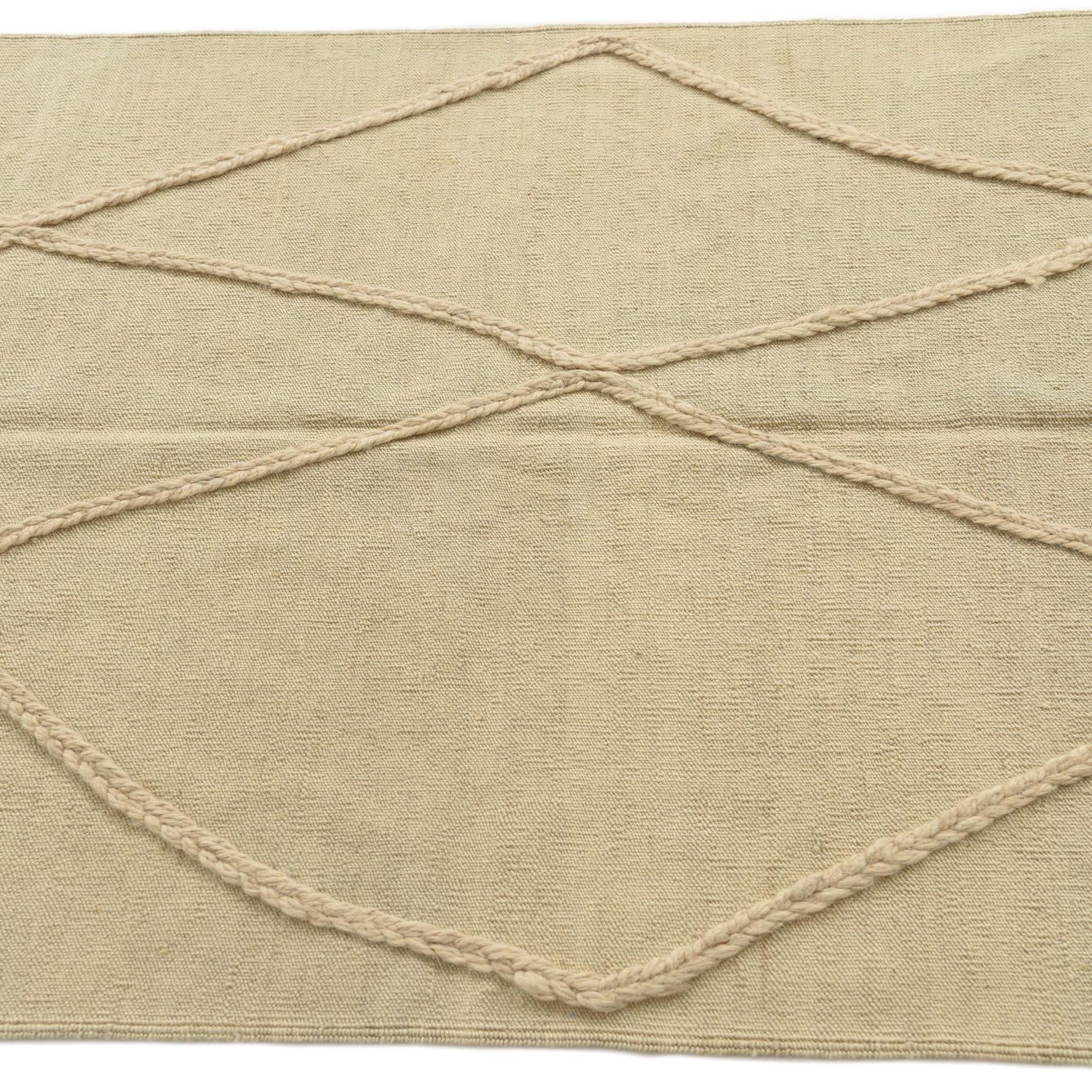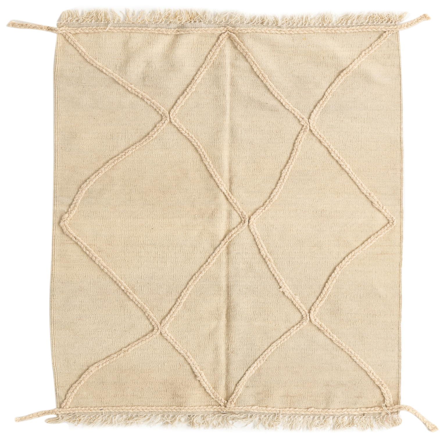This Moroccan collection rug features a simplistic yet compelling design, hand knotted from 100% wool for durability and a soft, plush feel. The piece measures 3x5 feet, making it an ideal accent for a variety of spaces. The light beige background provides a neutral canvas, while the raised diamond pattern in a complementary natural hue offers subtle depth and texture.