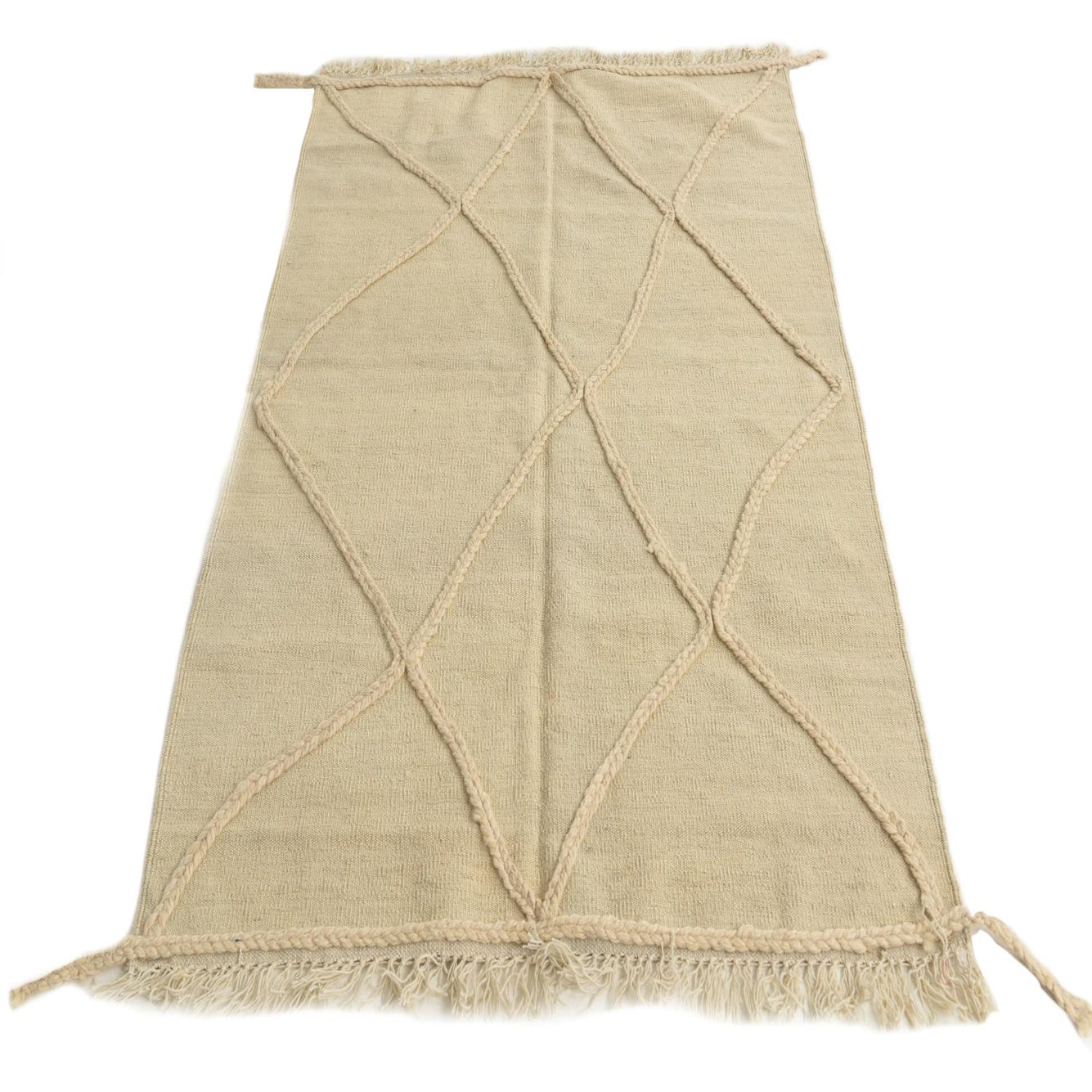 A 3x5 rectangular ivory wool shag rug with a braided diamond pattern and fringed edges, suitable for indoor spaces.