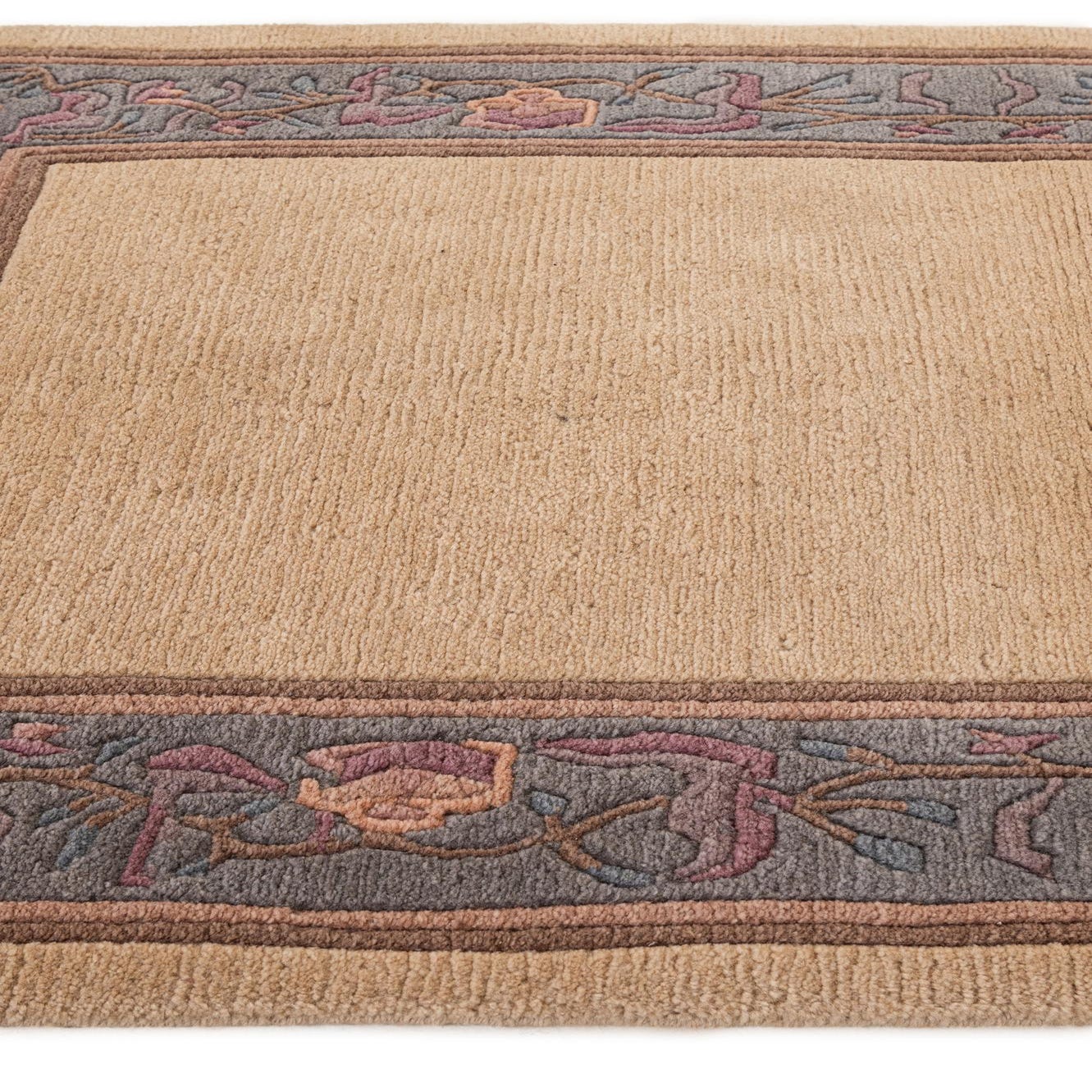 A 3x5 rectangular ivory wool rug with a grey-blue border featuring an abstract floral and vine pattern in pink, purple, and orange.