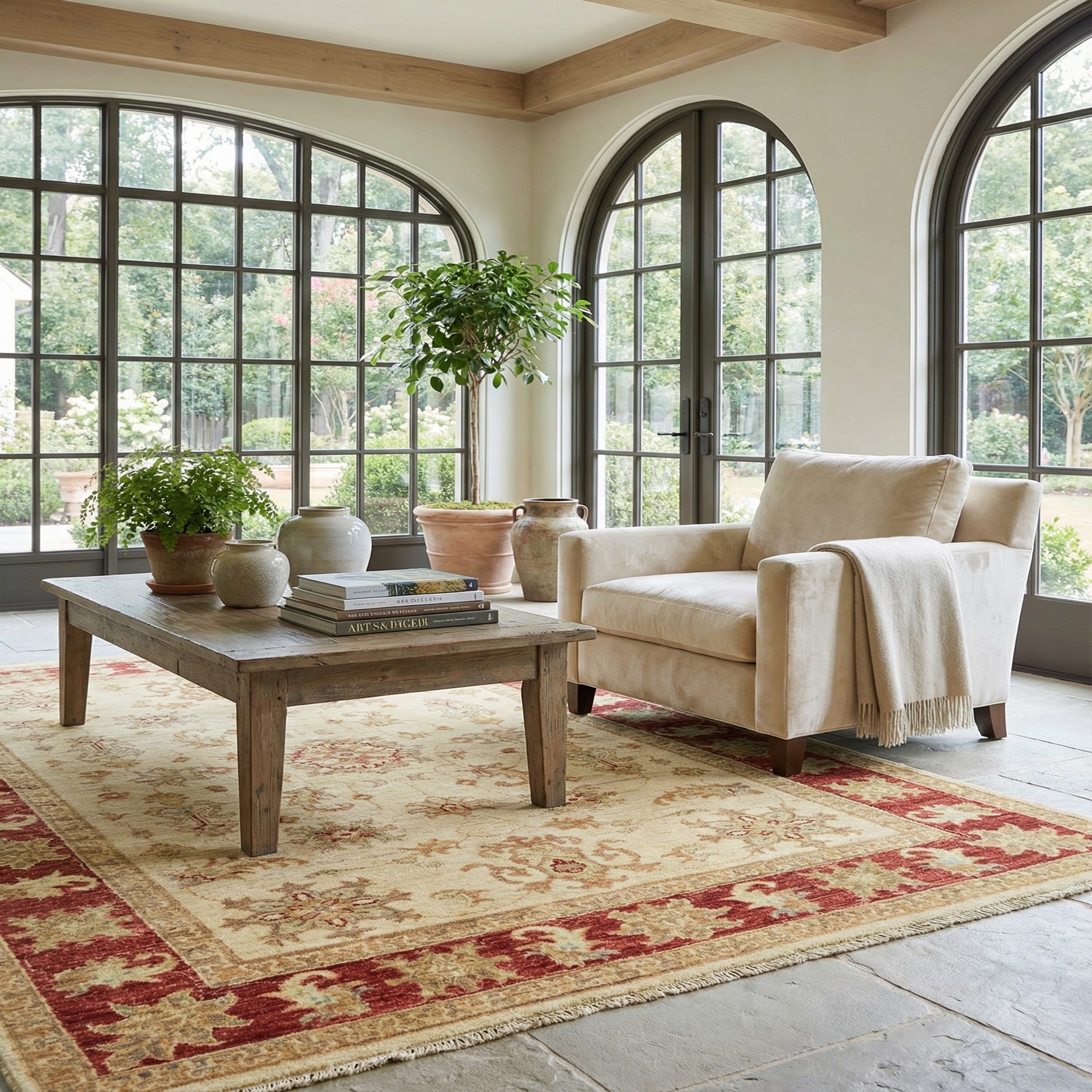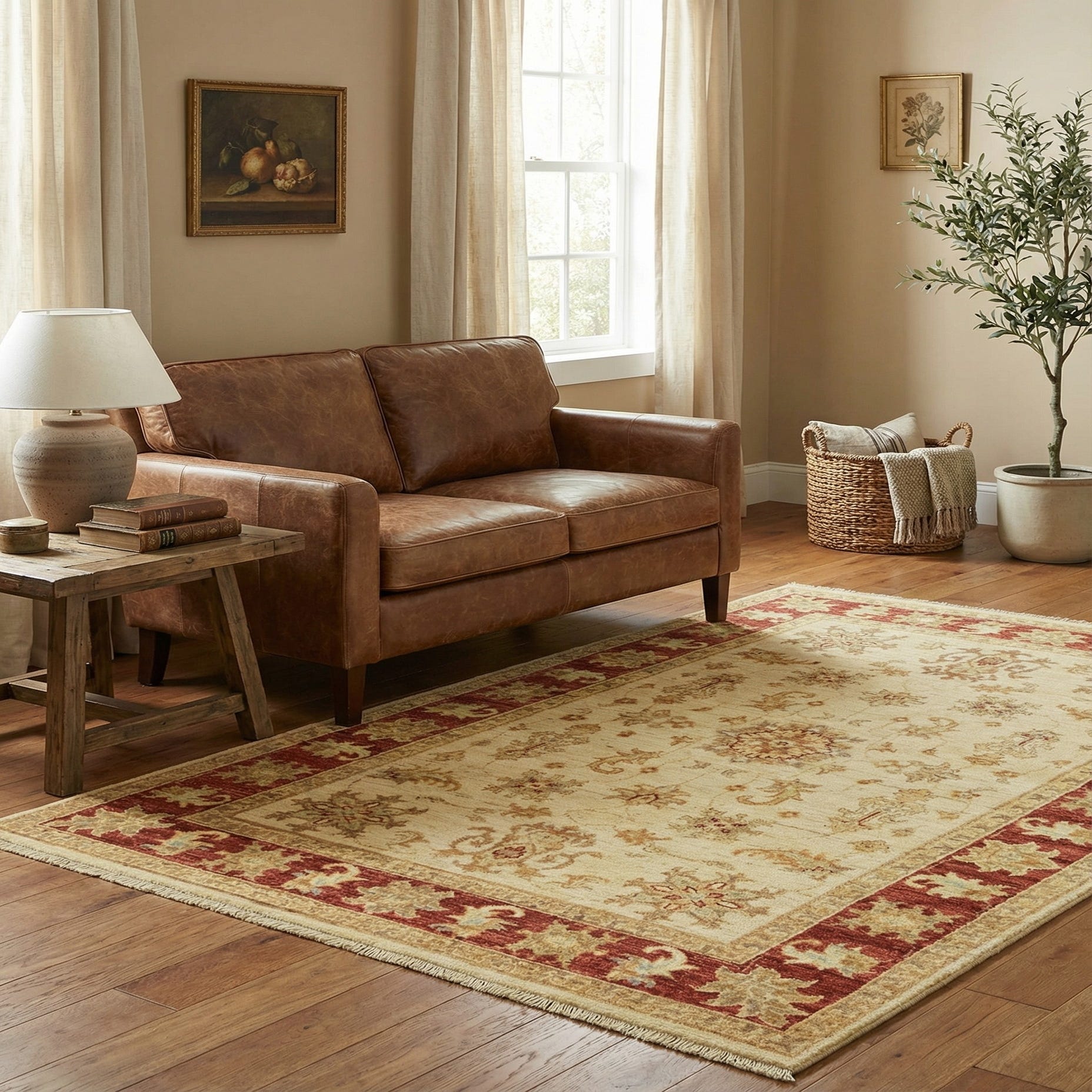 A 3x5 rectangular ivory and cream rug with a traditional botanical and floral pattern, featuring a bold red border.