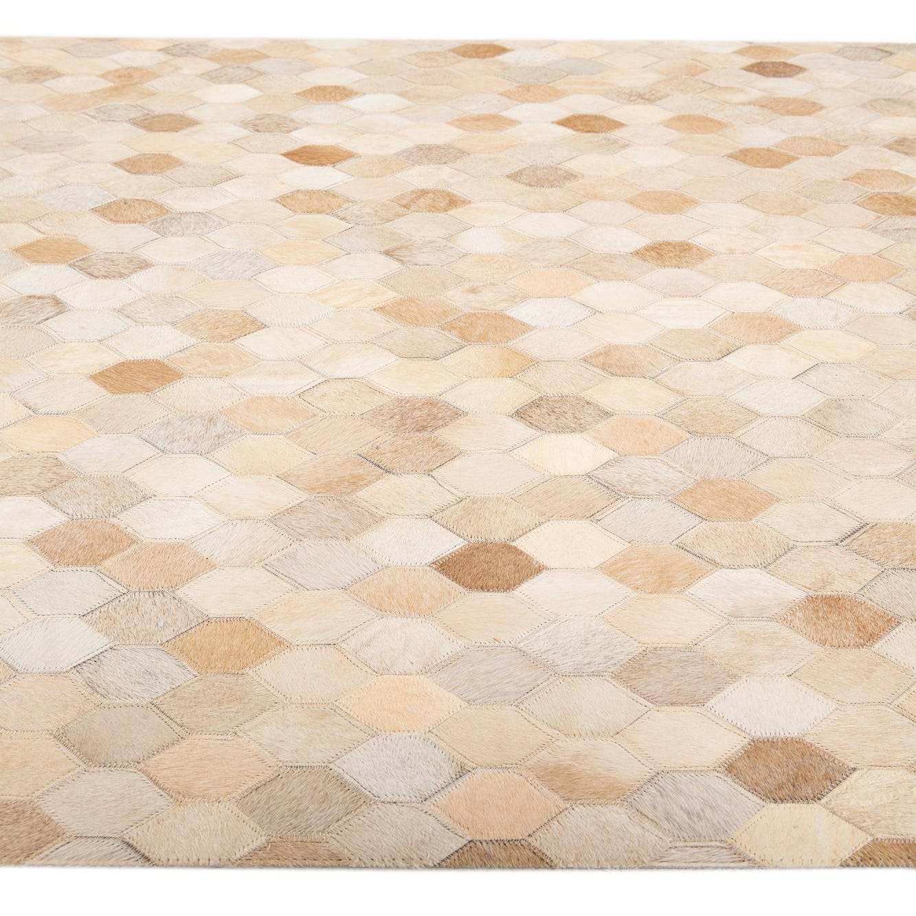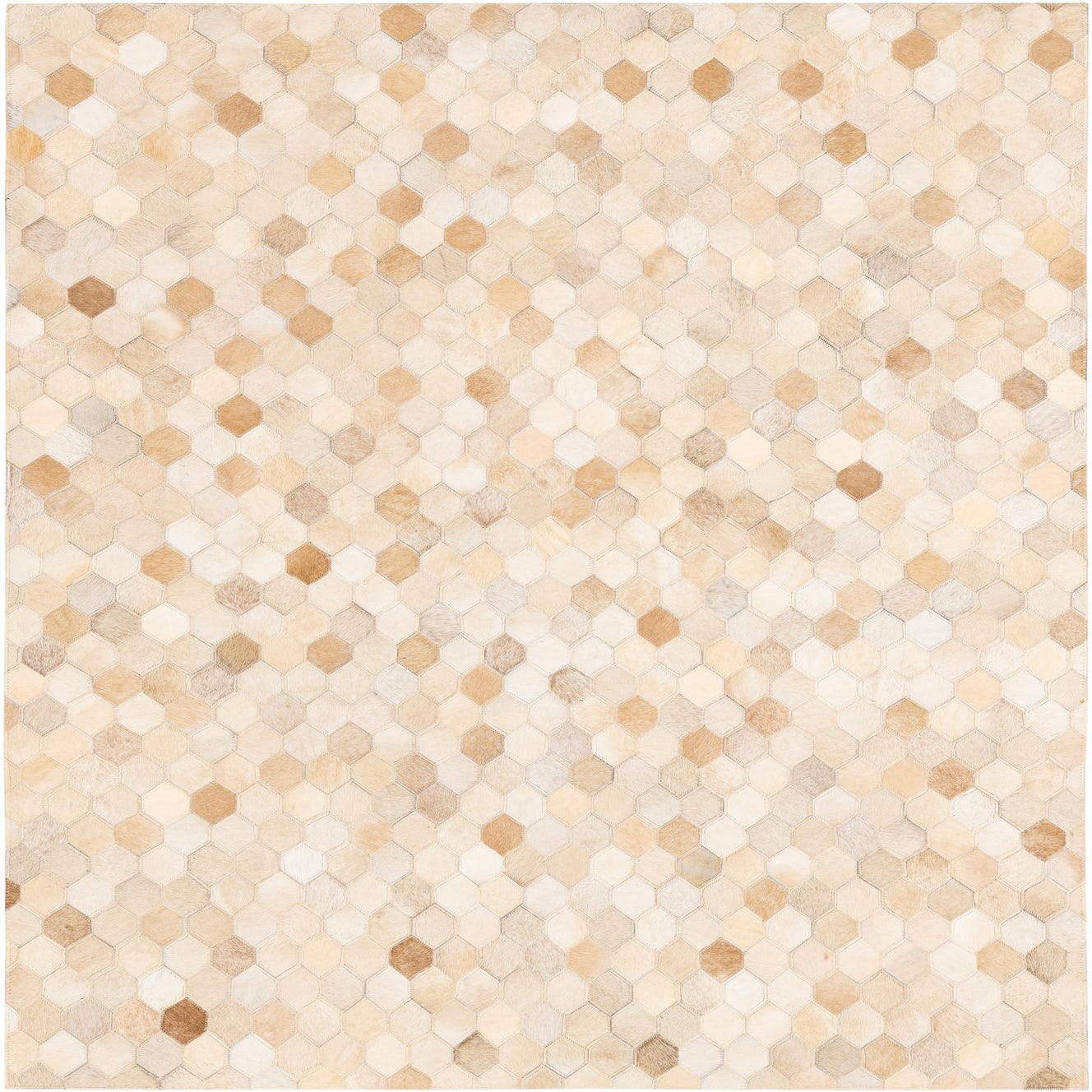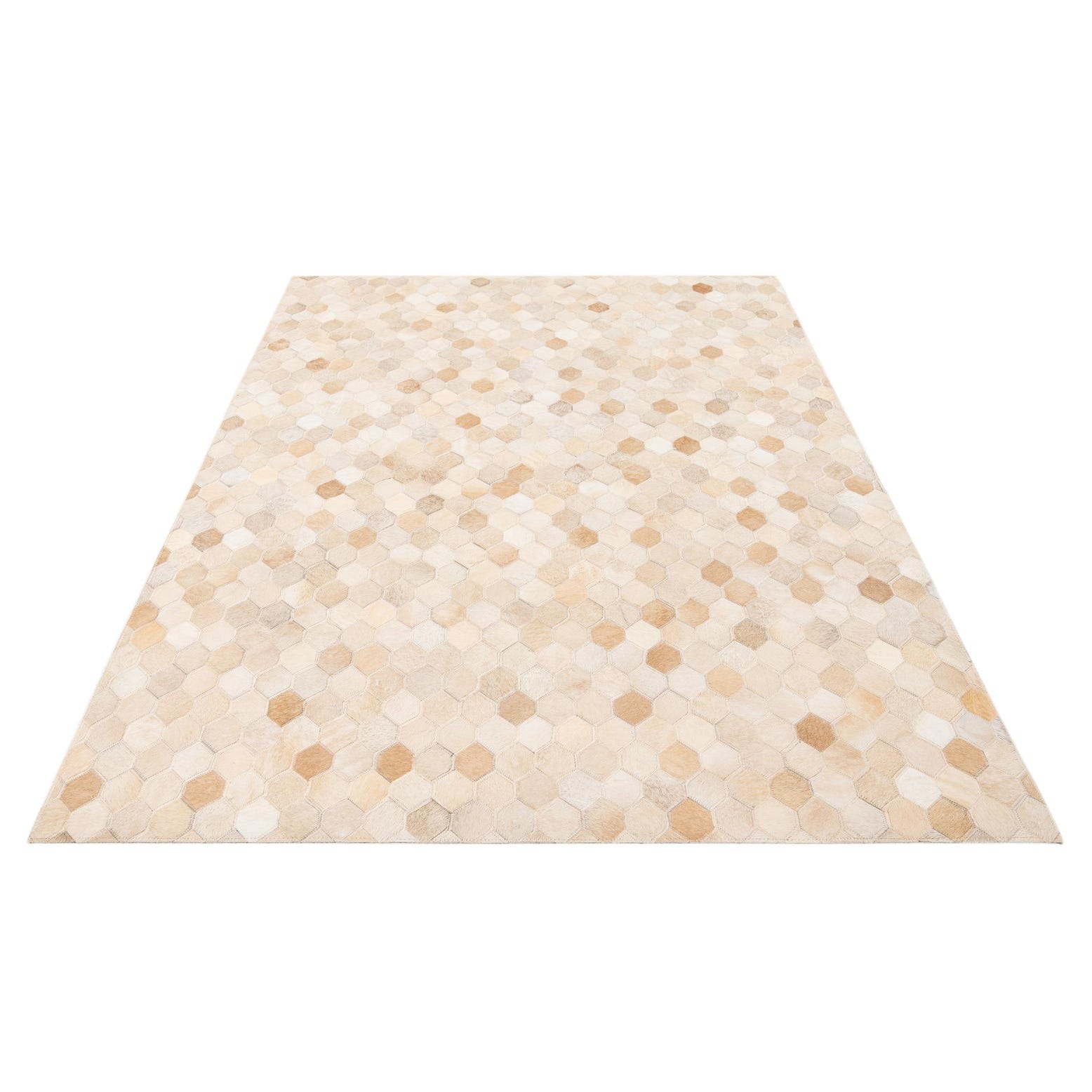 A 4x6 rectangular modern rug made from natural cowhide and leather in varying shades of ivory and cream, featuring a geometric honeycomb pattern.