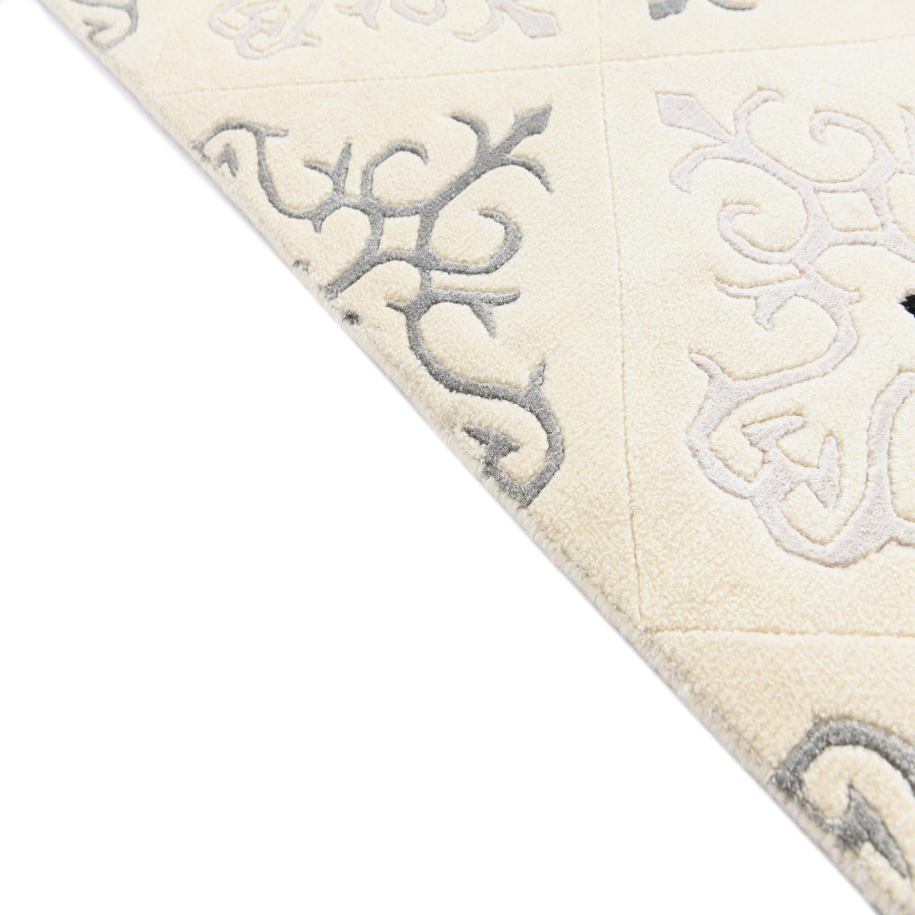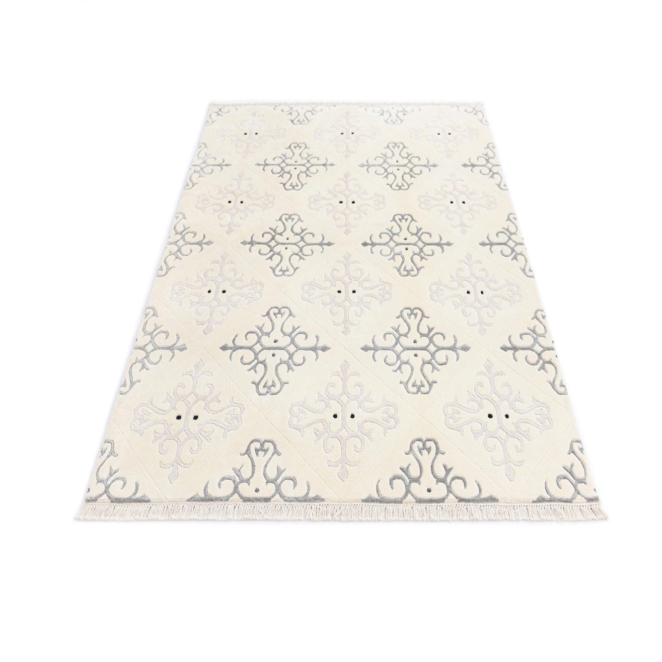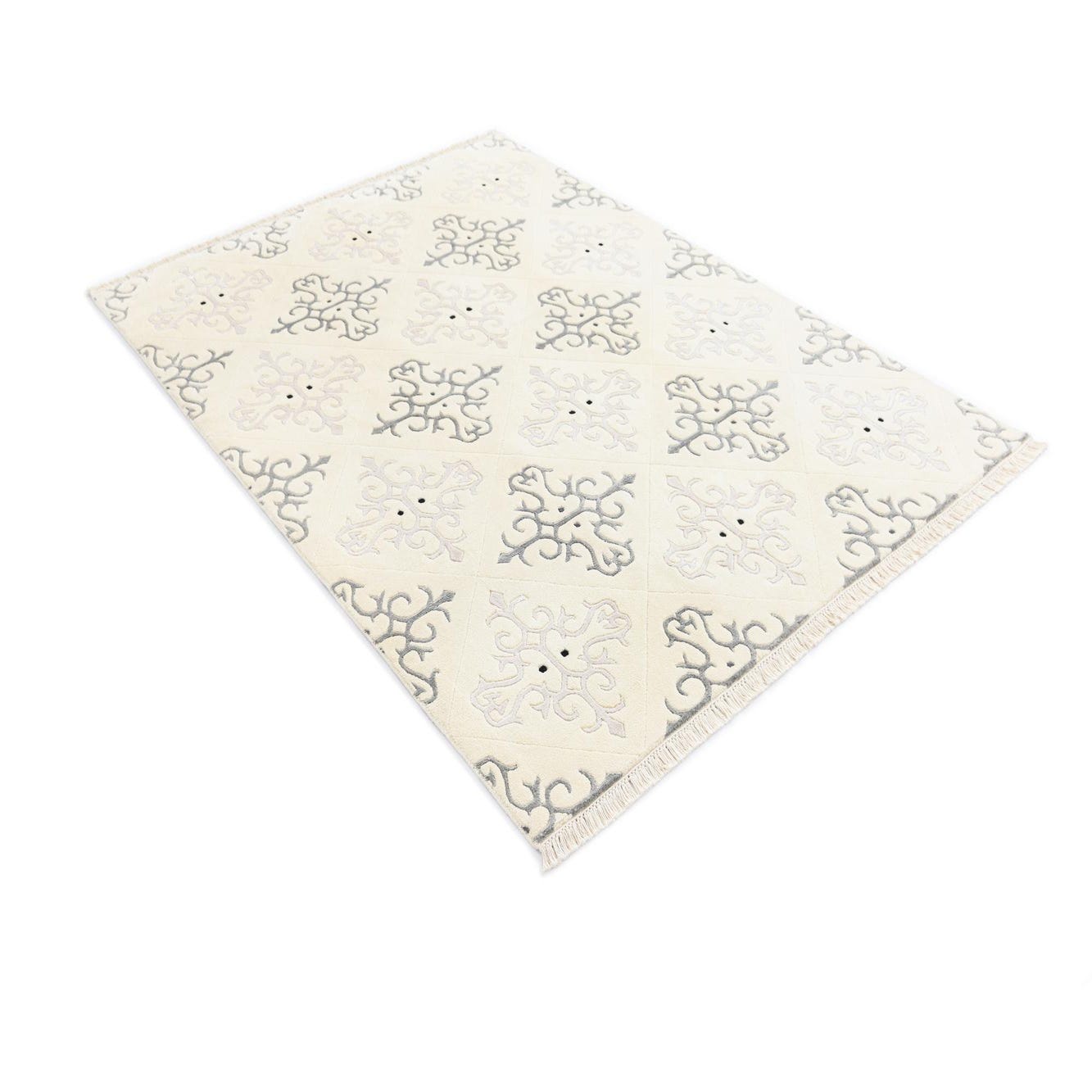 A 4x6 rectangular ivory modern rug with an intricate light gray and dark gray scroll pattern, perfect for a living room.