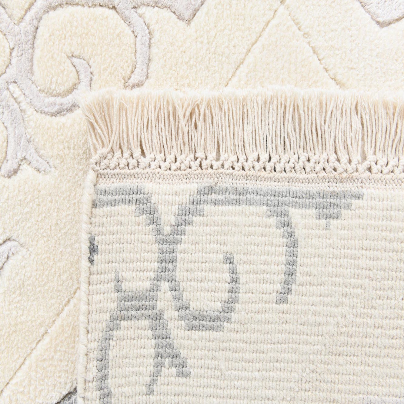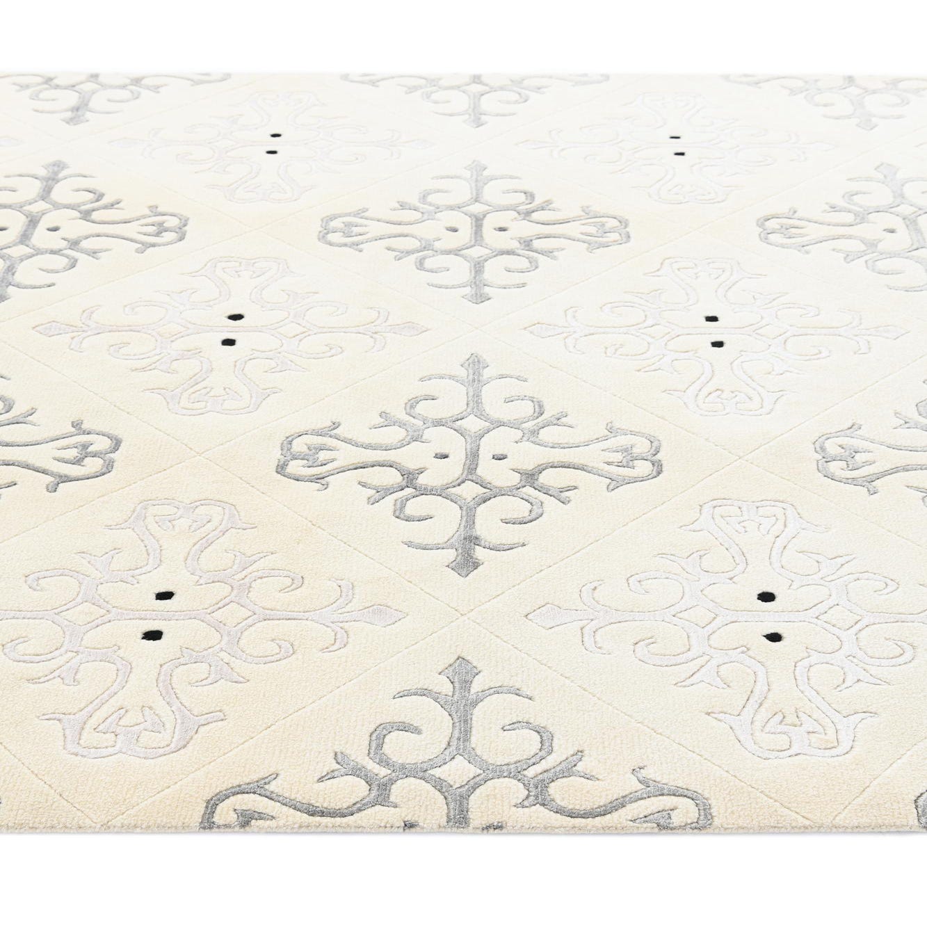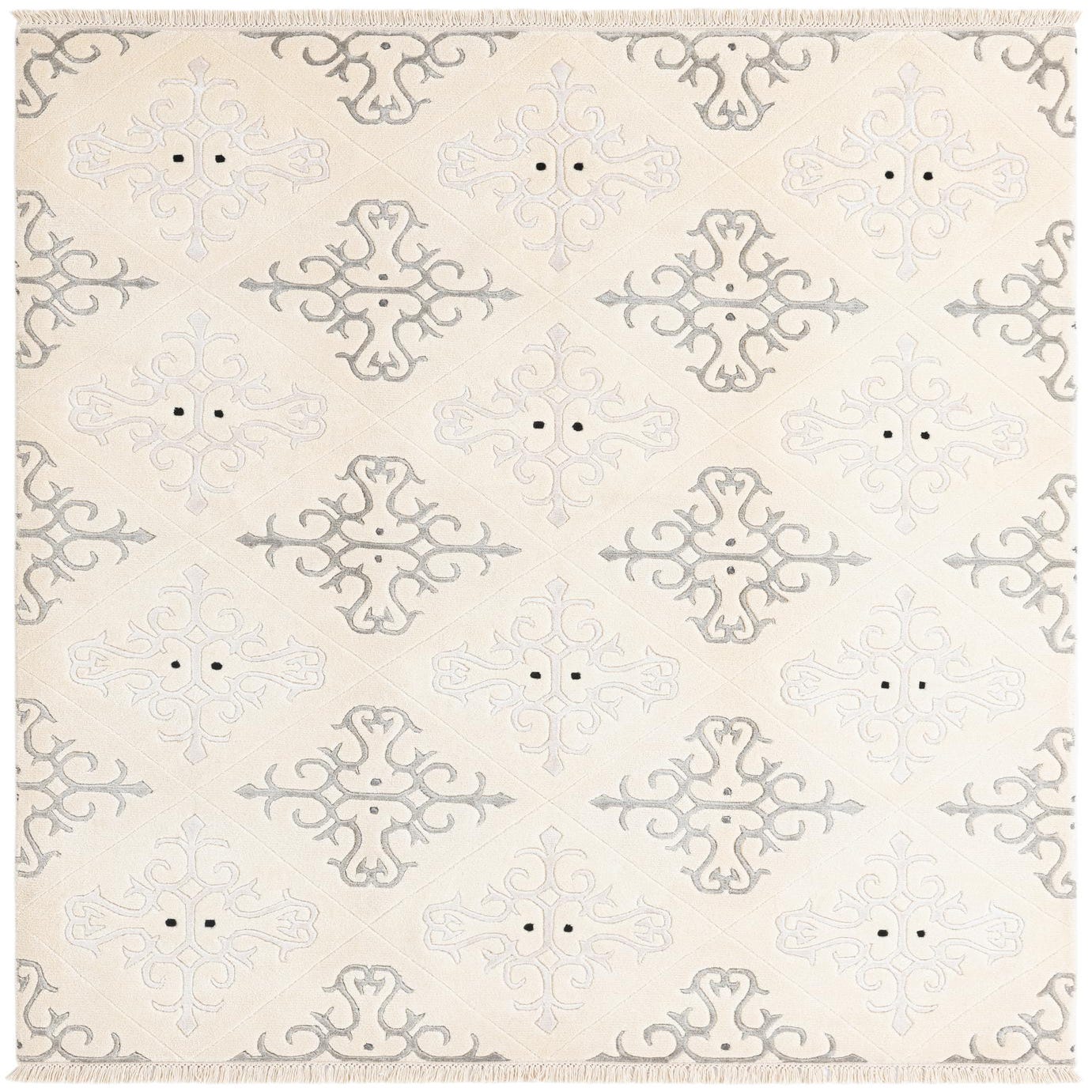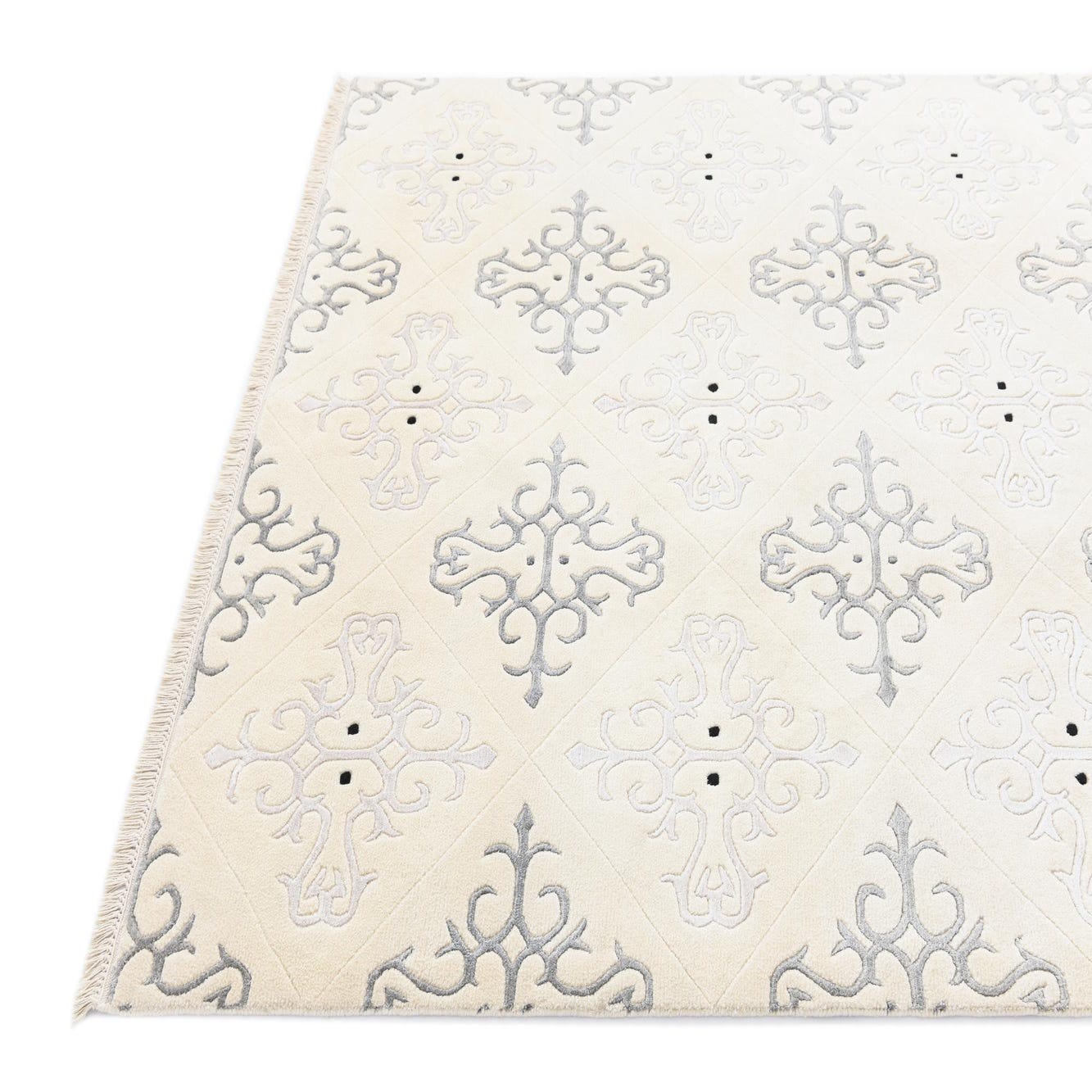 Primary color is Light Beige. Colors in this rug include: Light Beige, Beige, Black, Gray, Ivory, Silver.