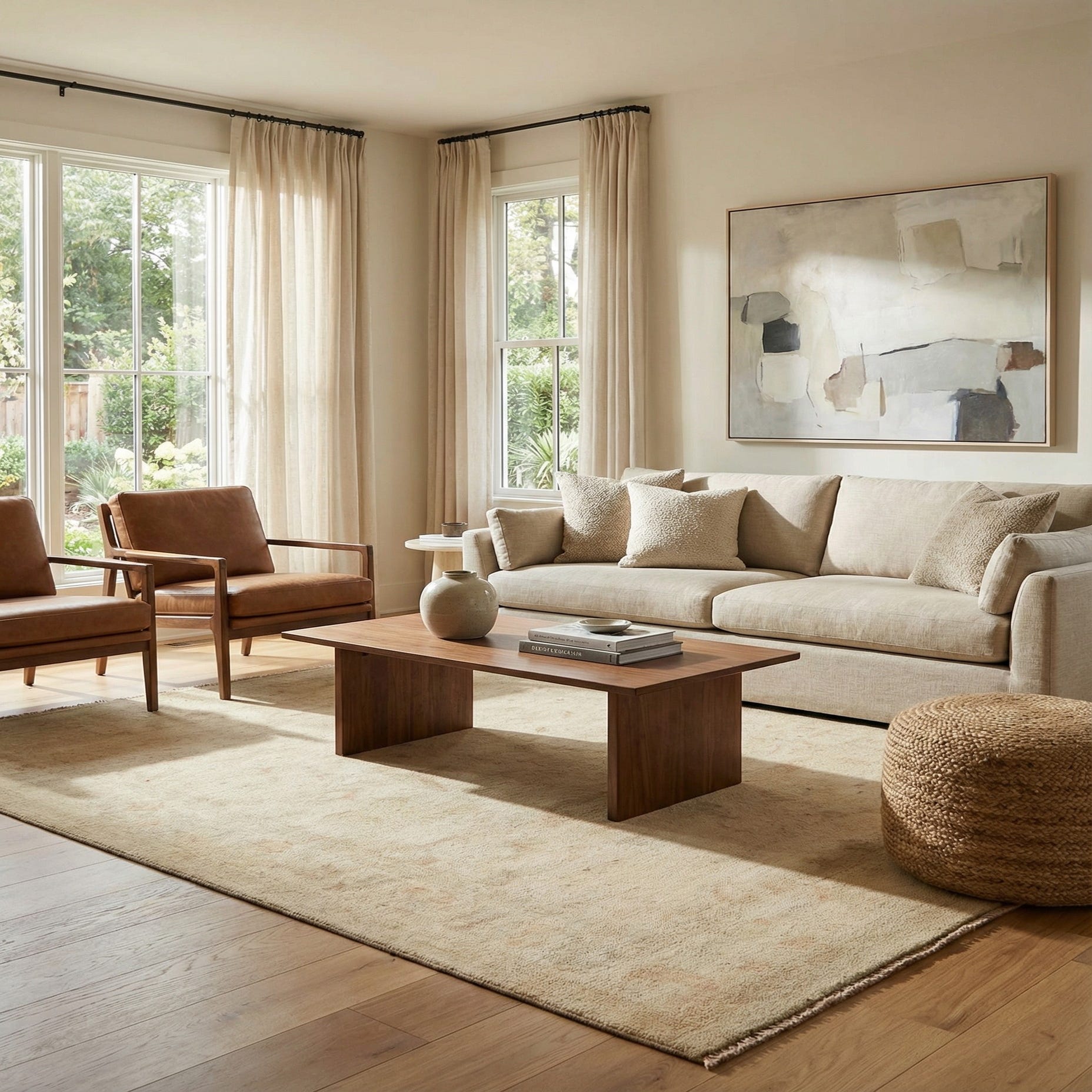A 4x6 rectangular ivory Modern Ziegler rug with subtle abstract Oriental patterns, suitable for a living room.