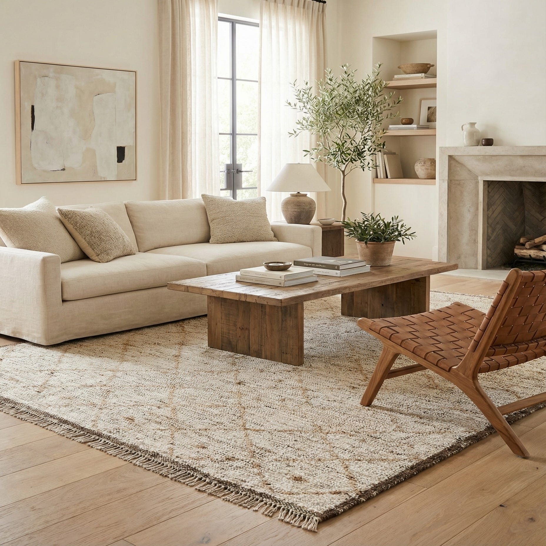 A 4x6 rectangular ivory wool shag rug with a subtle tribal diamond pattern and dark brown border, suitable for a living room.