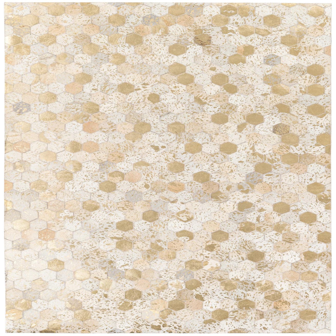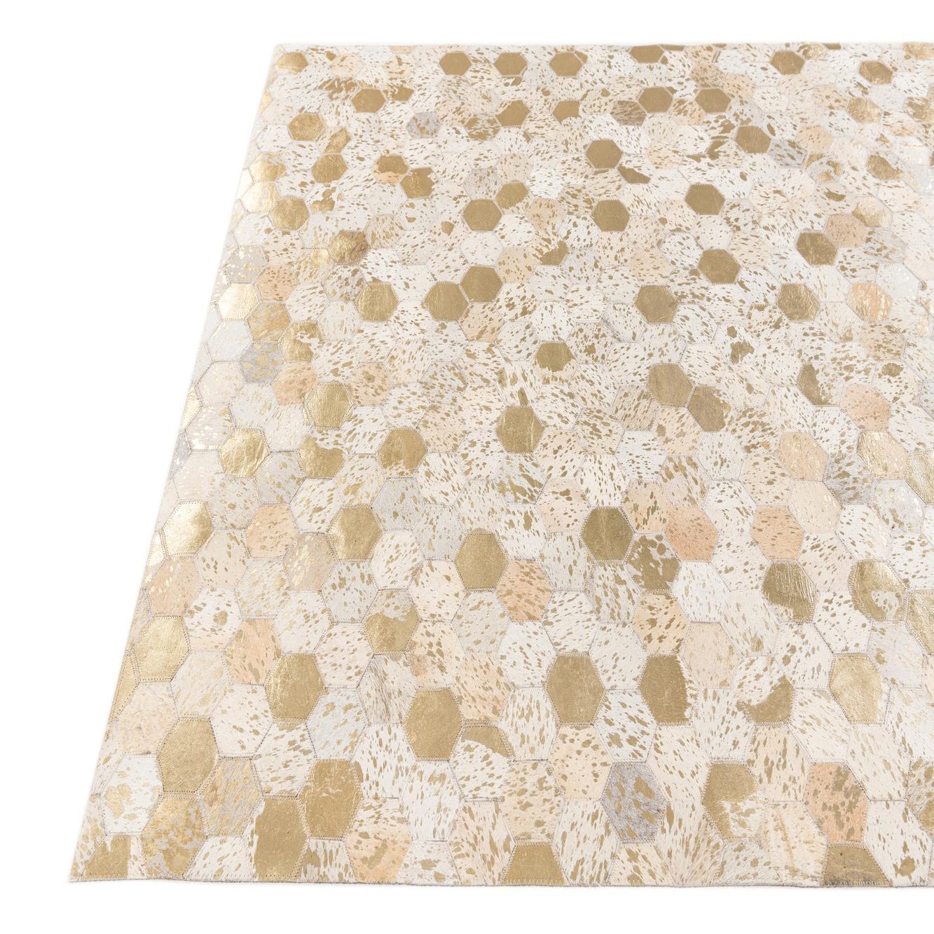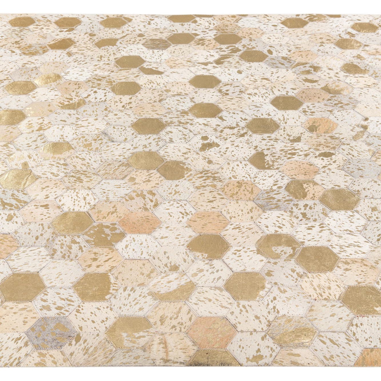 A rectangular 5x7 modern rug featuring a mosaic of ivory, cream, and gold hexagonal cowhide patches.