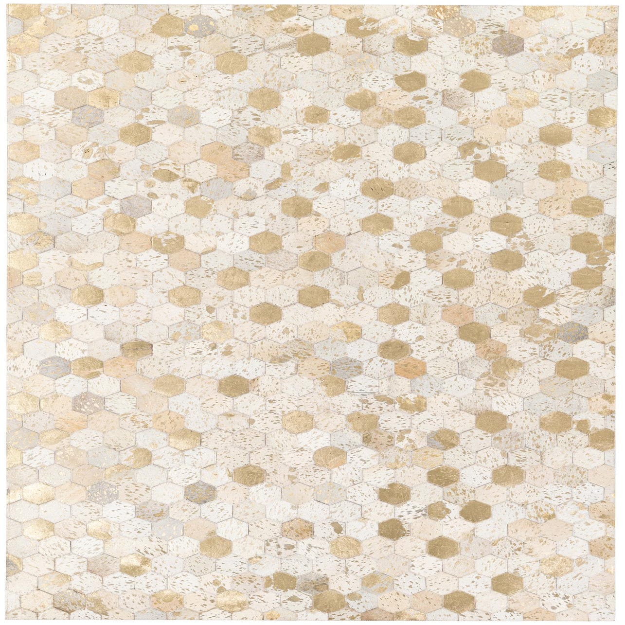 A 5x7 rectangular modern cowhide rug featuring a mosaic of ivory, cream, and metallic gold hexagonal patches.