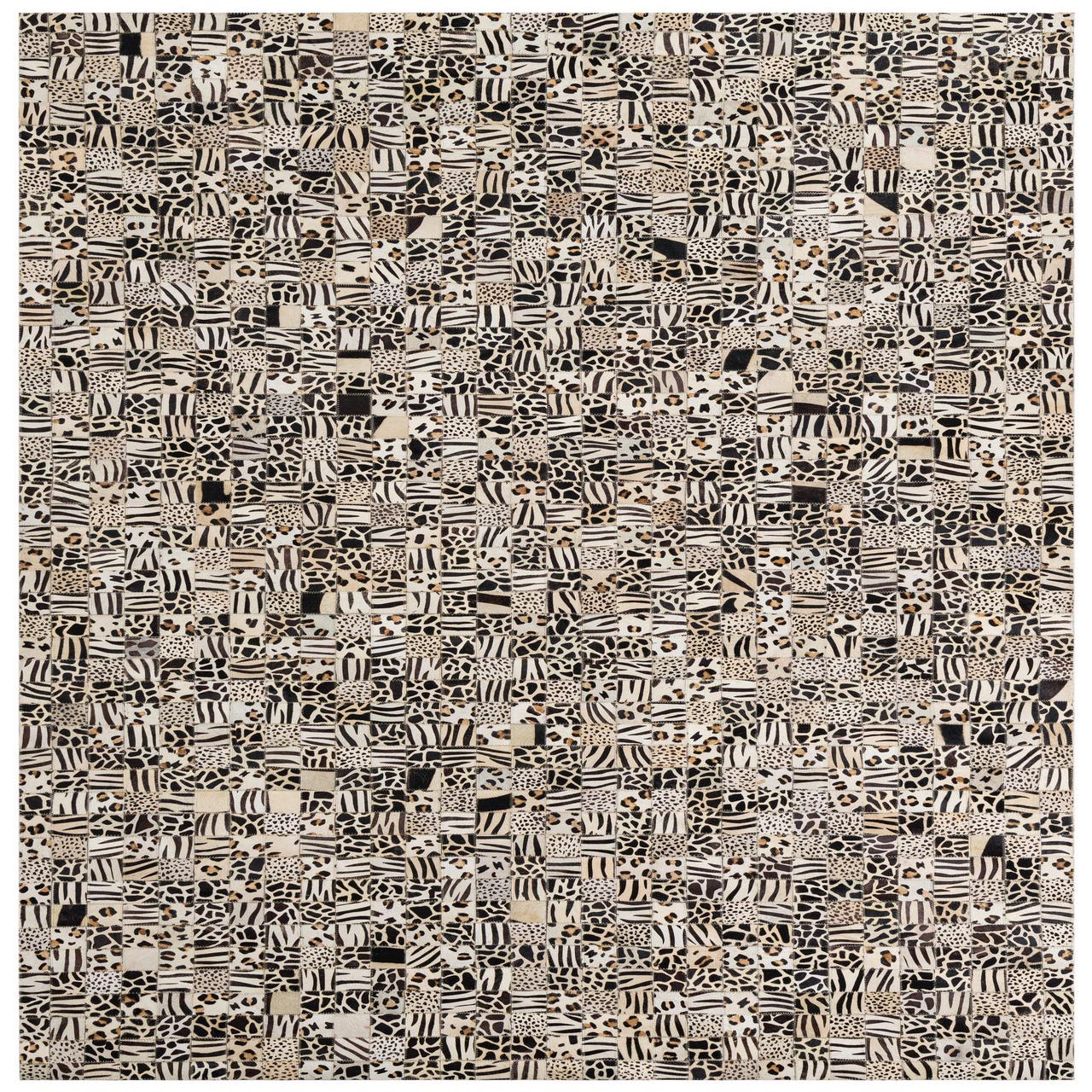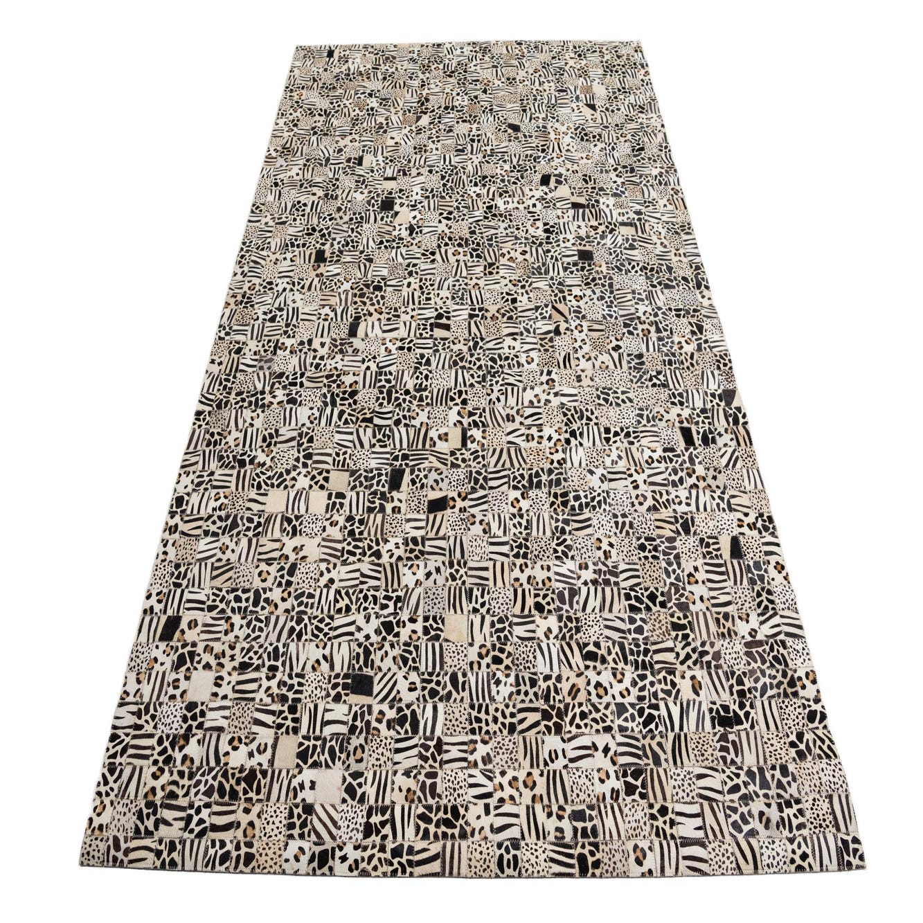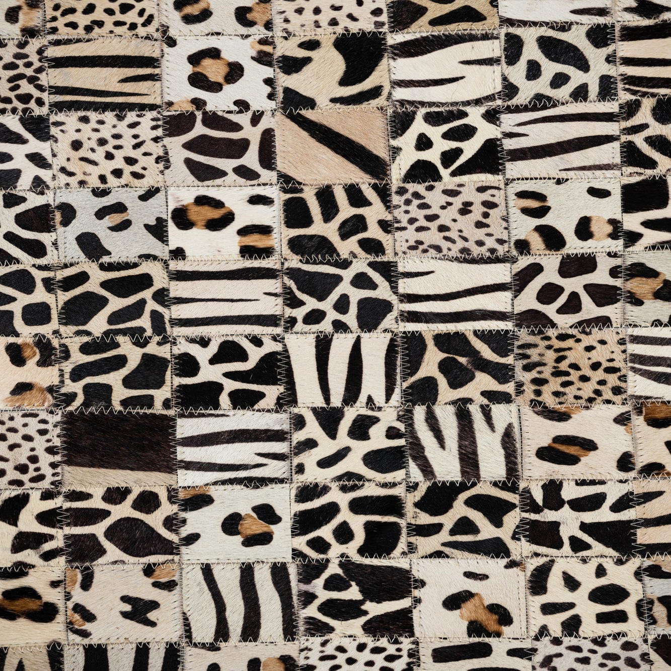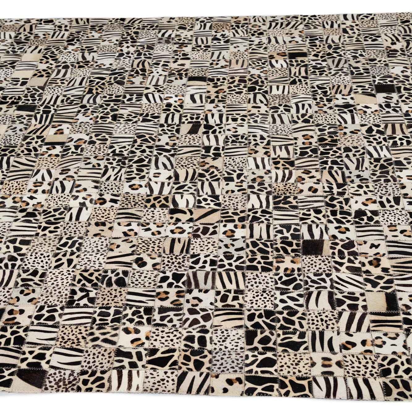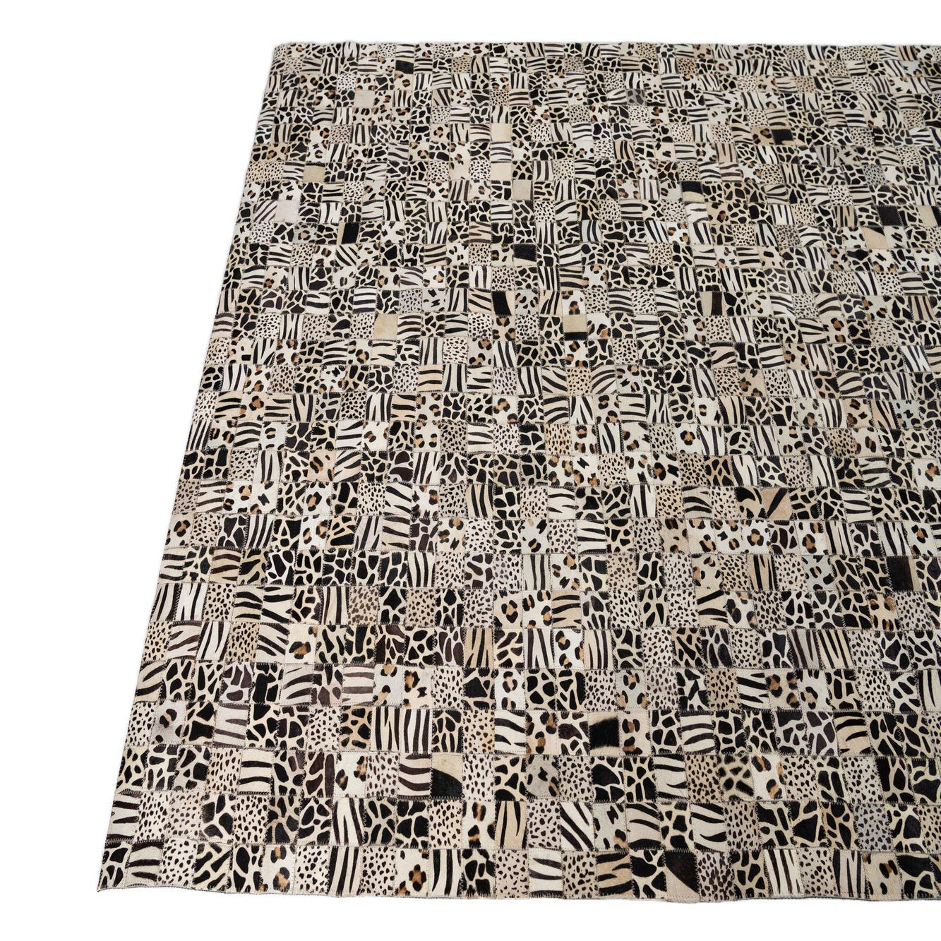 A 5x8 rectangular modern rug featuring a patchwork of ivory, black, and brown cowhide leather with various animal prints.