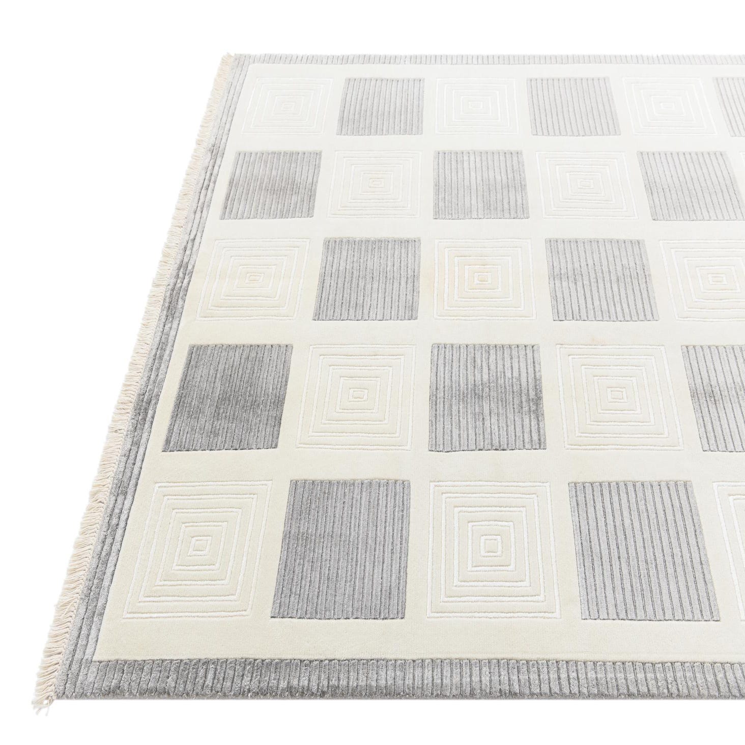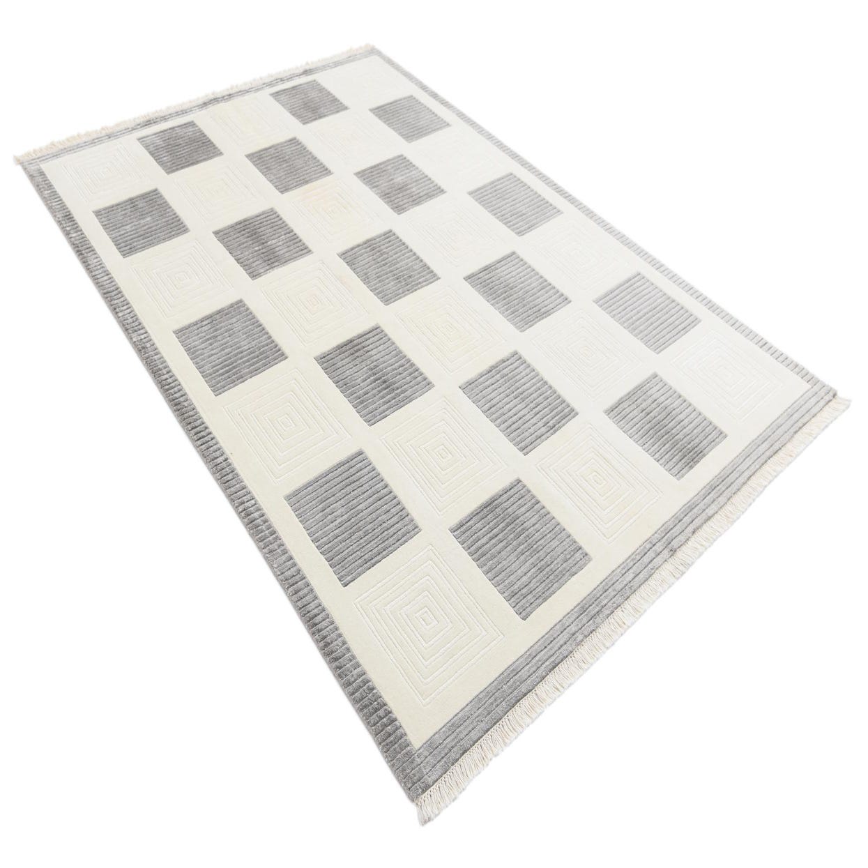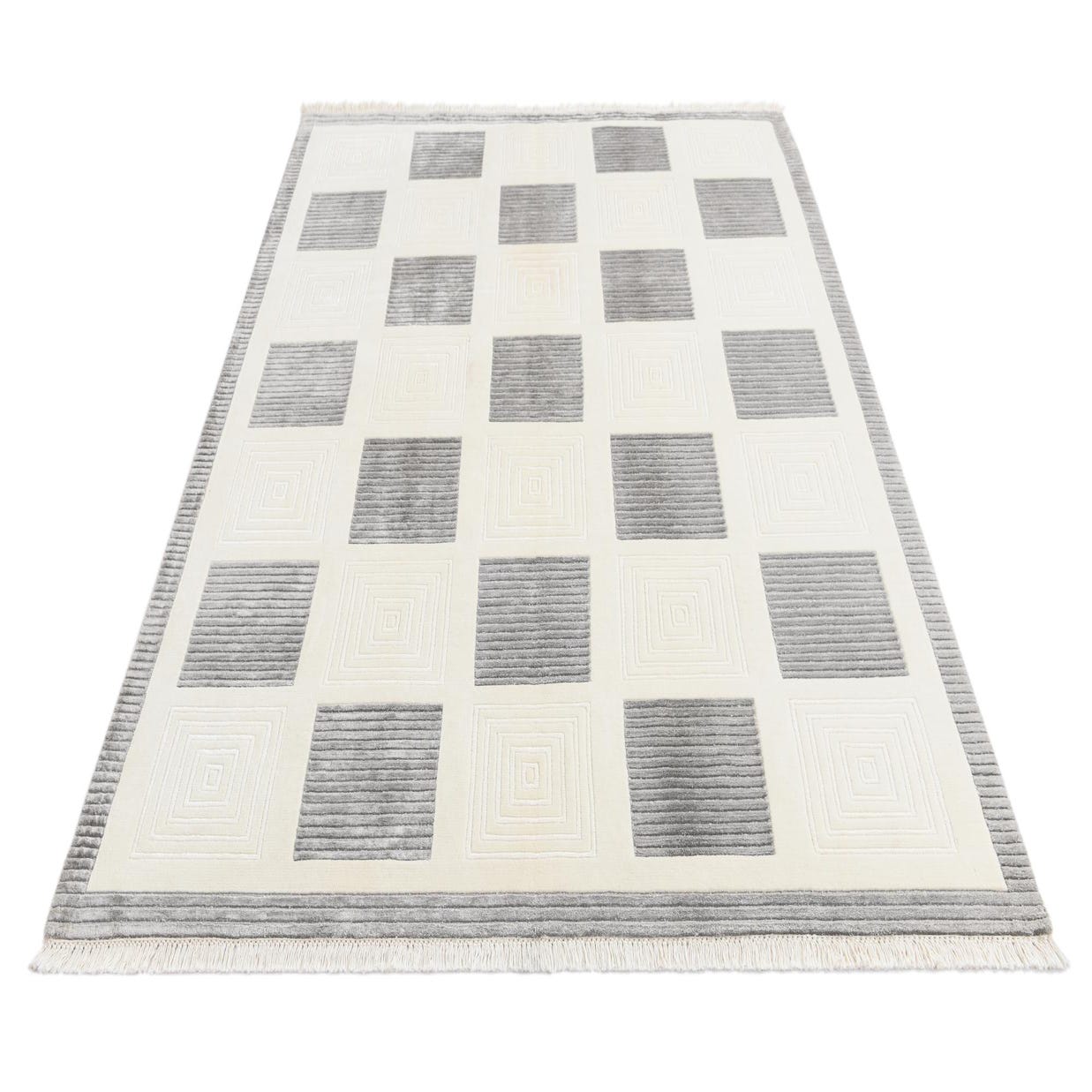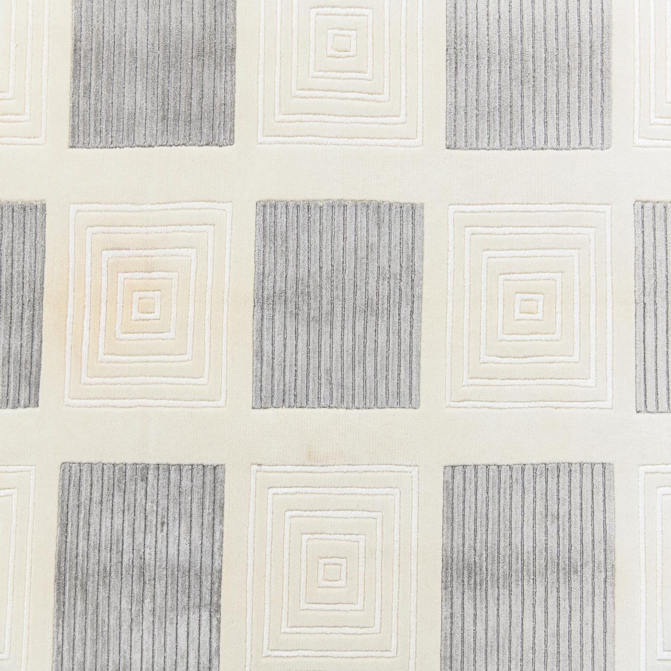 A 5x8 rectangular ivory and gray modern wool rug with a repeating pattern of concentric squares and horizontal stripes.