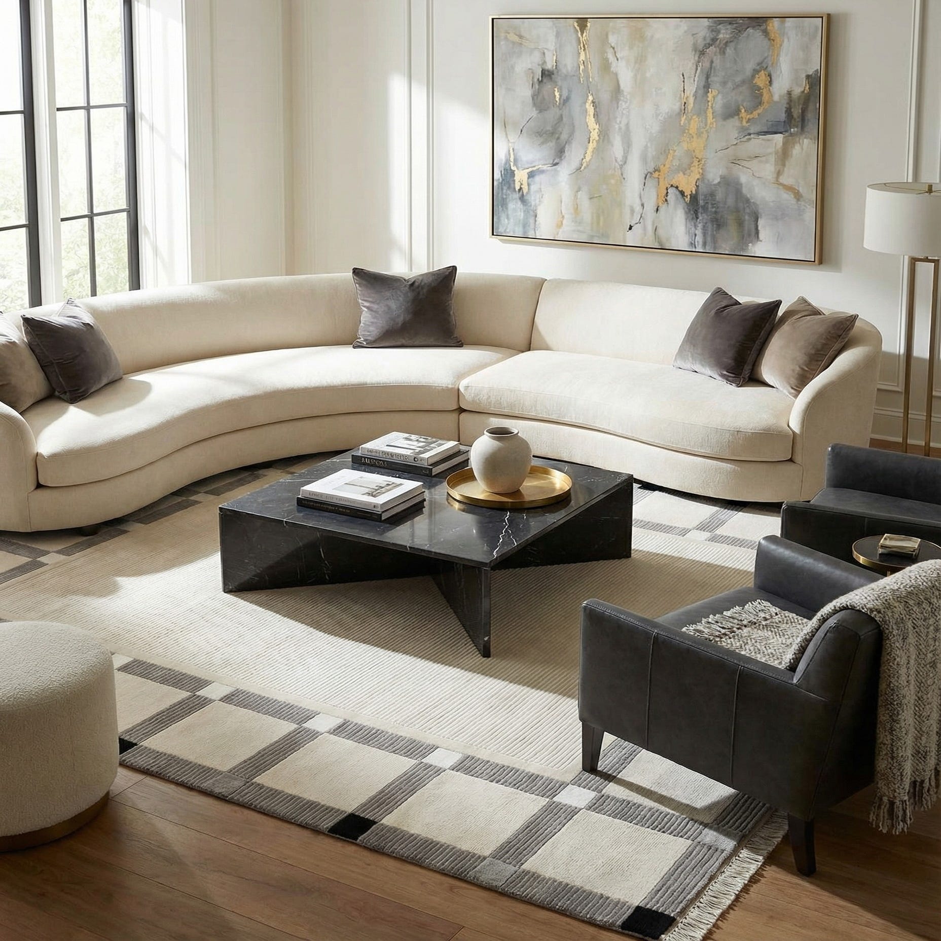 The rug's texture is characteristic of high-quality wool, known for its durability and softness. The modern pattern combined with a palette of calm neutrals makes this rug a well-suited choice for a variety of interior design scenarios, especially those favoring minimalist or modern aesthetics. It can serve as a sophisticated foundation in a living room, study, or bedroom, complementing furniture in rich woods or metals. This piece can also anchor spaces that play with textures, such as those with leather accents or glass elements, to create a harmonious balance.