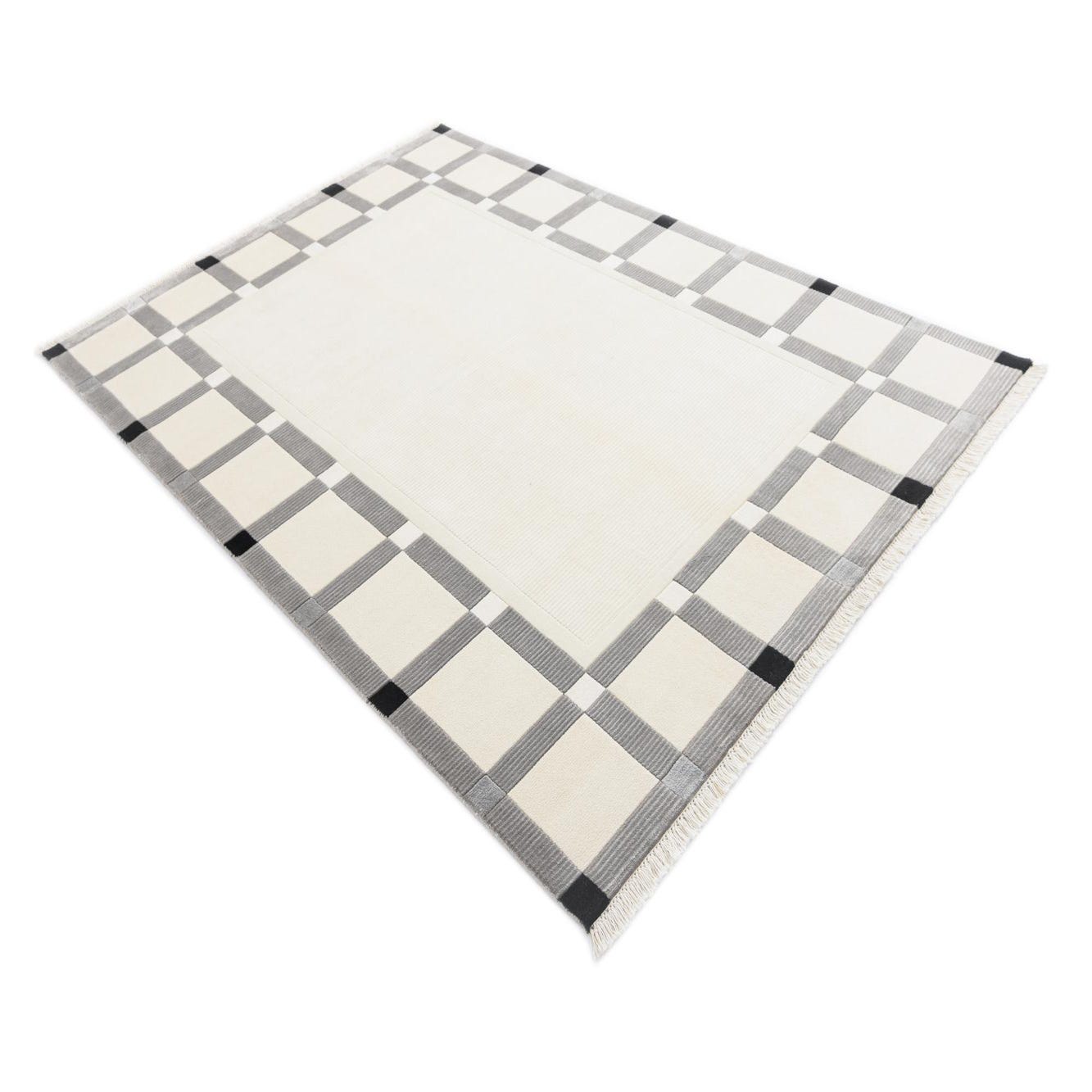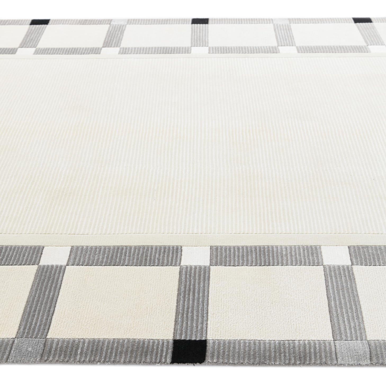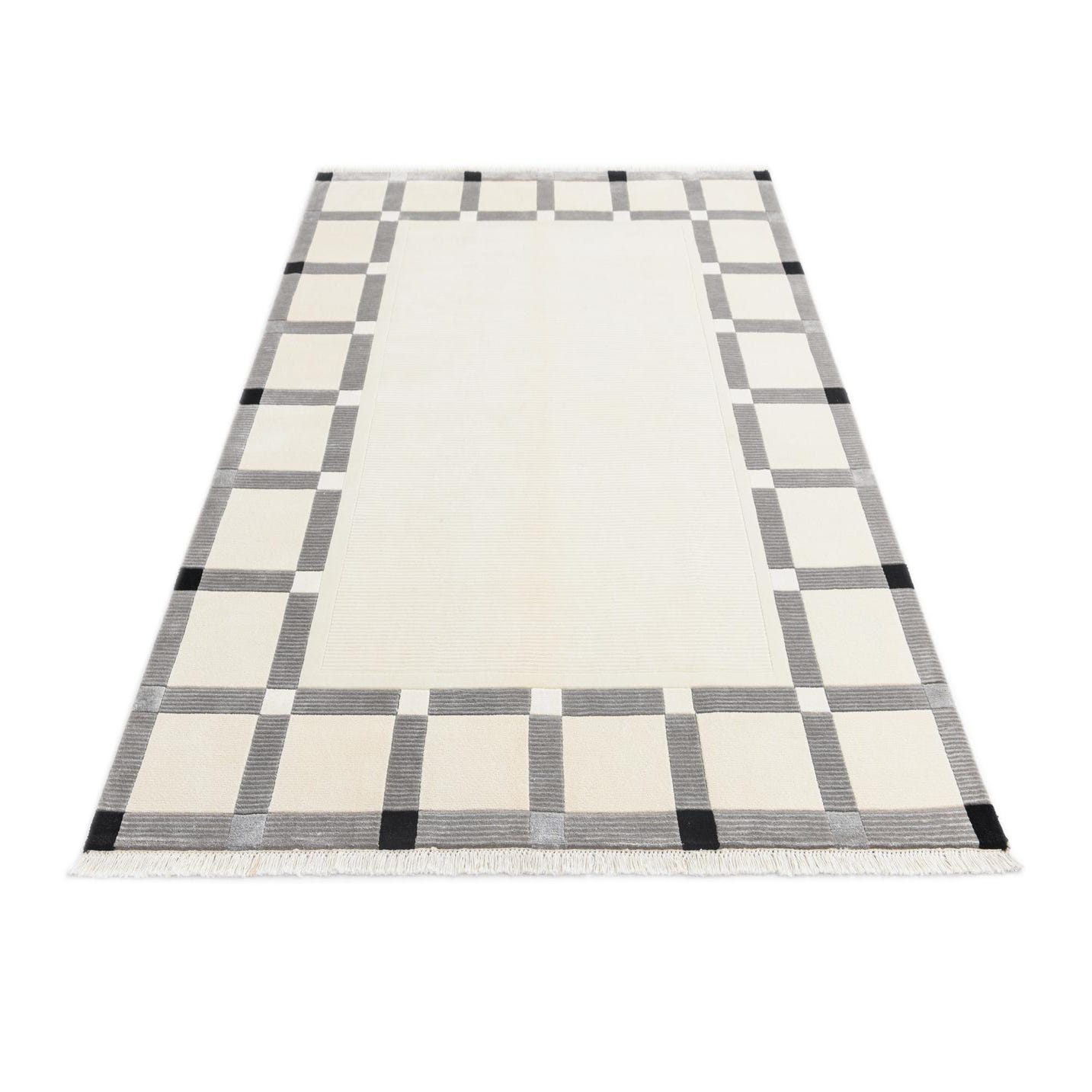 A 5x8 rectangular ivory wool rug with a modern oriental checkered border in gray and black, featuring a high pile.