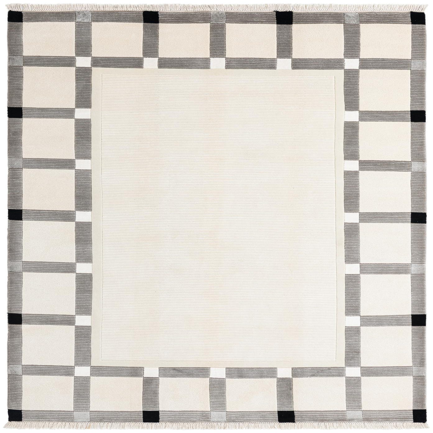 From the Darya collection, this hand-knotted 5x8 rug is crafted with 100% wool, providing a resilient and tactile surface underfoot. It features a contemporary design with a light beige background, bordered by a pattern of beige, gray, ivory, black, and silver blocks that create a clean geometric frame around the rug’s perimeter. The border's symmetry and the subtle contrast of the neutral shades offer a versatile visual appeal.
