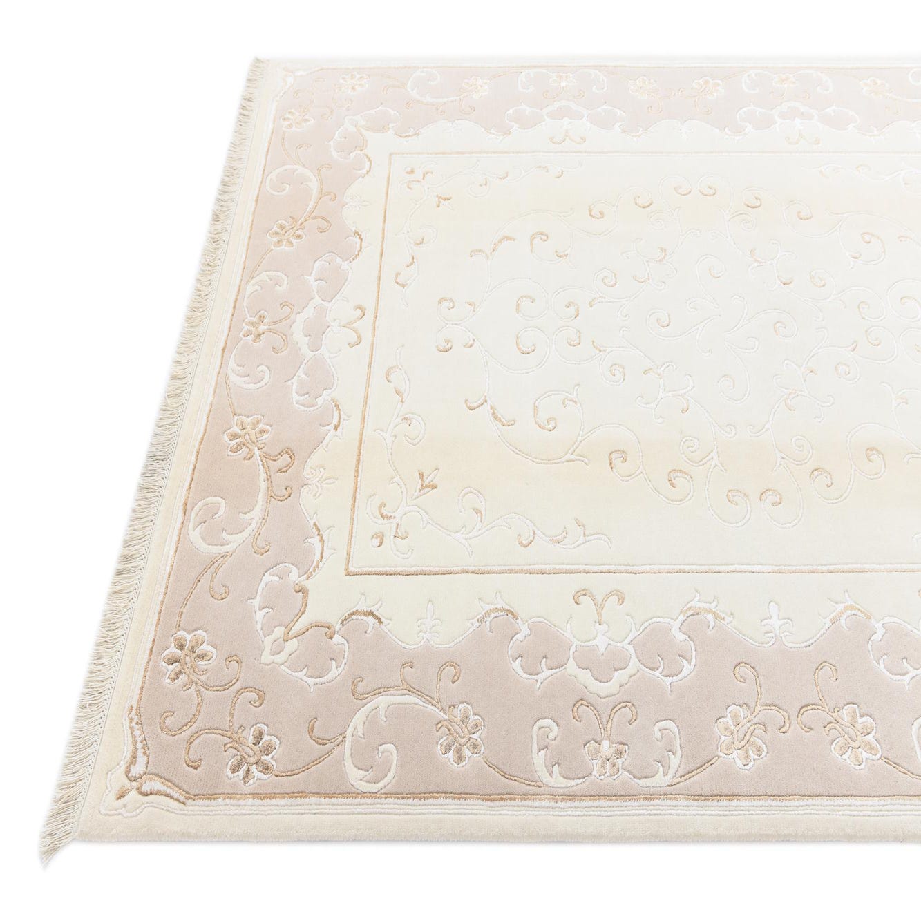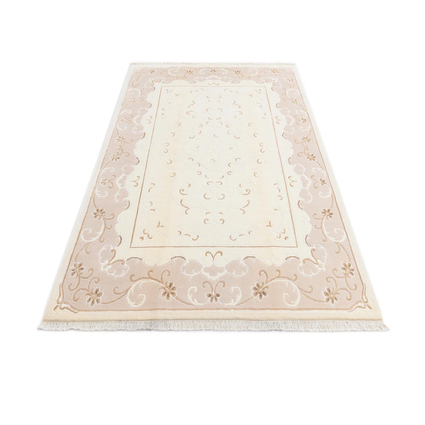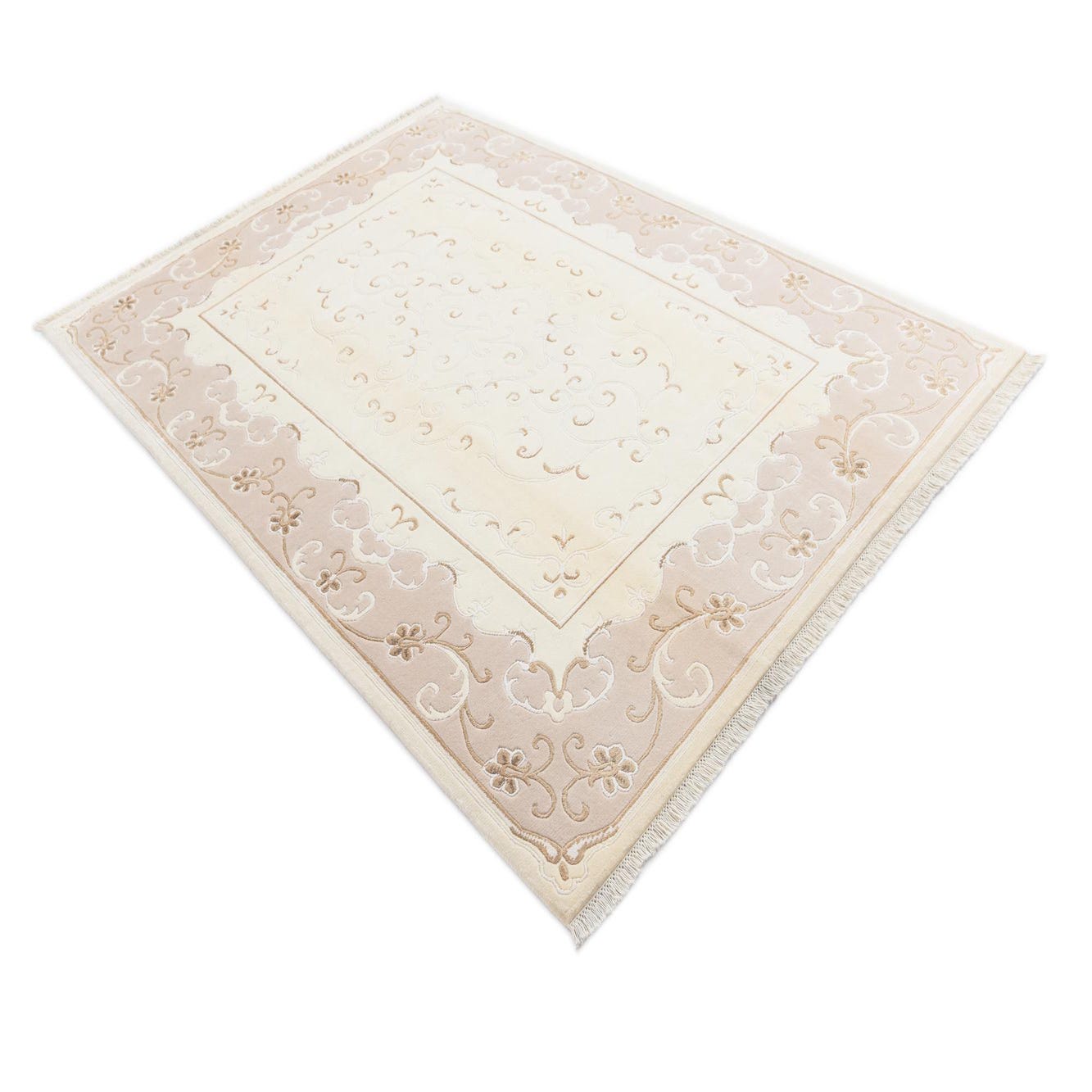 A 5x8 rectangular Darya rug in ivory and cream with an elegant modern oriental pattern and fringe.