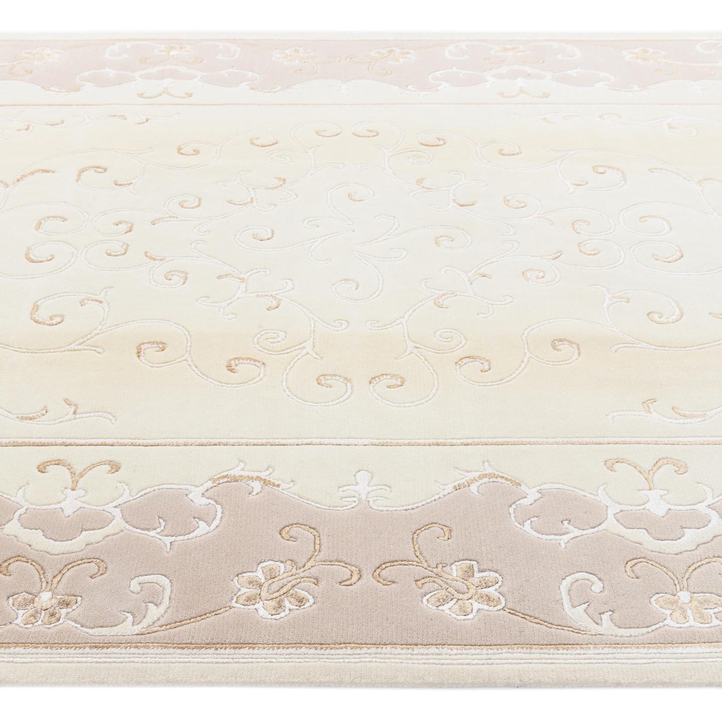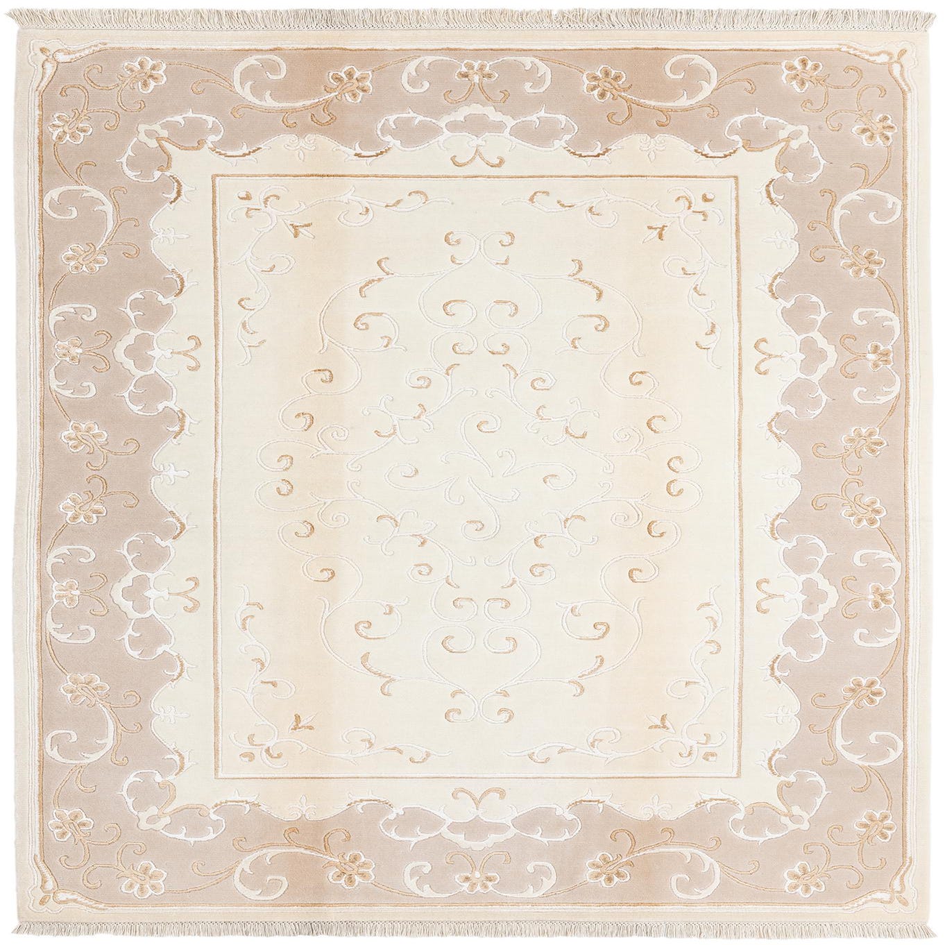 The Darya collection offers a 5x8 hand-knotted rug crafted from a luxurious blend of wool and silk, exhibiting a subtle interplay of Light Beige, Beige, Brown, Ivory, Light Brown, and Tan hues. This piece features an elegant Light Beige background, accented by a sophisticated pattern with floral and scroll motifs which provide a sense of depth and dimension to the design. The texture, a result of the hand-knotted construction, grants a plush feel underfoot, indicative of the quality materials and craftsmanship.