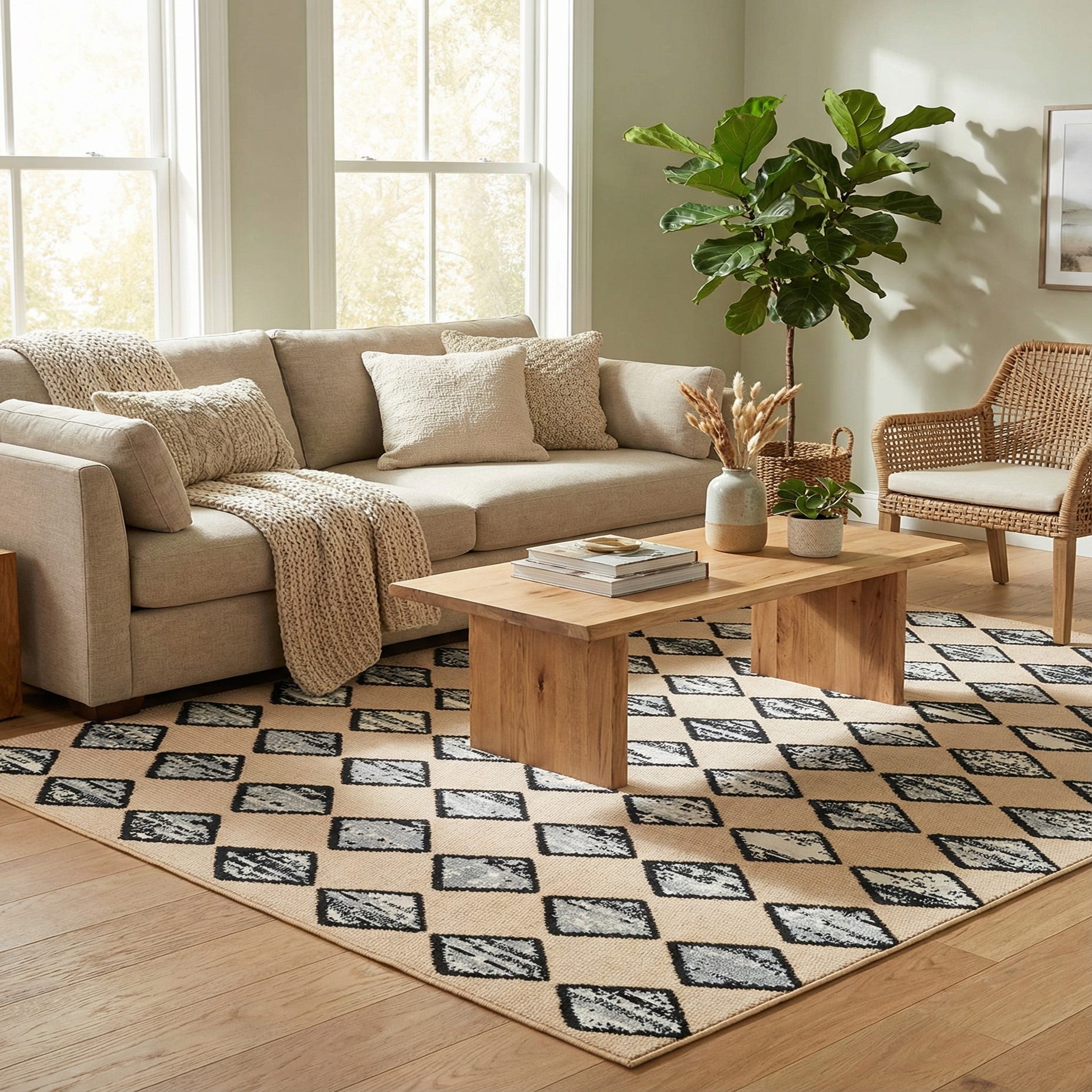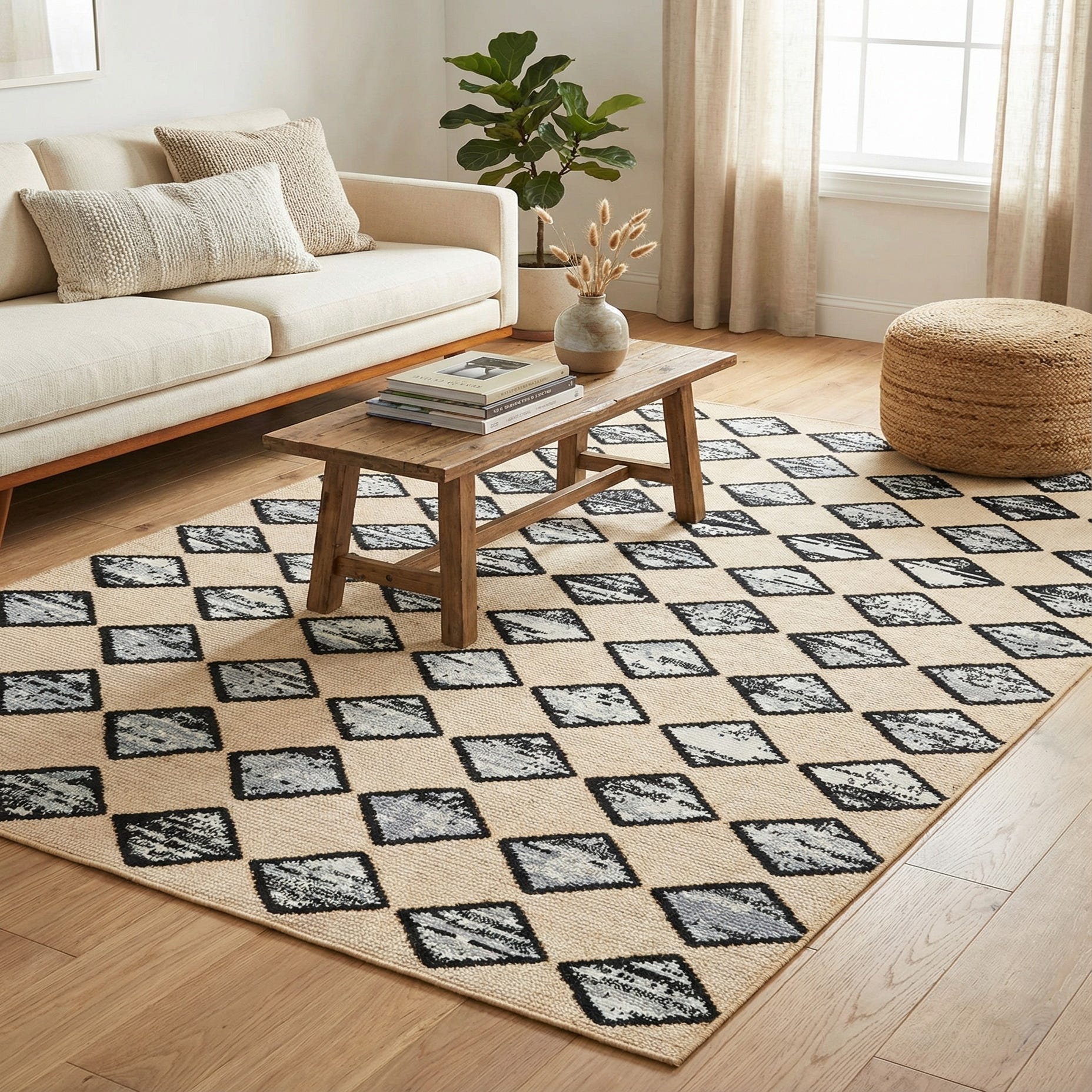 A 5x8 rectangular indoor/outdoor rug with a modern pattern of distressed black and white diamonds on an ivory background.