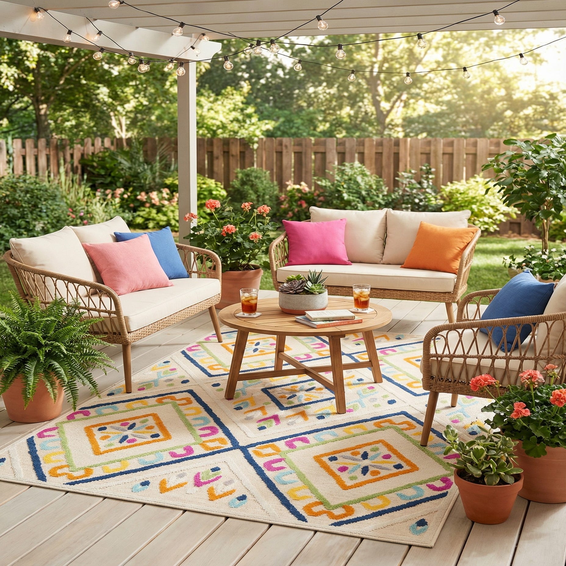 This lively, color-forward design pairs easily with natural materials—think rattan seating and linen cushions on a covered patio—or layered into a casual living room with light wood furniture for an upbeat, modern look. It also works well in a bright breakfast nook or playroom where the cheerful motifs can tie together mixed textiles and painted accents.