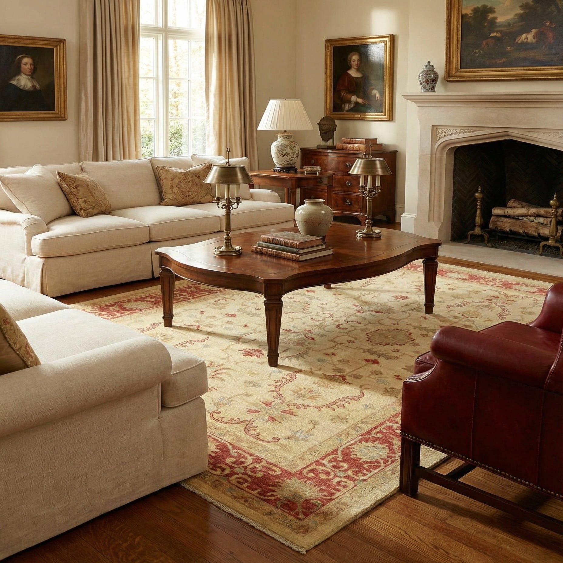 Ideal placements for this rug could include a formal living room, where it could serve as a sophisticated foundation for seating arrangements, a dining room beneath a classic wooden table, or even an office where it would underpin the room's decor with a touch of understated luxury. The rug's hand-knotted wool construction also suits rooms where comfort and authenticity are appreciated.