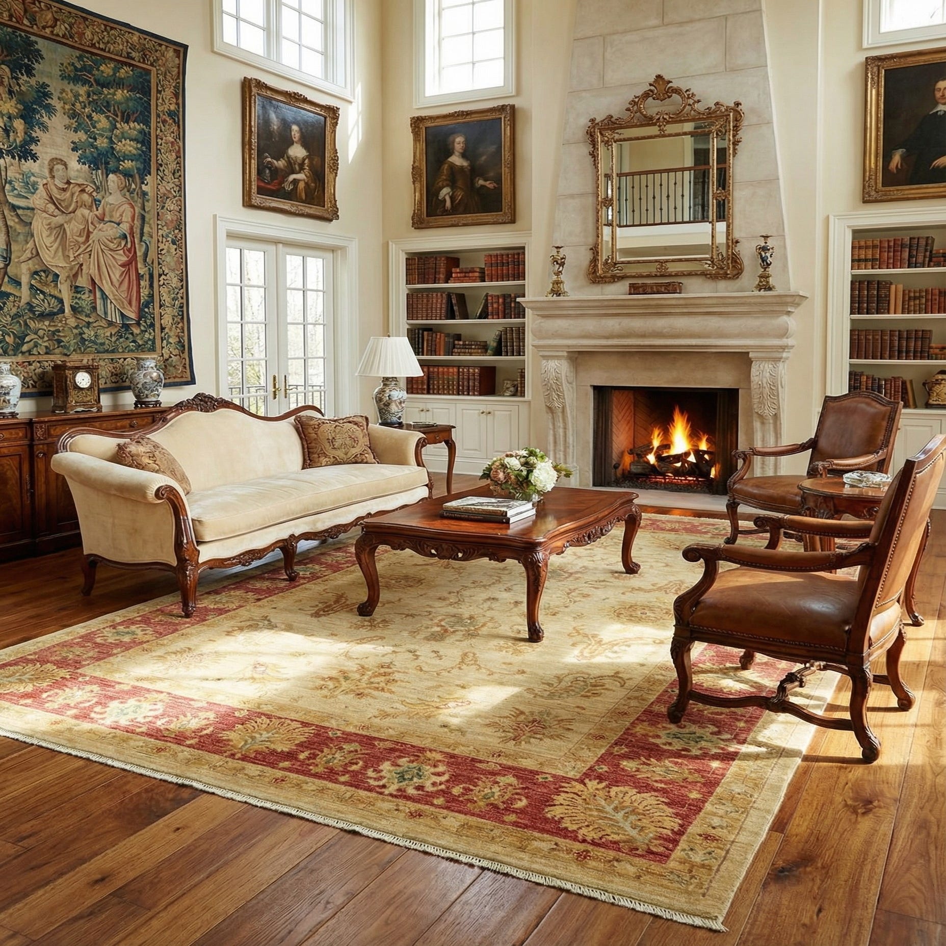 This rug works well beneath a living room seating group to ground warm wood tones or a leather sofa, or placed under a dining table to add quiet pattern and color. Its neutral base and restrained color accents suit traditional, transitional, or cottage-inspired interiors; pair it with linen upholstery, painted cabinetry, or brass accents to bring out the gold and green details, or echo the red border with pillows or a throw for a coordinated look.