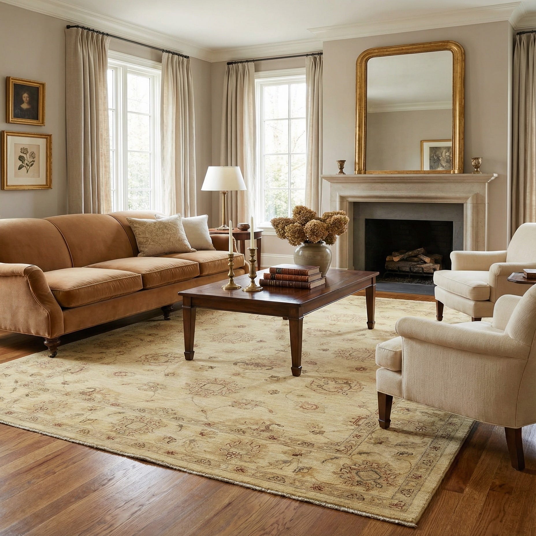 A 6x9 rectangular ivory Peshawar Ziegler wool rug with traditional botanical and tribal patterns, perfect for a living room.