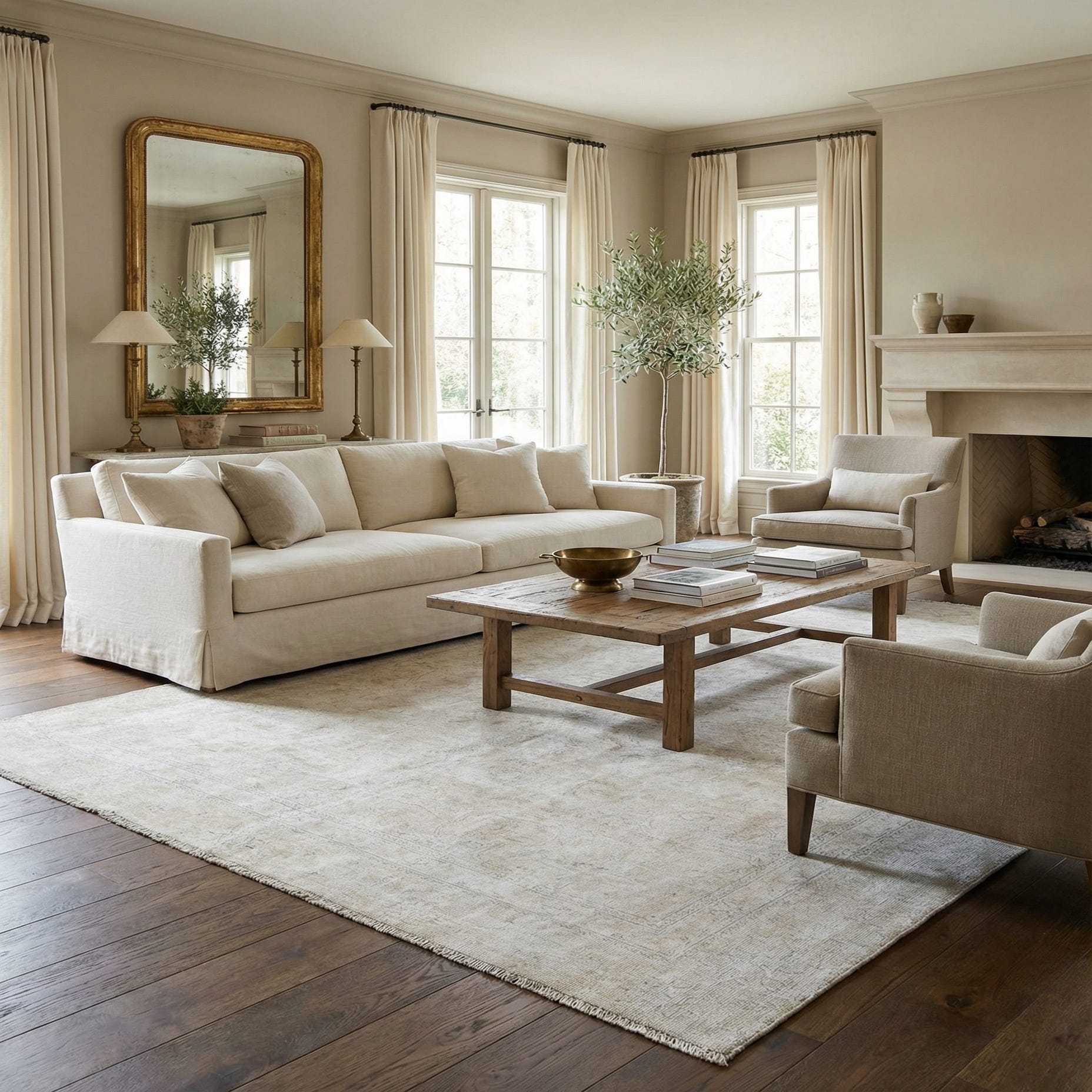 A 6x9 rectangular ivory and cream Persian-style wool rug with a subtle medallion pattern, suitable for a living room.