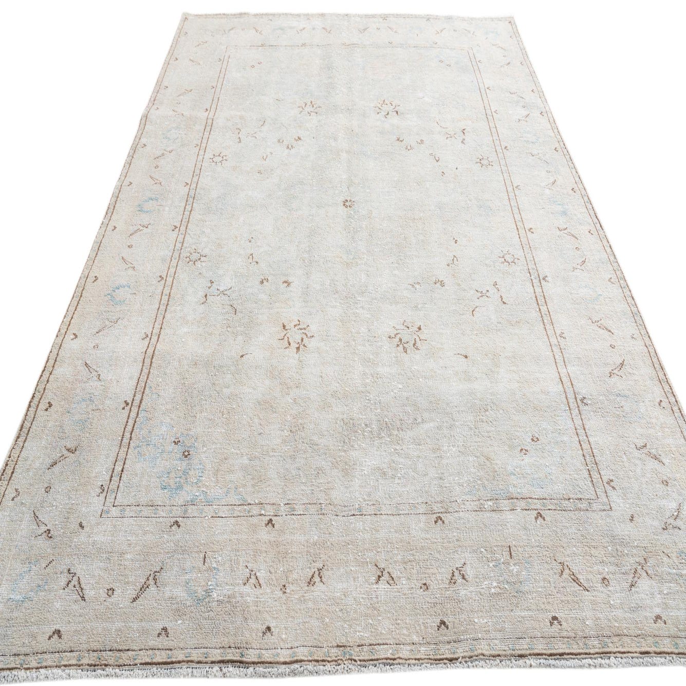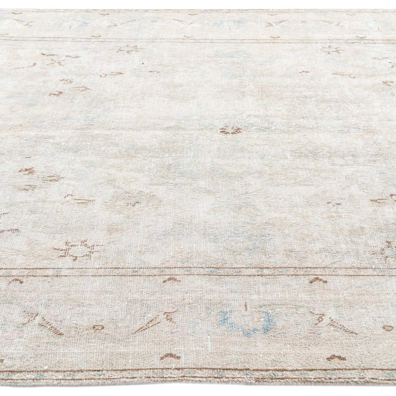 A 6x9 rectangular ivory and cream Persian-style rug with subtle blue and brown vintage patterns, ideal for a living room.