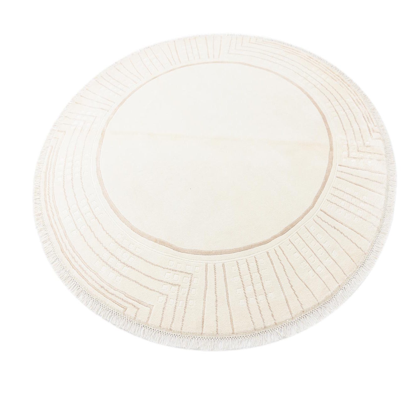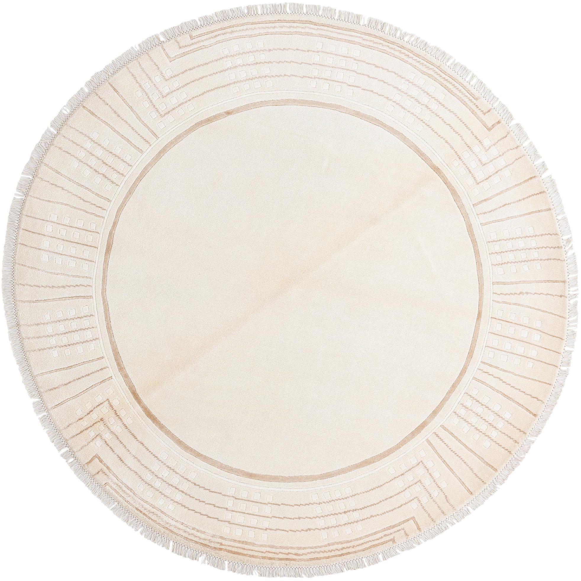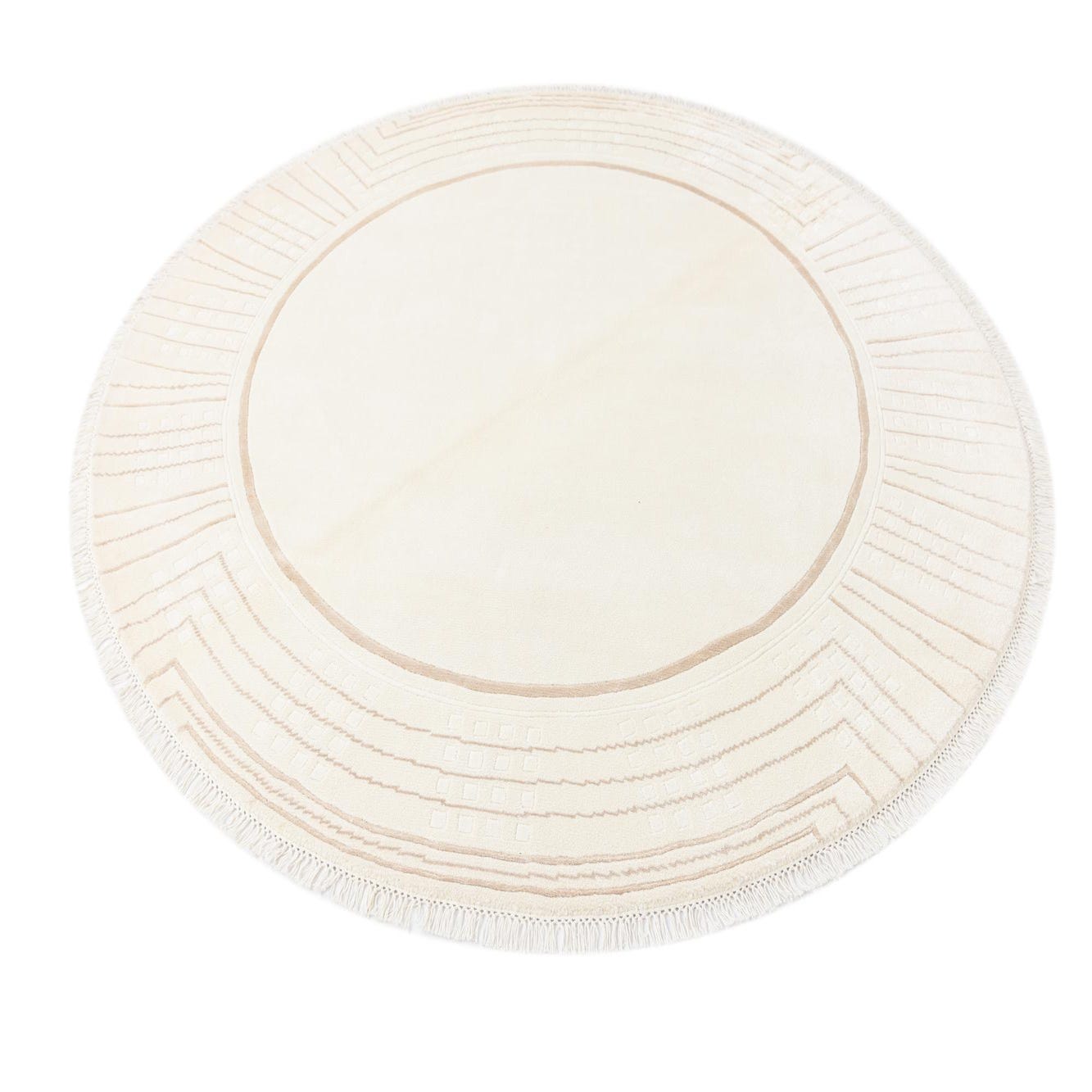 A 6' 7 round ivory rug with a modern oriental pattern in cream and beige, featuring a high pile and fringe.