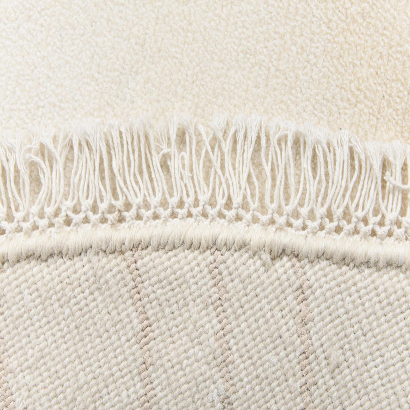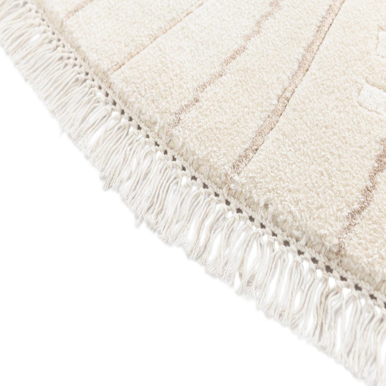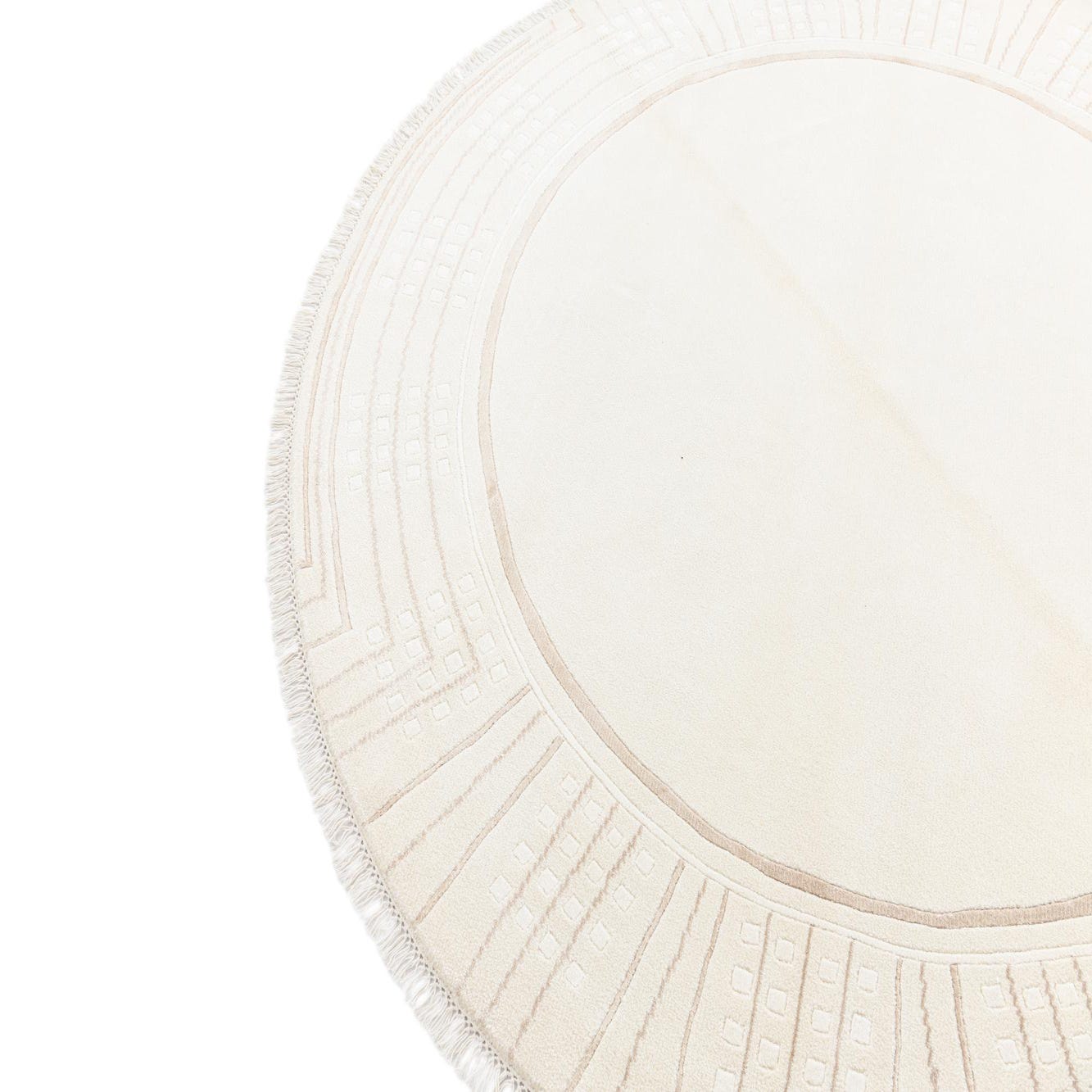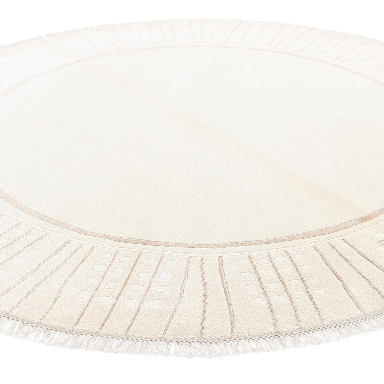 A 6' 7 round ivory rug with a modern oriental pattern in cream and beige, featuring a high pile and fringe.