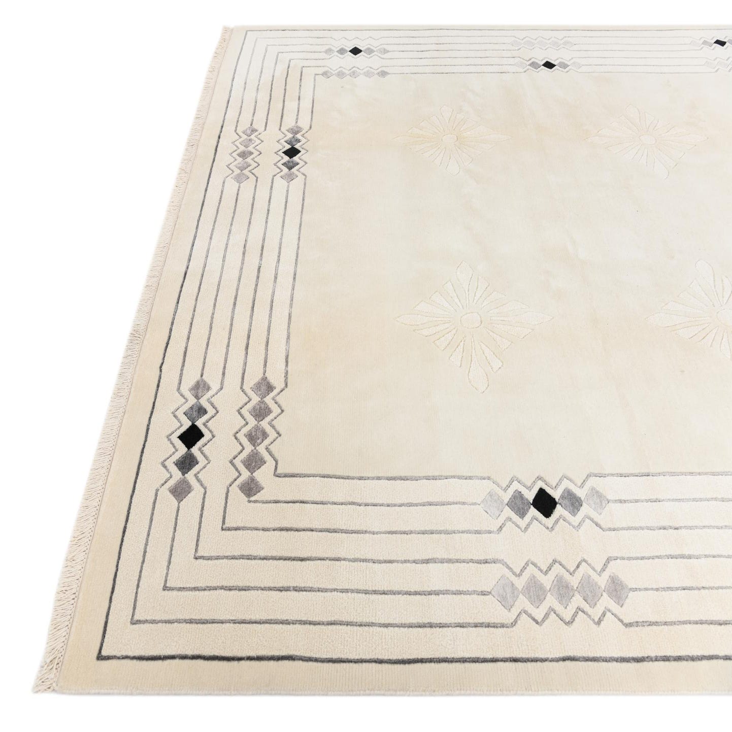 The Darya collection presents a refined 7x10 hand-knotted rug crafted from 100% wool, offering a durable and plush texture underfoot. This piece features a light beige background, tastefully complemented by a spectrum of neutral colors including beige, cream, gray, and black. The design has a modern, geometric edge with a series of linear and chevron motifs bordering the rug, punctuated by bold black diamond shapes that add a striking contrast. Subtle starburst patterns are distributed across the field, providing an element of sophistication and visual interest without overpowering the design.
