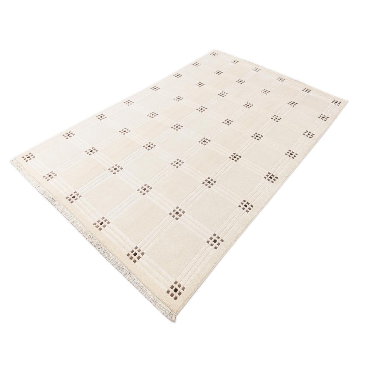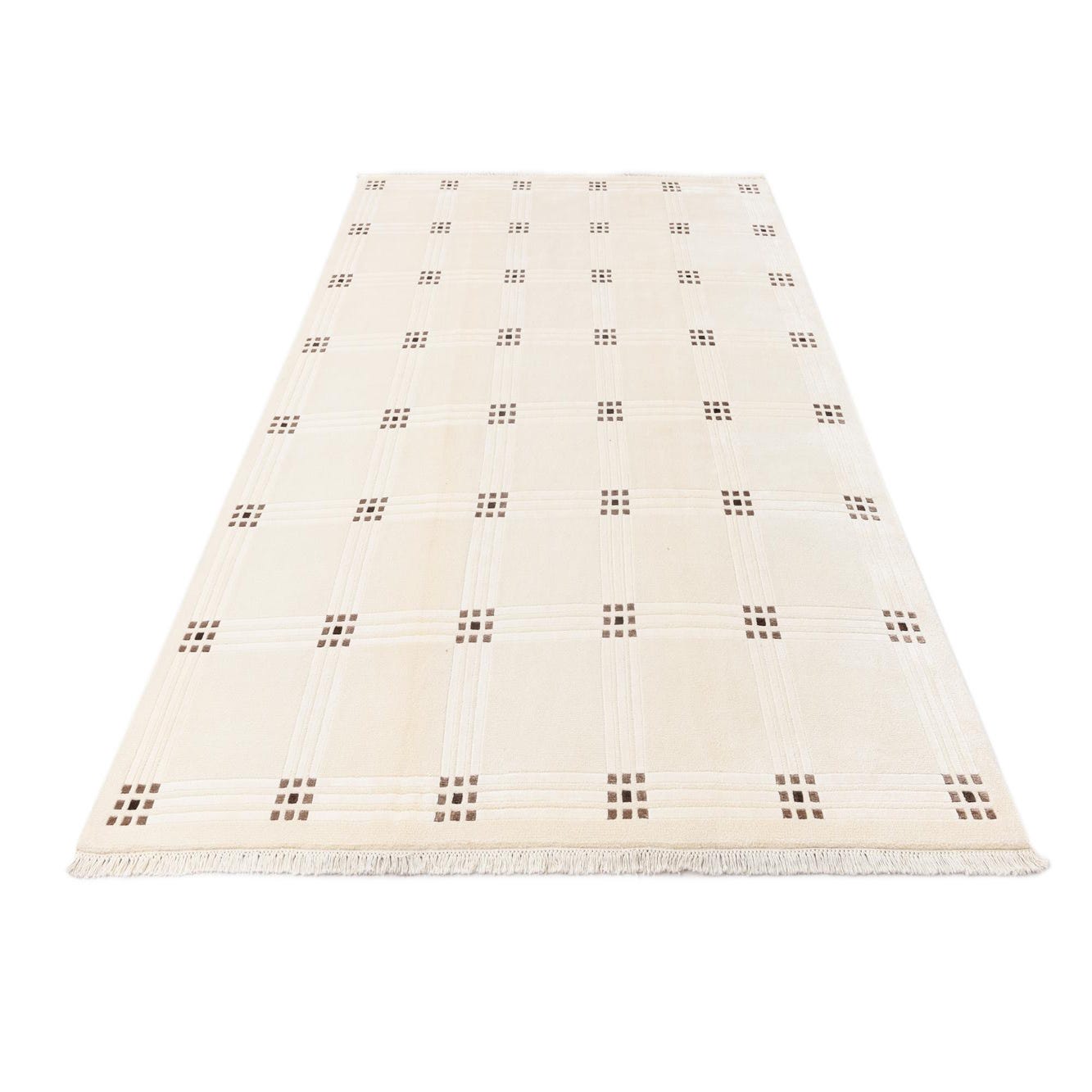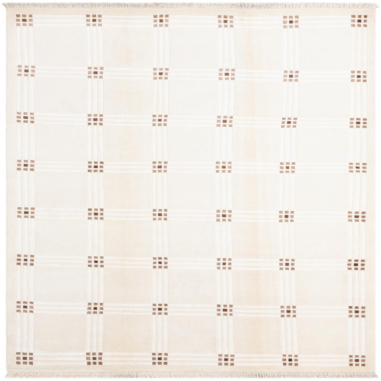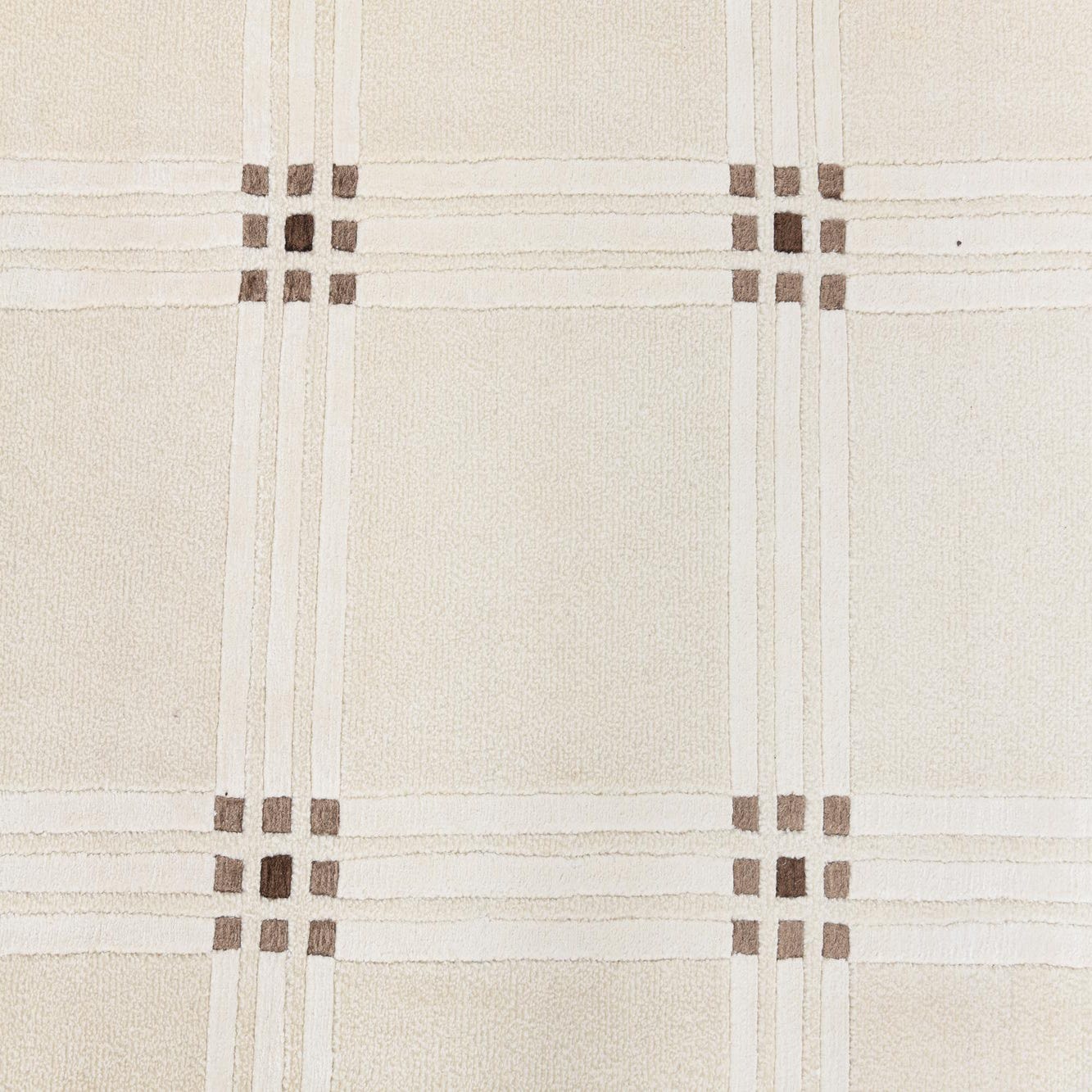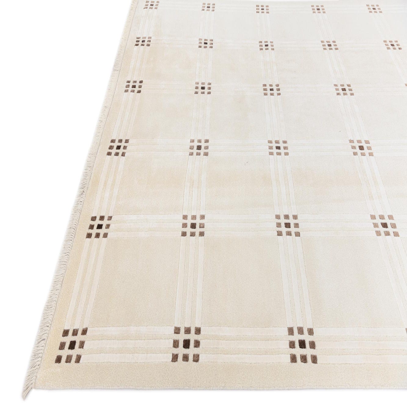 A 7x10 rectangular ivory wool rug with a modern grid pattern featuring thin white lines and small brown squares.