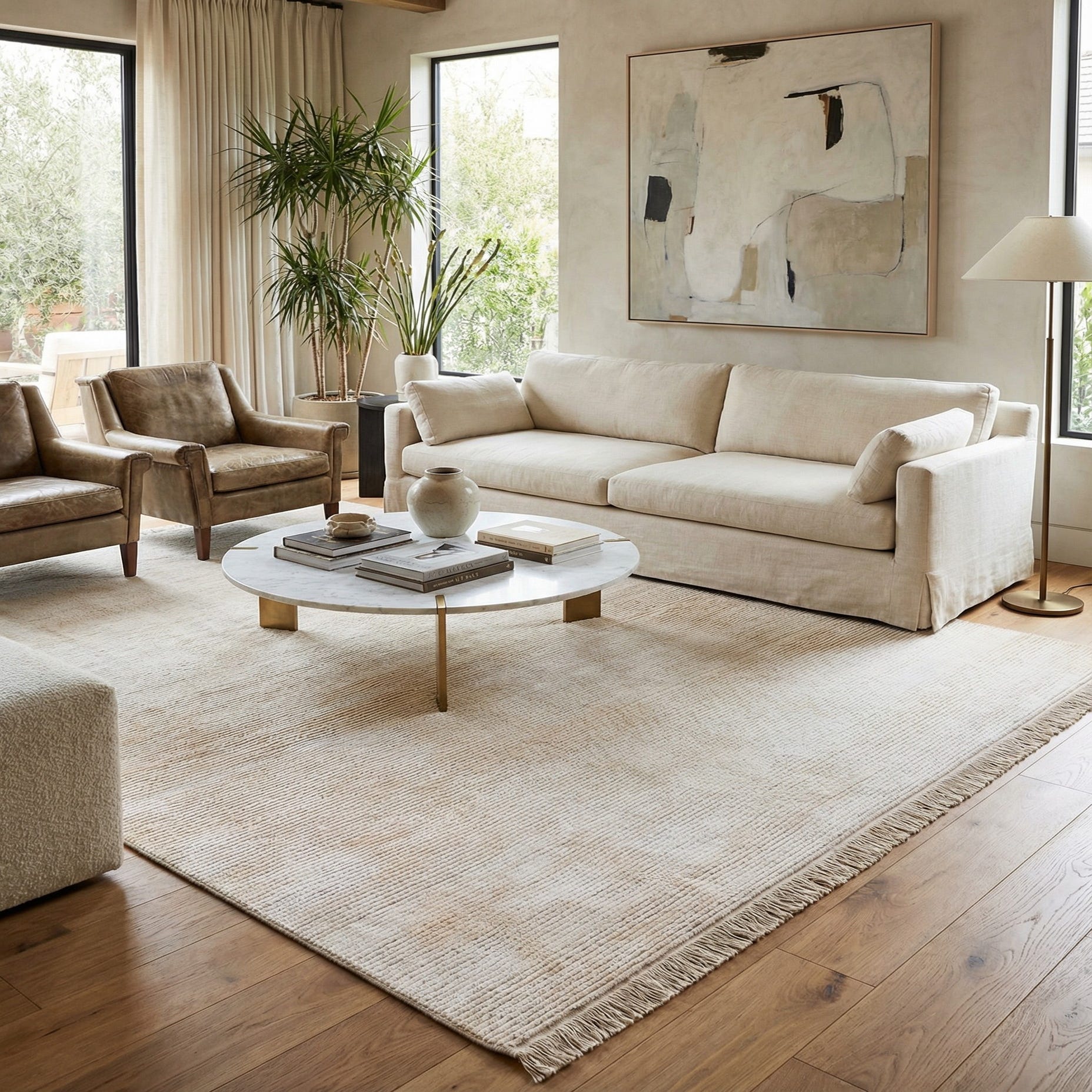 A 7x10 rectangular Darya rug in ivory and cream, featuring a subtle modern striped pattern and fringed edges, suitable for a living room.