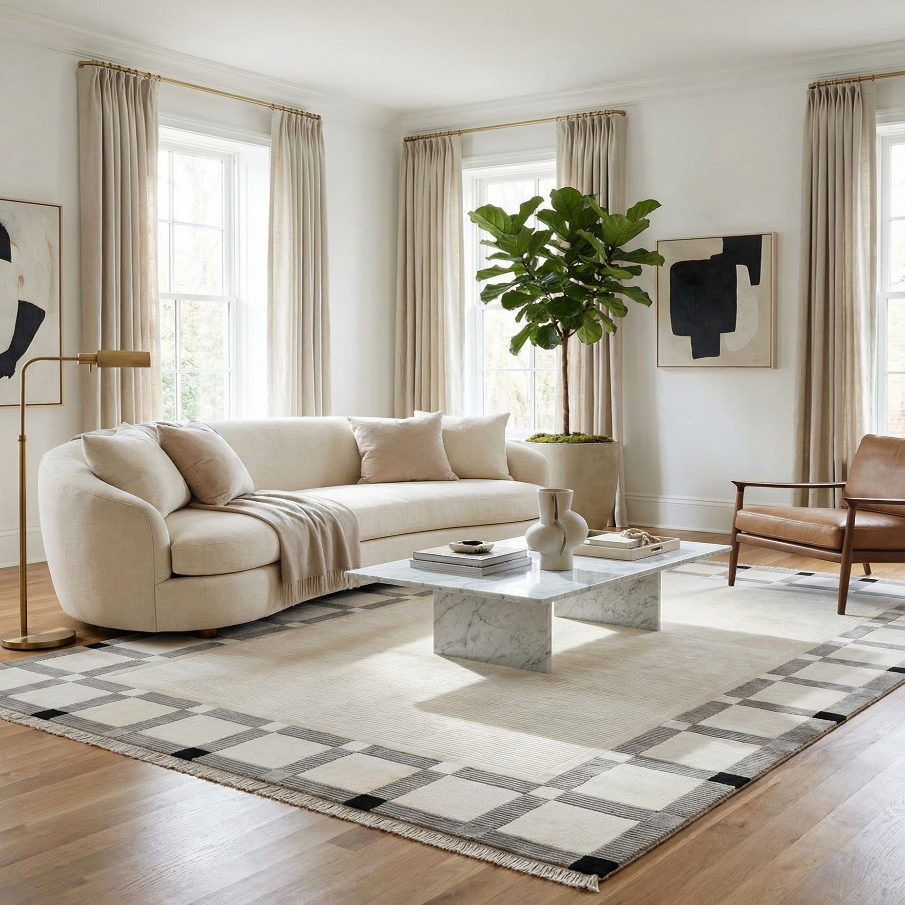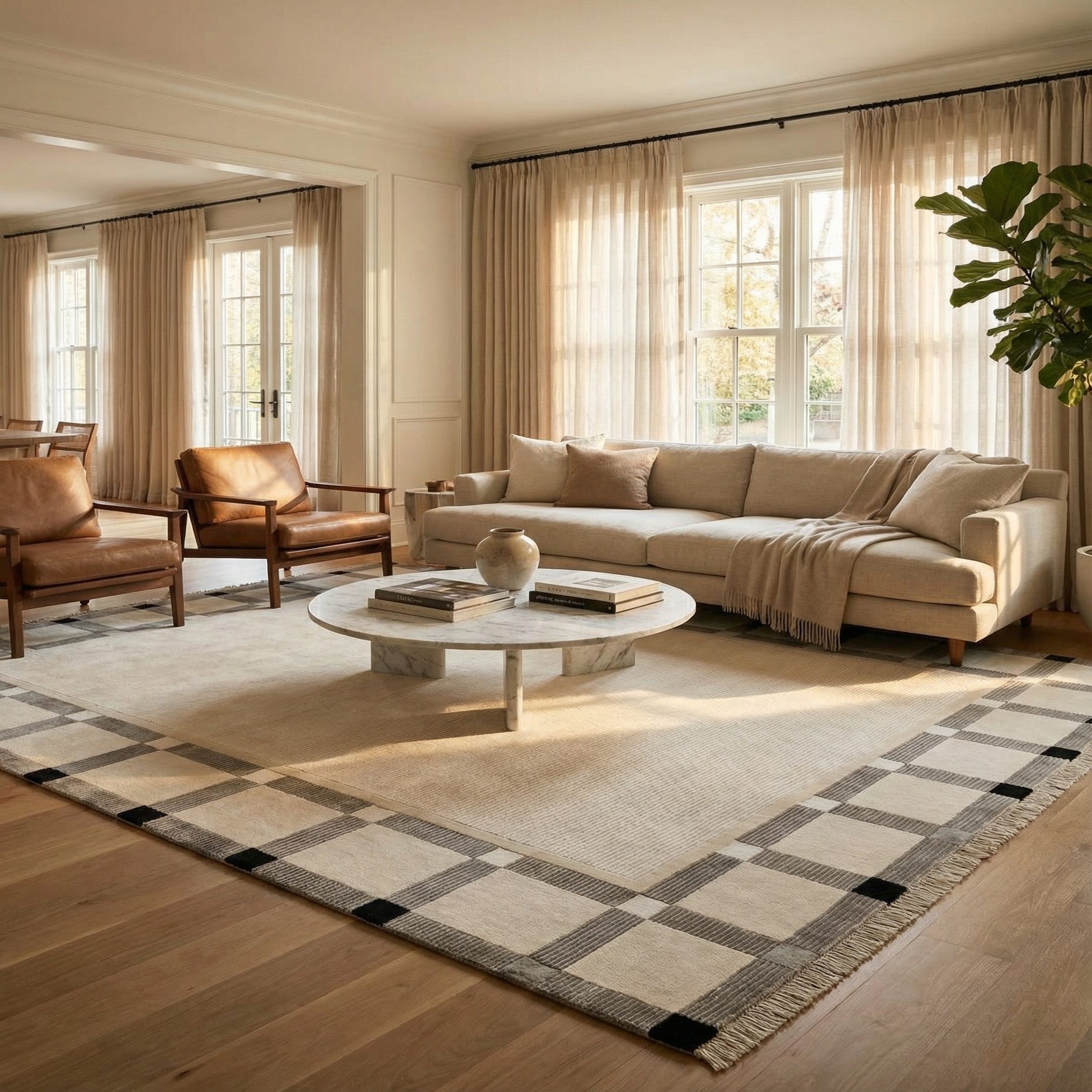 A 7x10 rectangular ivory wool rug with a modern geometric border featuring gray and black squares.