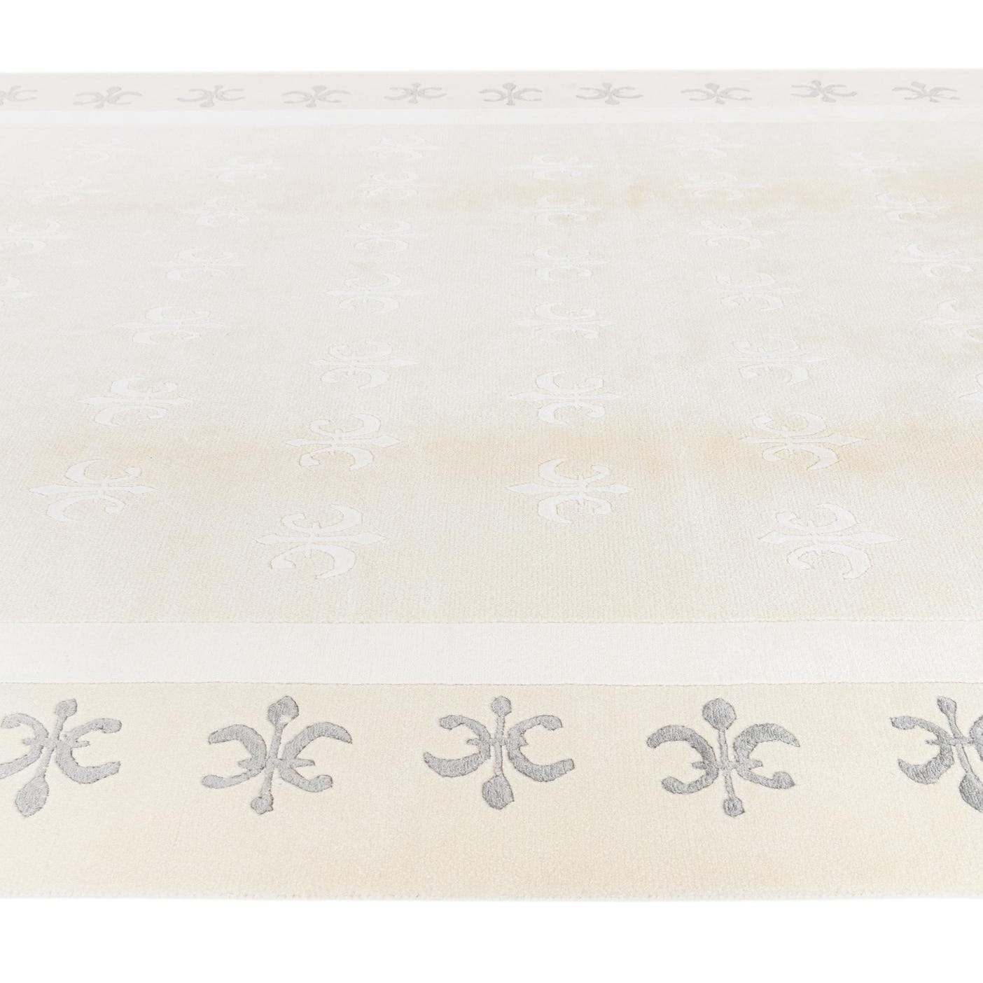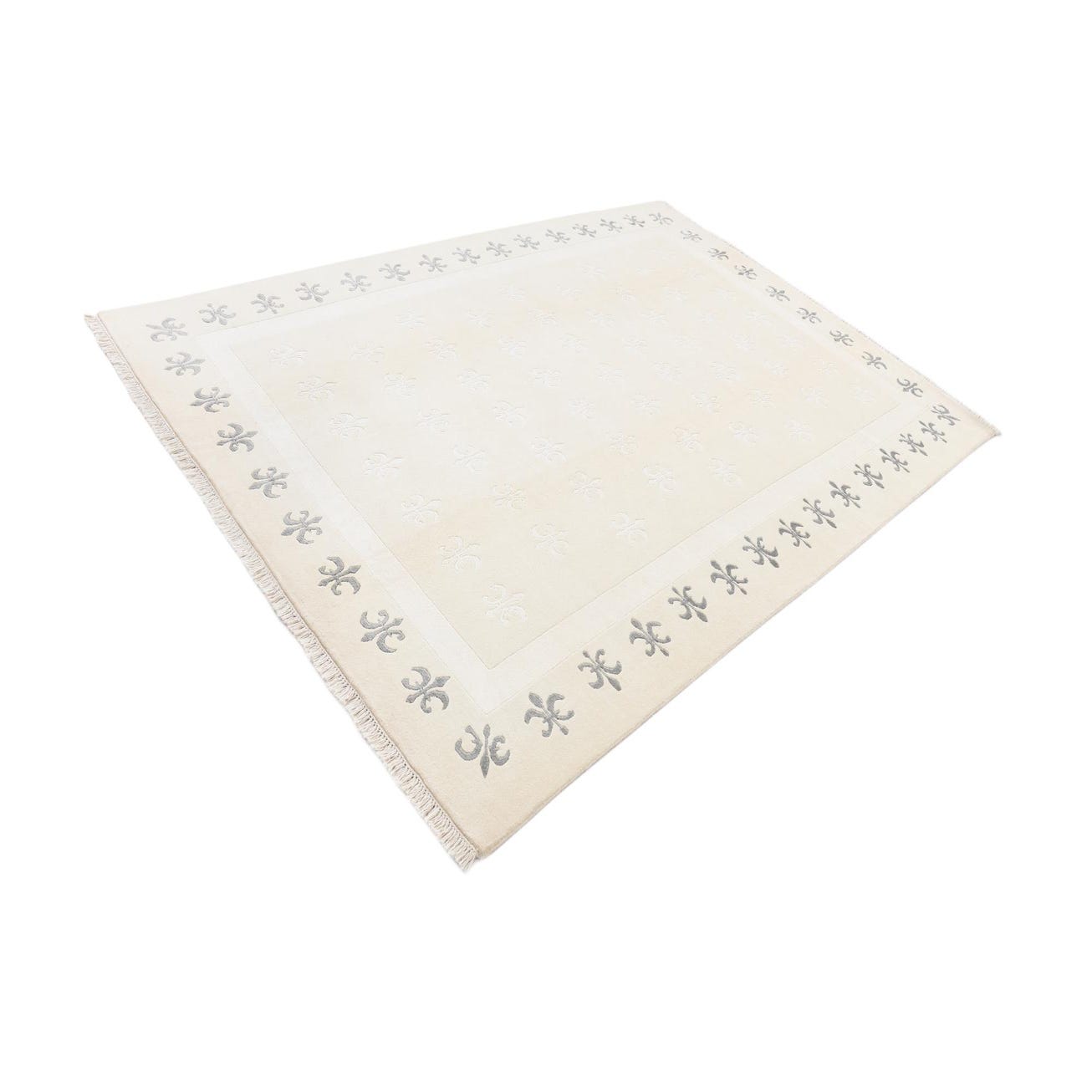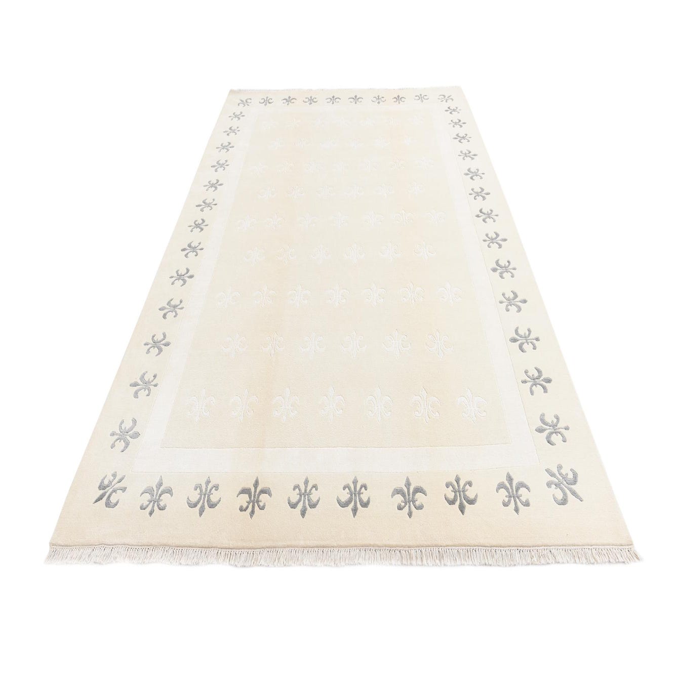 A 7x10 rectangular ivory wool rug with a subtle cream fleur-de-lis pattern and a light gray border.