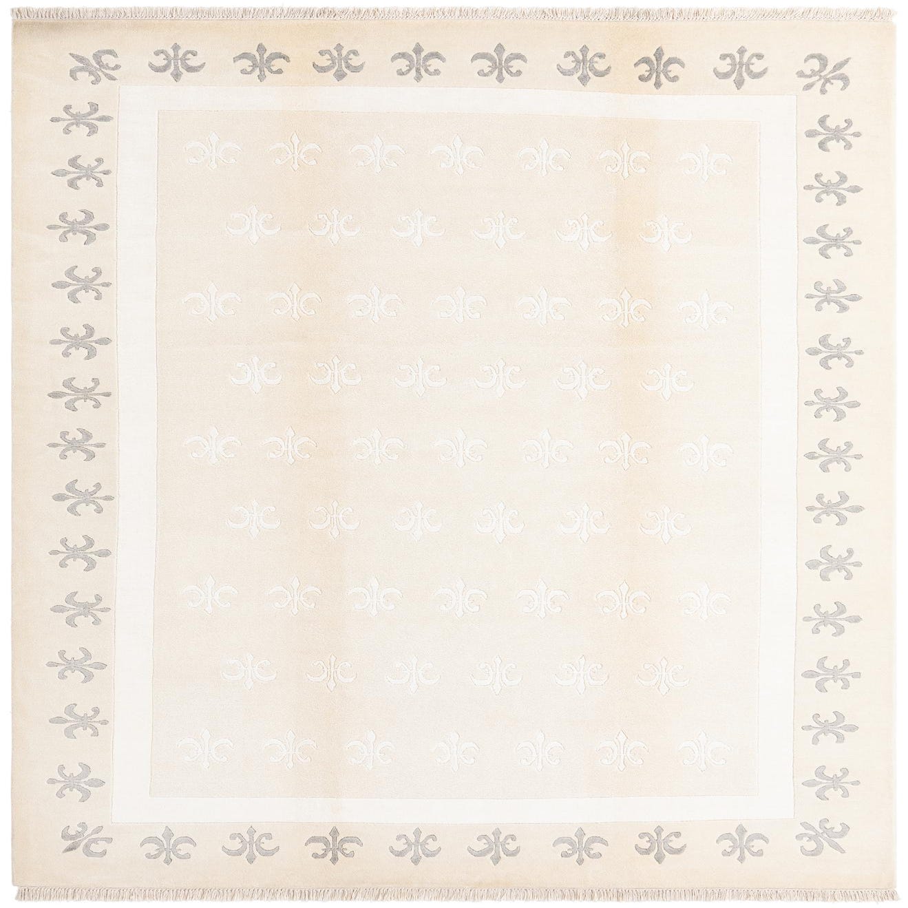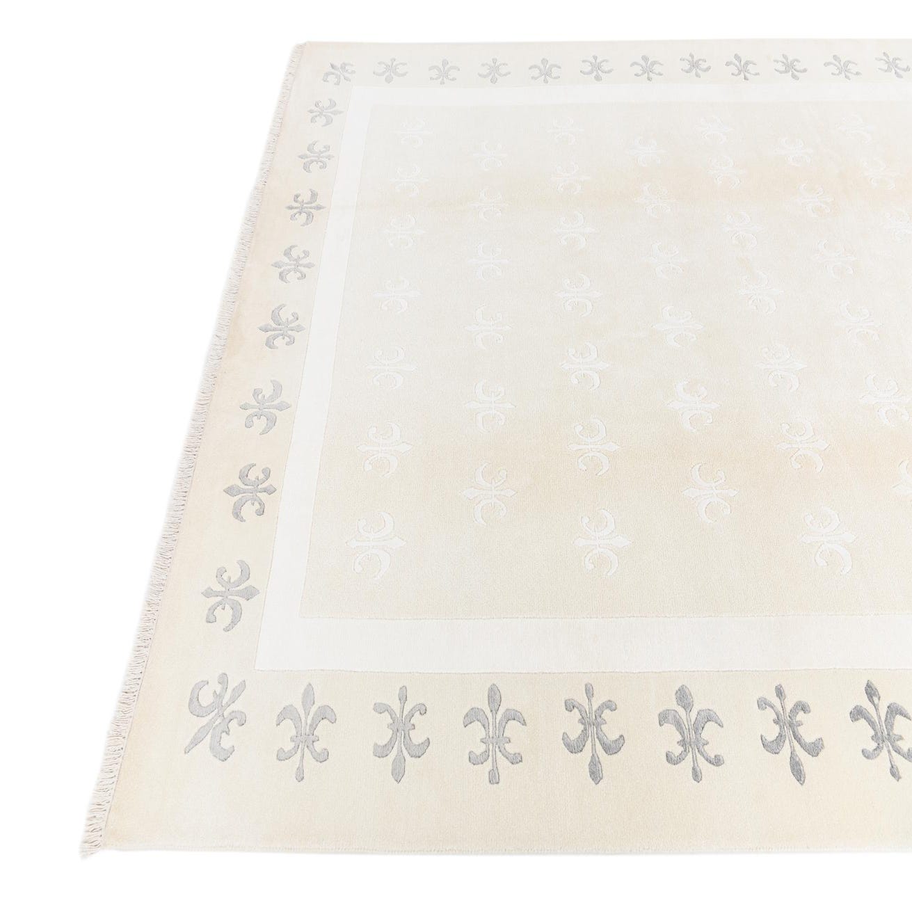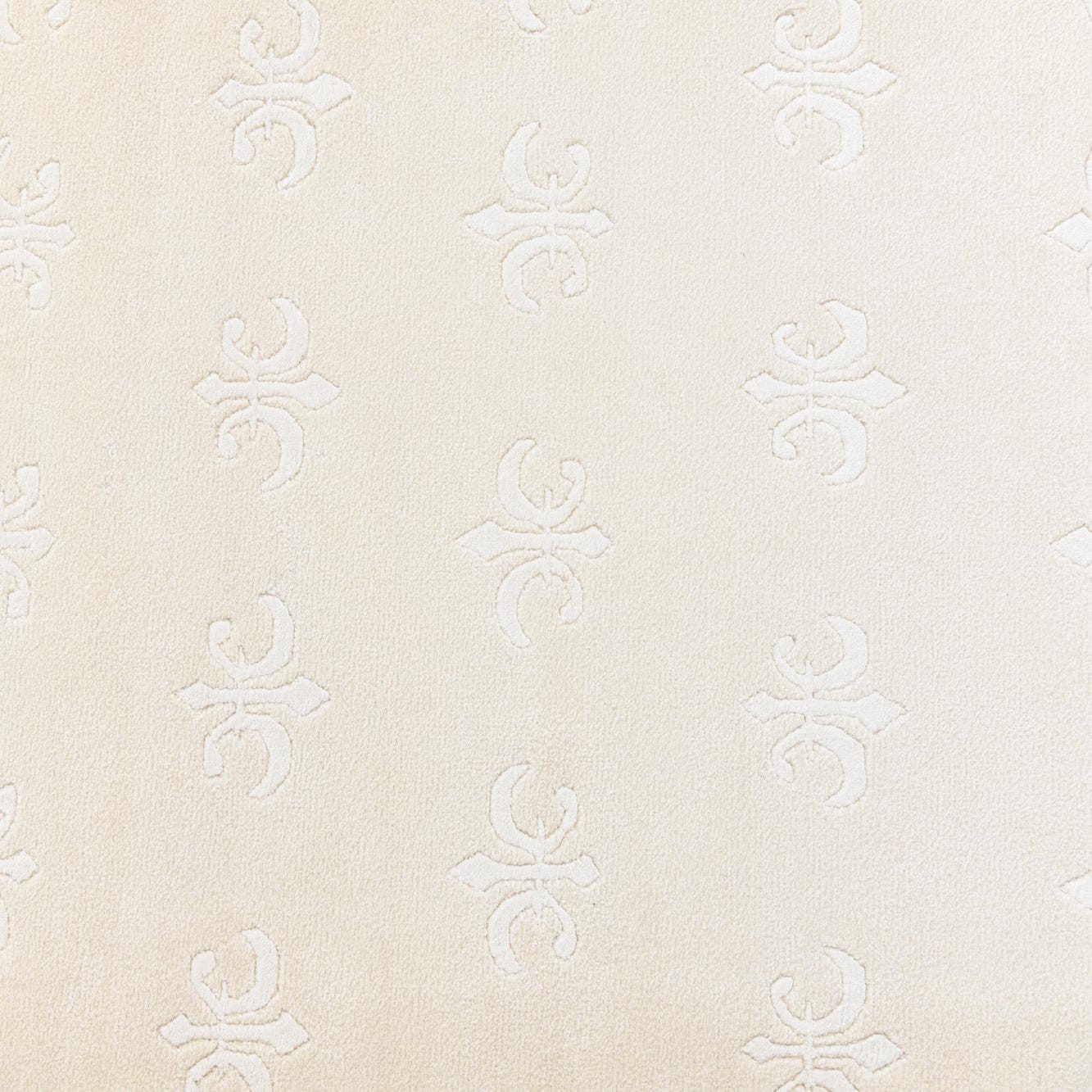 A 7x10 rectangular ivory wool rug with a subtle cream fleur-de-lis pattern and a light gray border.