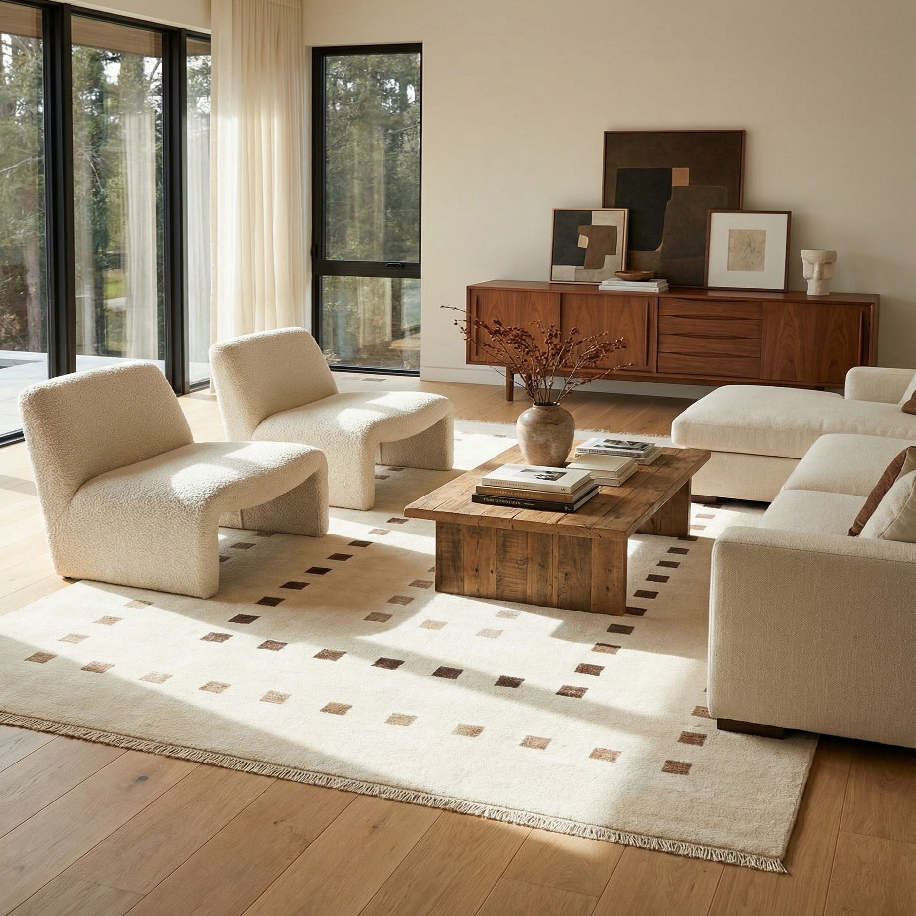 A 7x10 rectangular ivory wool rug with a modern geometric pattern of varying brown squares forming a large central rectangle.