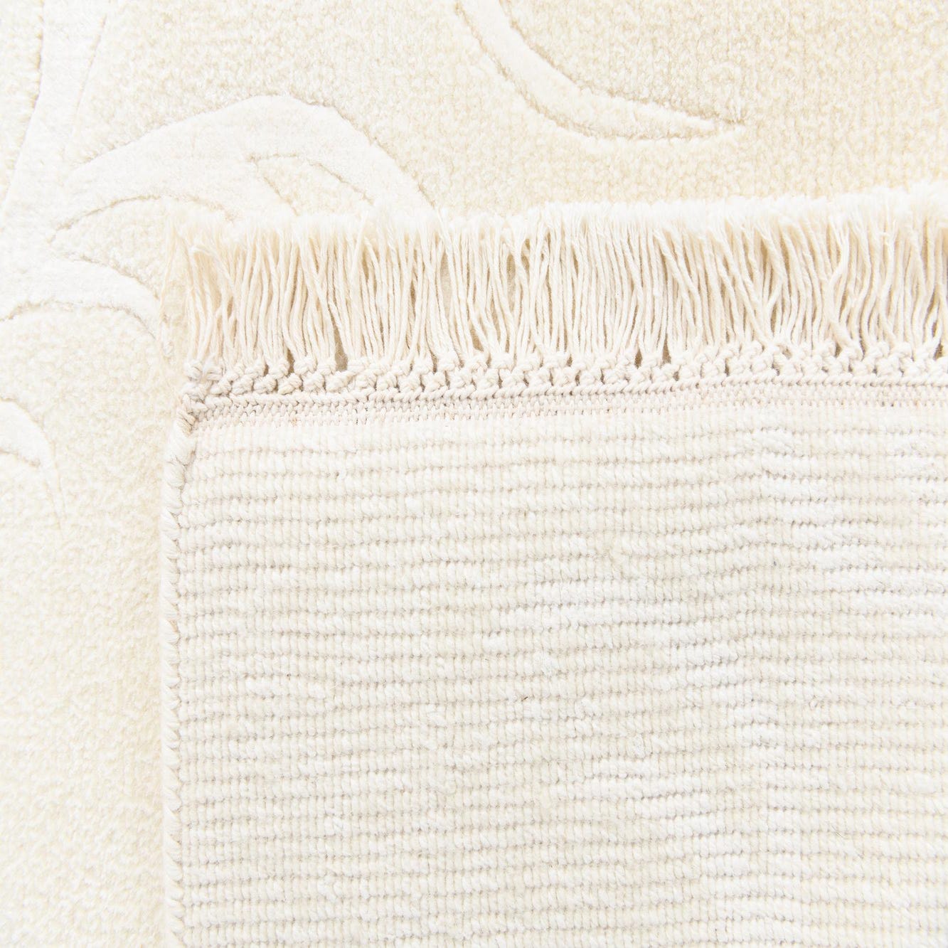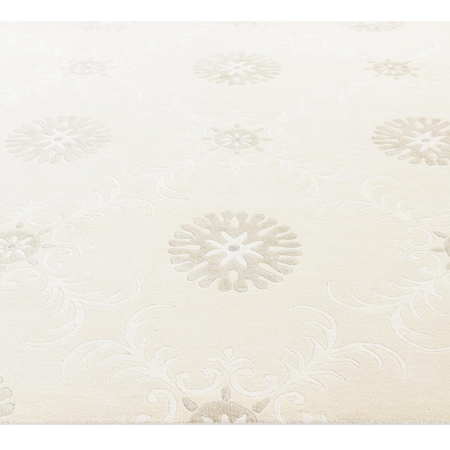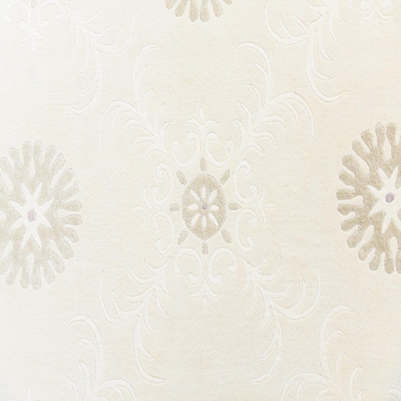 A soft light beige ground lays the foundation for a quietly detailed pattern of circular medallions and scrolling damask motifs. The round motifs in warm beige and ivory sit evenly across the field, with subtle olive accents that bring a gentle, organic touch to the palette. The pattern is rendered with tone-on-tone contrast and a slightly raised pile so you can feel the motif under your fingers; the surface has a plush, velvety hand typical of high-quality wool, while the low-to-medium pile keeps the texture refined rather than heavy.