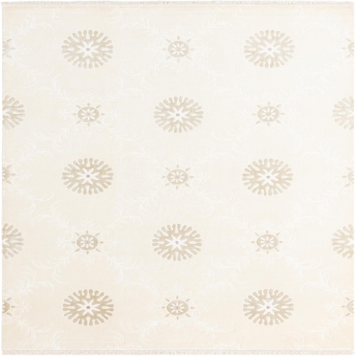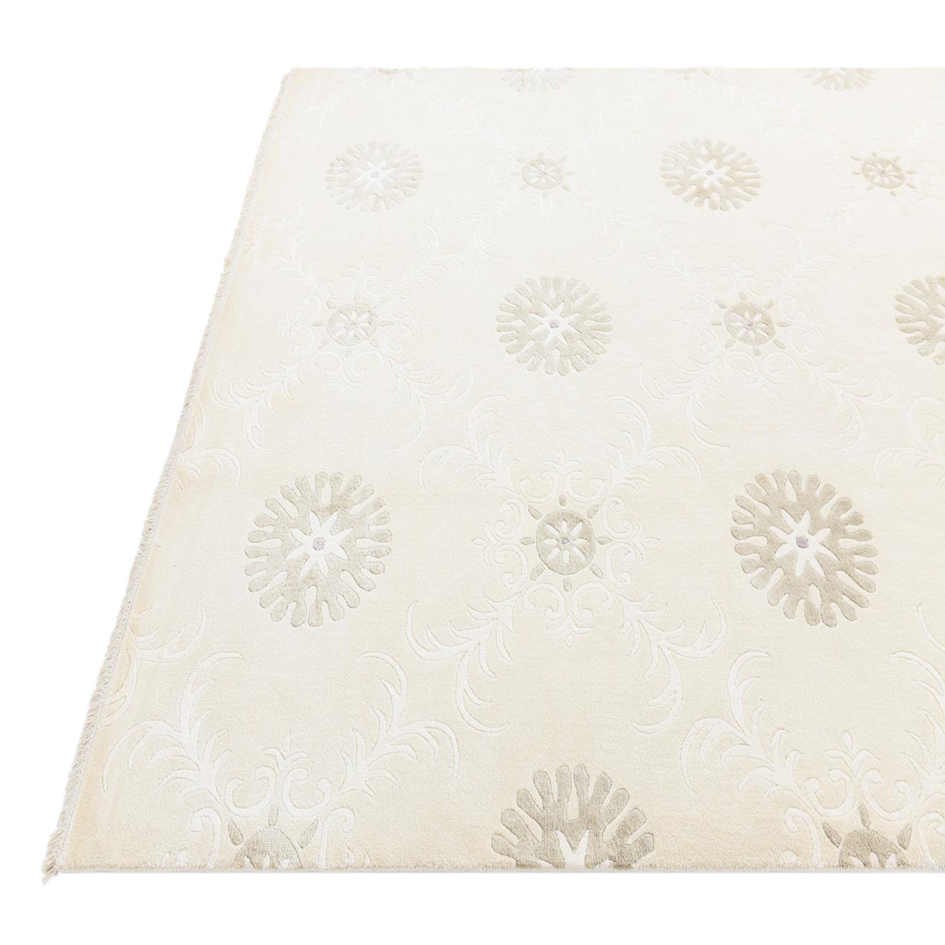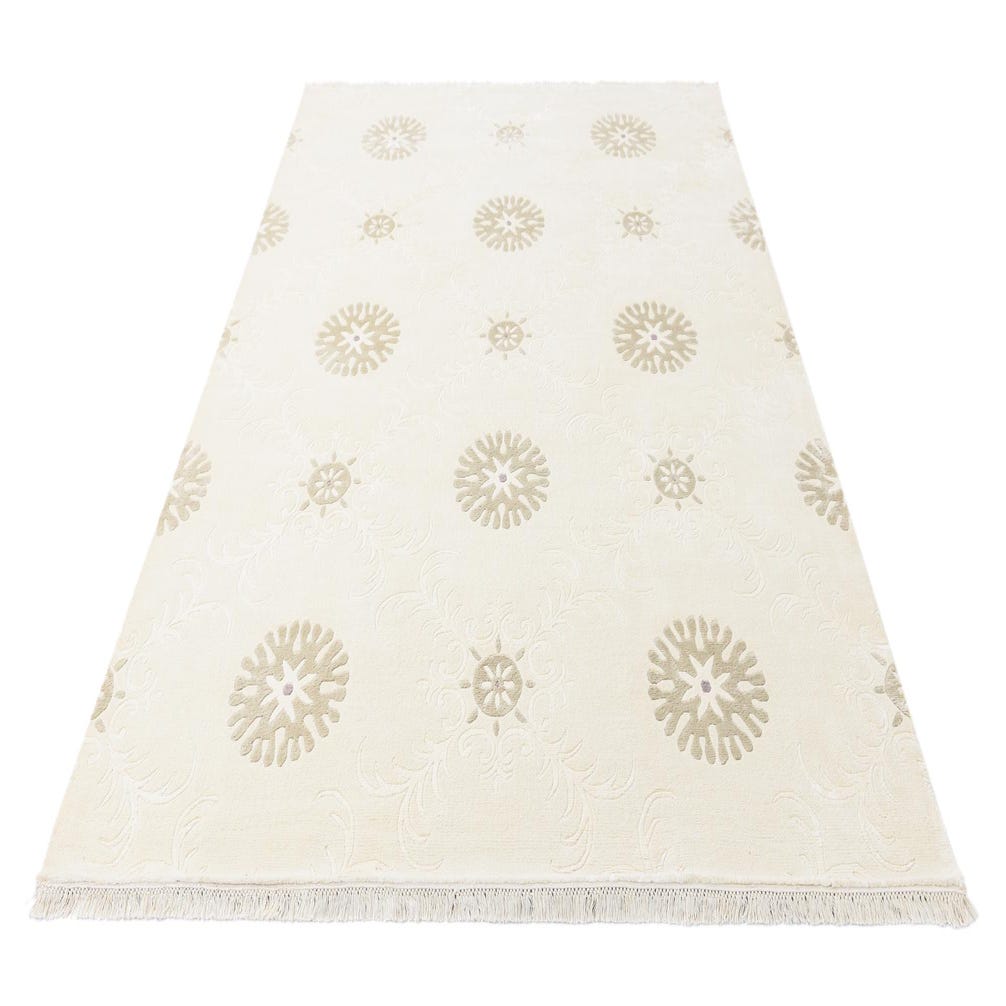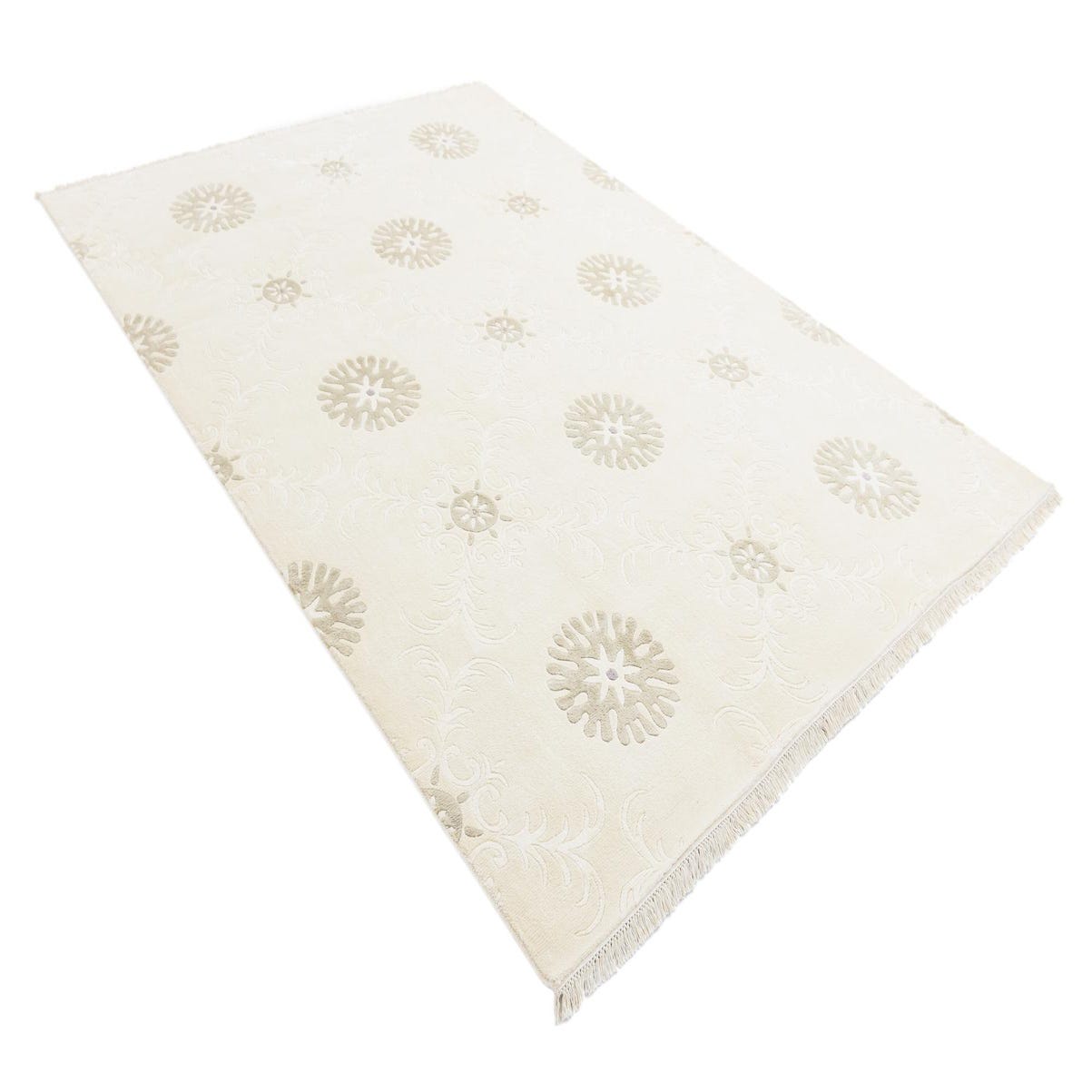 A soft light beige ground lays the foundation for a quietly detailed pattern of circular medallions and scrolling damask motifs. The round motifs in warm beige and ivory sit evenly across the field, with subtle olive accents that bring a gentle, organic touch to the palette. The pattern is rendered with tone-on-tone contrast and a slightly raised pile so you can feel the motif under your fingers; the surface has a plush, velvety hand typical of high-quality wool, while the low-to-medium pile keeps the texture refined rather than heavy.