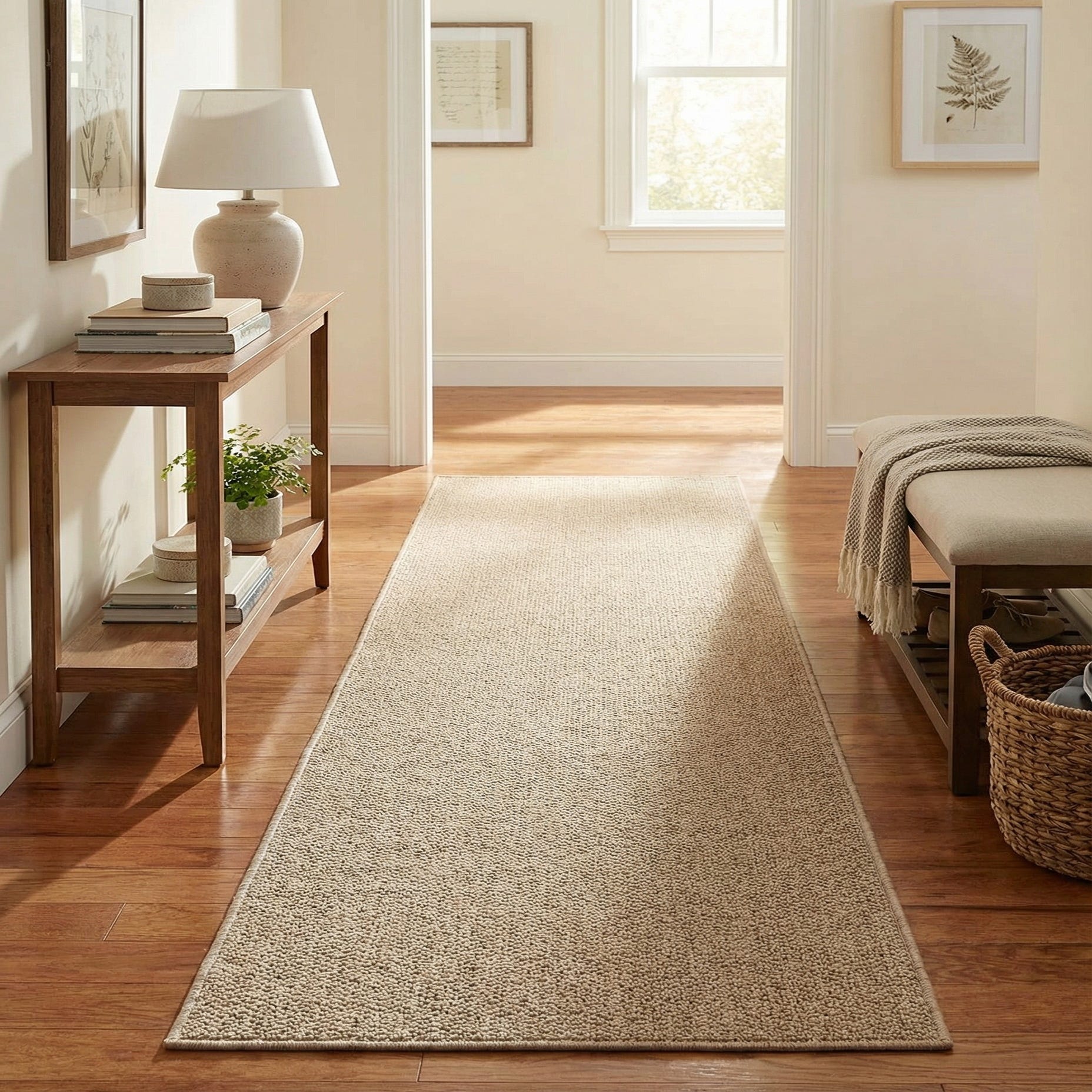 An 8 ft runner rug in a solid ivory/cream color with a flat, textured pile, suitable for hallways or patios.