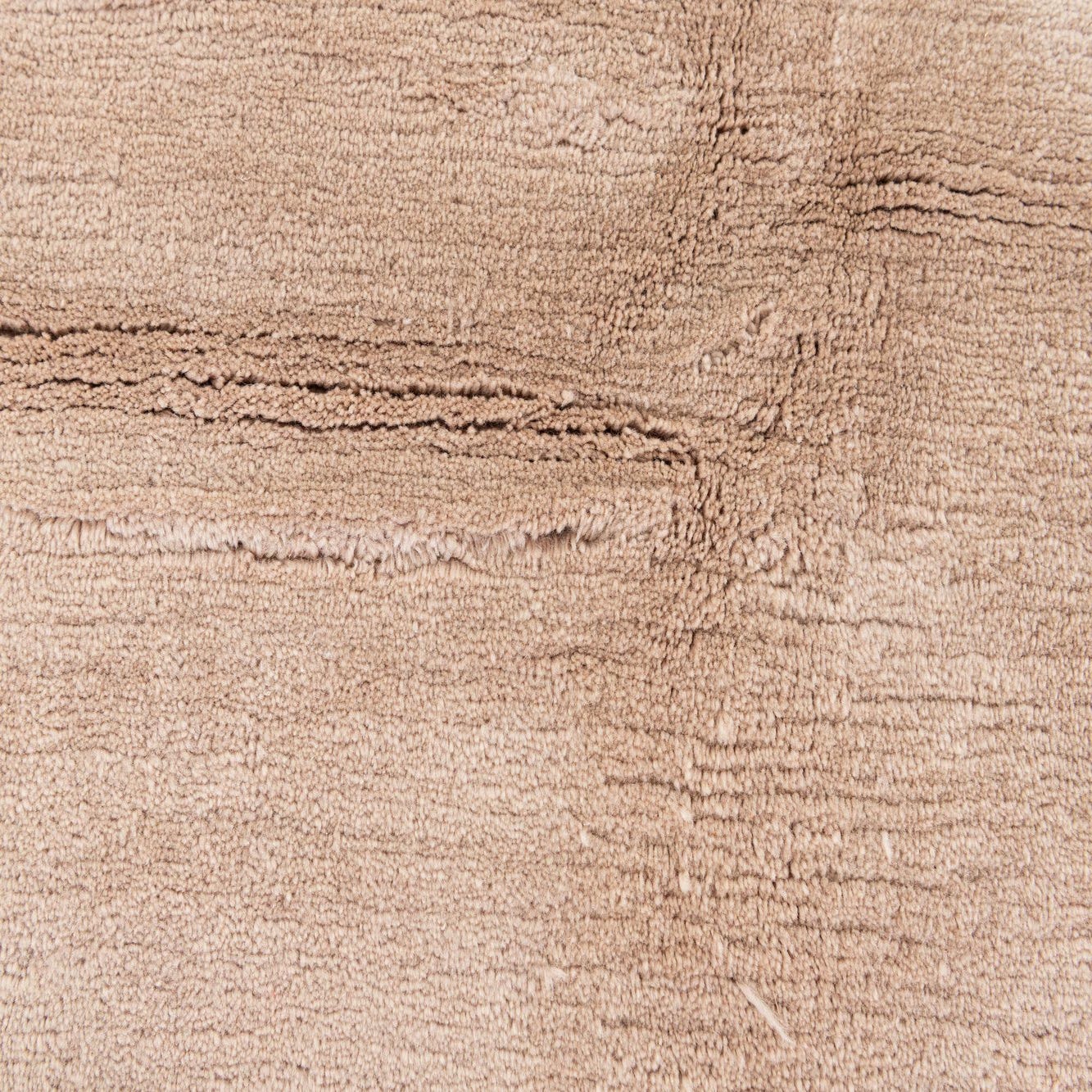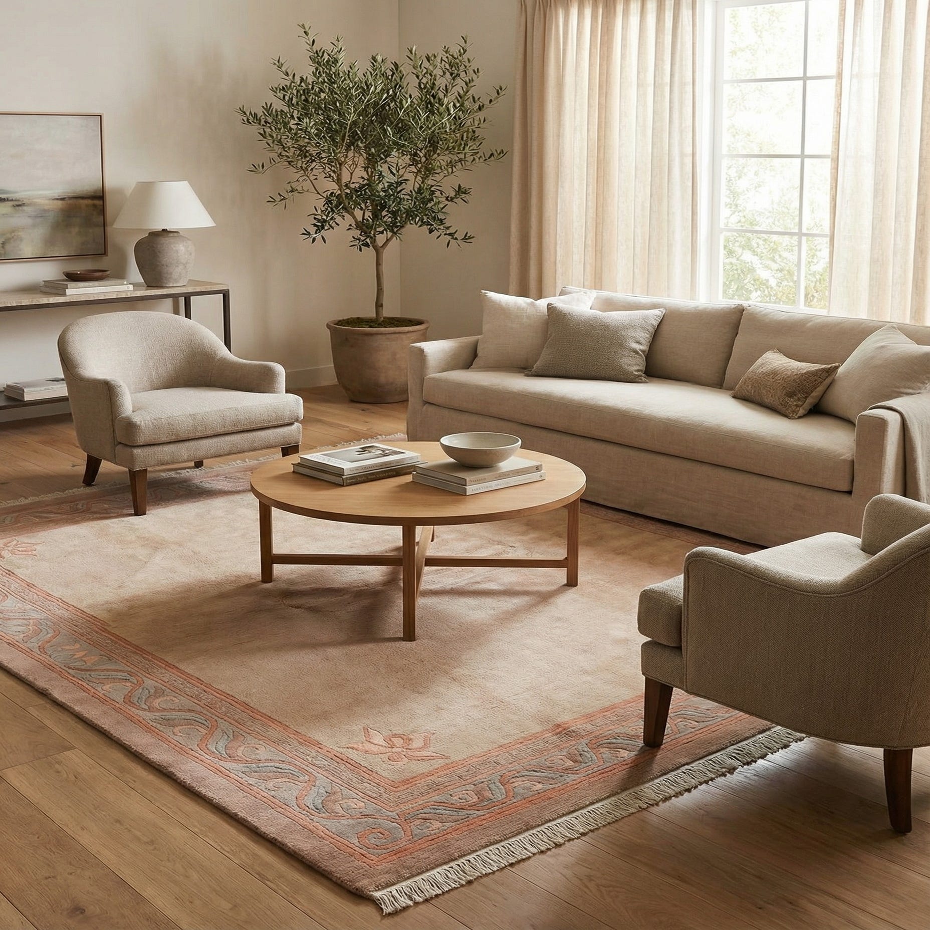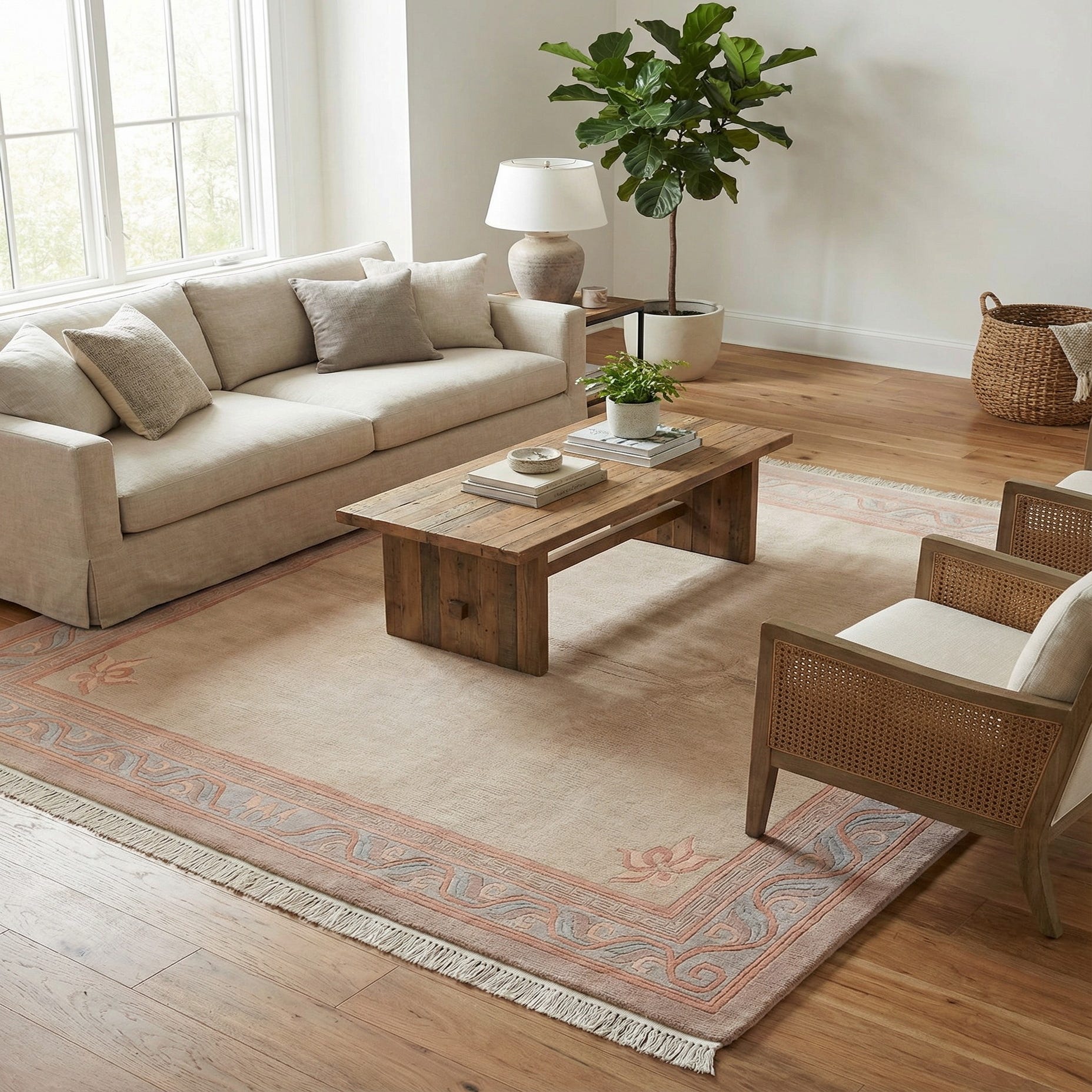 This rug pairs naturally with calm, understated interiors — think pale wood floors, linen upholstery, and muted accent pillows in blush or powder blue. It complements both modern minimal and transitional schemes, bringing a warm neutral base for a living room seating area or a tranquil anchor for a bedroom. It also works well in a formal dining room when combined with light-toned furniture and soft metallic accents for a refined, cohesive look.